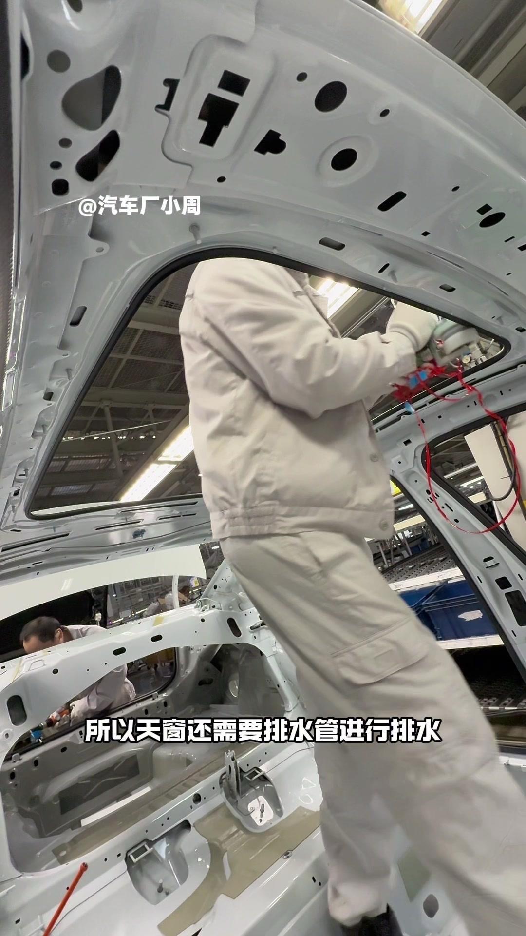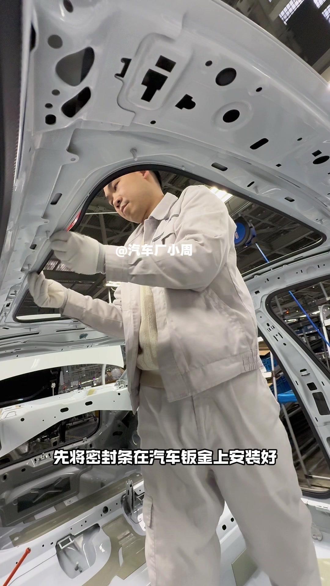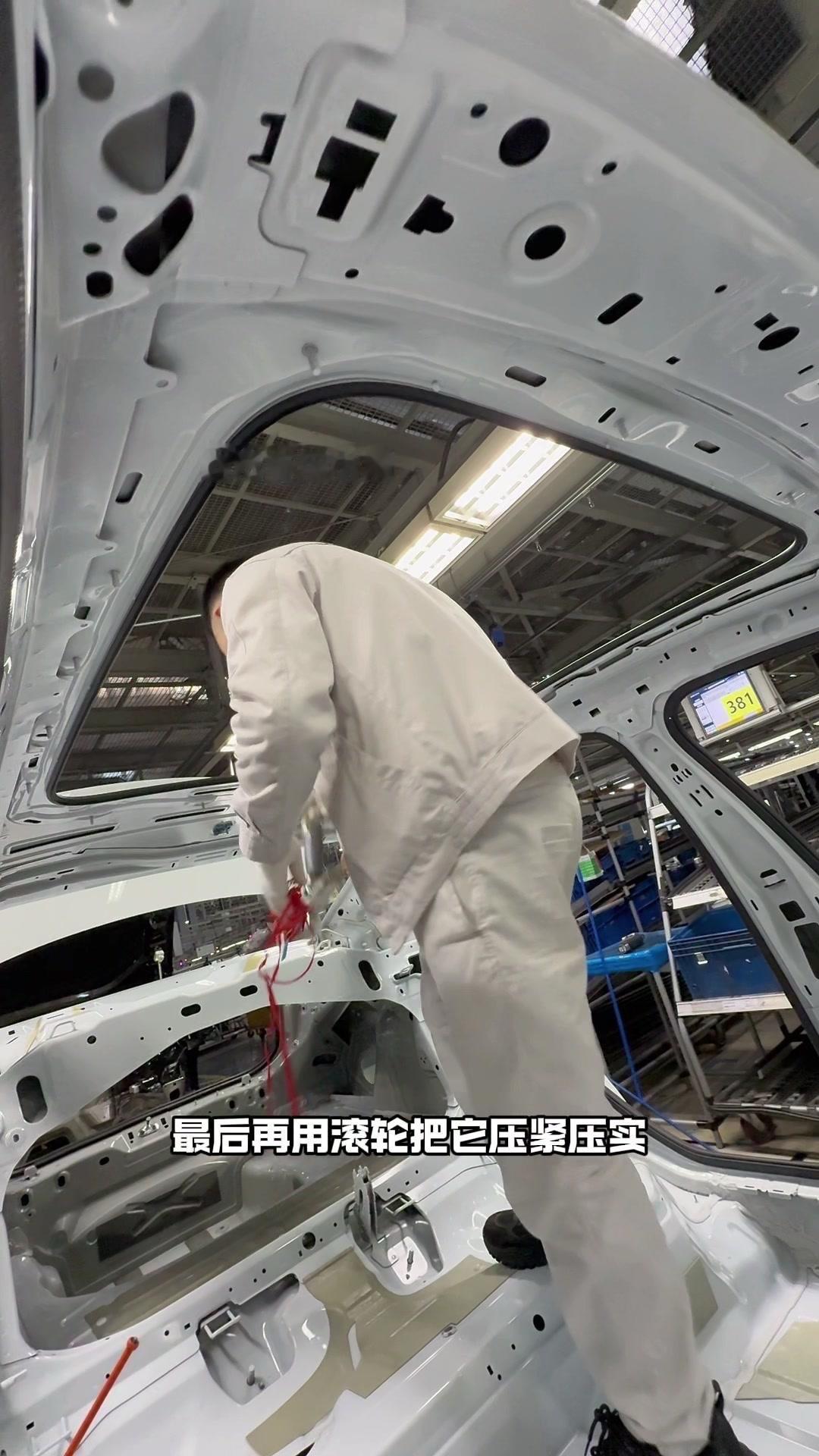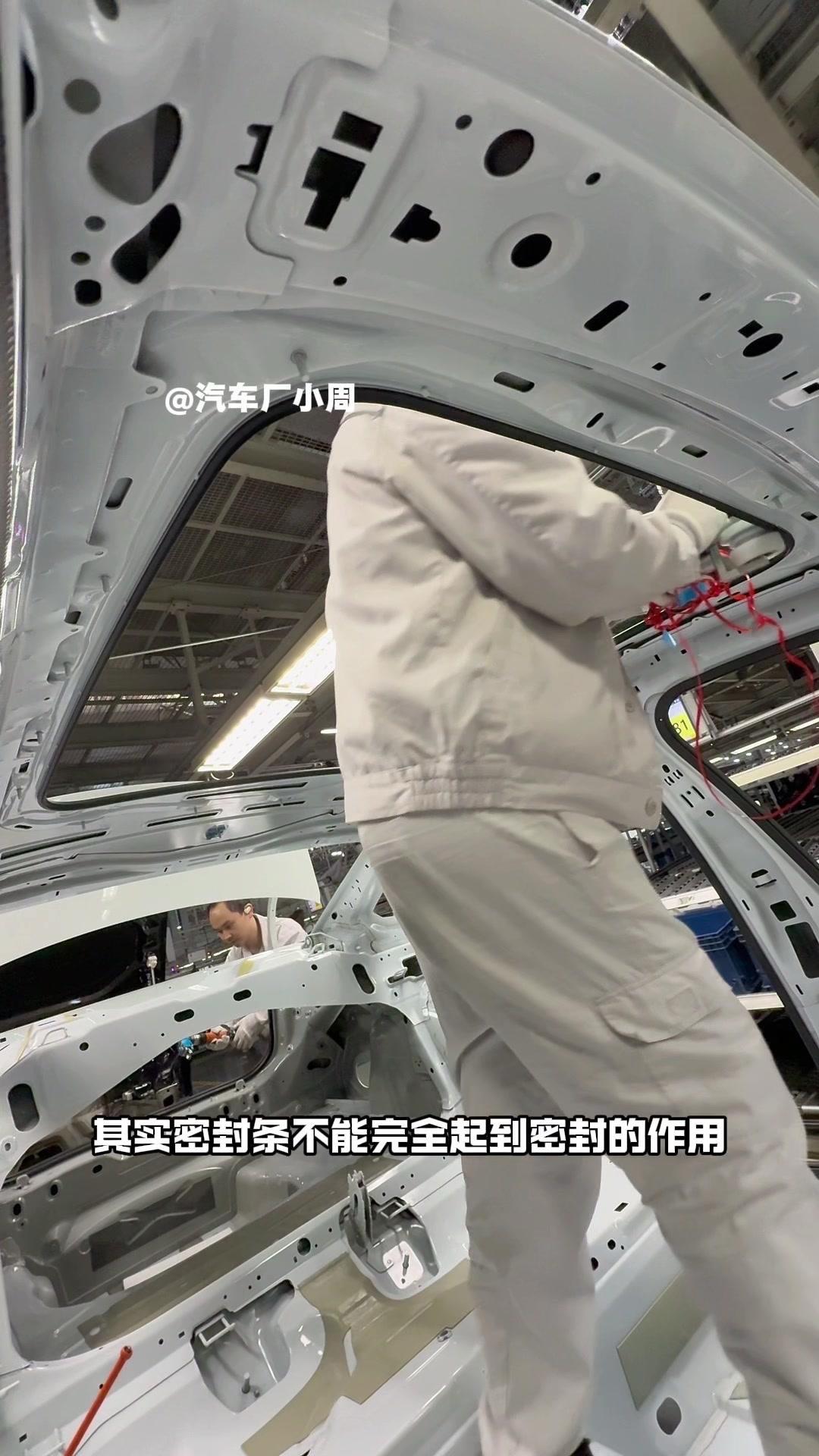 油漆车身到总装车间,第一步把前盖支撑起来,两侧安装两个密封条,起到减震作用。打开后盖安装弹簧和液压支杆,按开关即可自动开,很方便。粘贴尾部标识用进口3M胶,温度控制在30度,滚轮压紧压实,这样车开报废都不掉。 前盖隔热棉别误会是隔音棉,它能防止发动机高温烤黄油漆,发动机和前盖有距离就不用担心变色。车门拆卸是为了方便装配内部零件,避免车门划伤,提升良品率,拆卸后运到分装线装配,再合装到车上。 安装门洞密封条起到密封防水作用,里面是铝条没胶水,用夹紧机夹紧后很难扯掉,这也是外面维修密封条易掉的原因。安装锁扣时先松一颗螺丝,用电枪打到力矩后再拧紧,后盖还需两个螺丝,不然关不上。 电枪虽普通但每月校准力矩,尾部天线负责收音机、导航GPS信号。天窗密封条先装在钣金上,撕红色胶带让3M胶接触,滚轮压实,还得靠排水管排水。汽车进气口和后保险杠泄压口形成空气循环闭环。 雕刻钢架号要确保清晰,拓印两个并贴照片,上牌不用再拓印拍照,用透明胶带密封防生锈。天窗排水管是一体管无二次连接,漏水都难。油管黑色是供油管,白色是供气管,连接碳管。 安全气囊控制器接收碰撞信号,引爆气囊并记录行驶数据。安装天窗用气动设备转移固定,17颗螺丝紧固。主线束展开超100米,岗位辛苦但有序。保险盒、线束整理到位,前部隔音棉有泡沫隔音和防火层,底漆让风挡胶附着力更好。电子真空泵替代传统部件流行开来,油门刹车踏板预紧后连接线束,用专用拧紧机紧固并上传数据15年,进入仪表等安装环节。