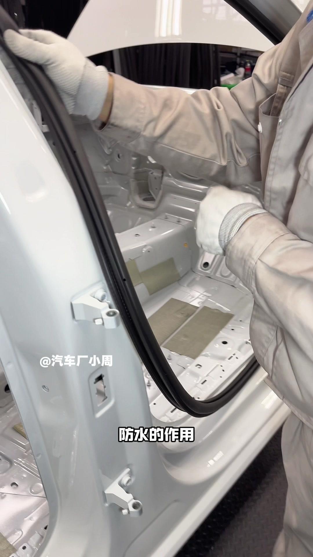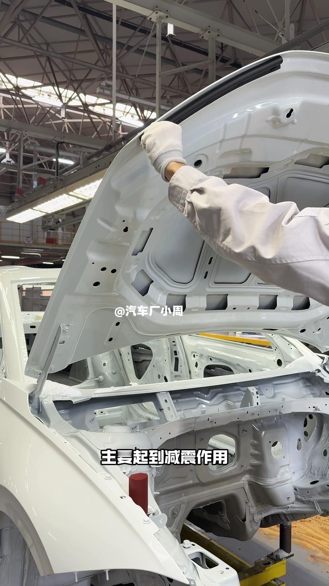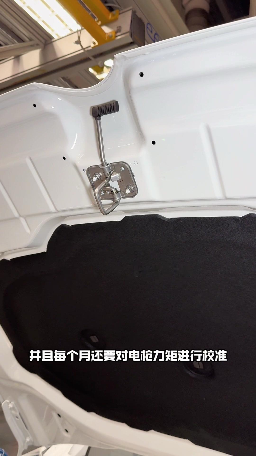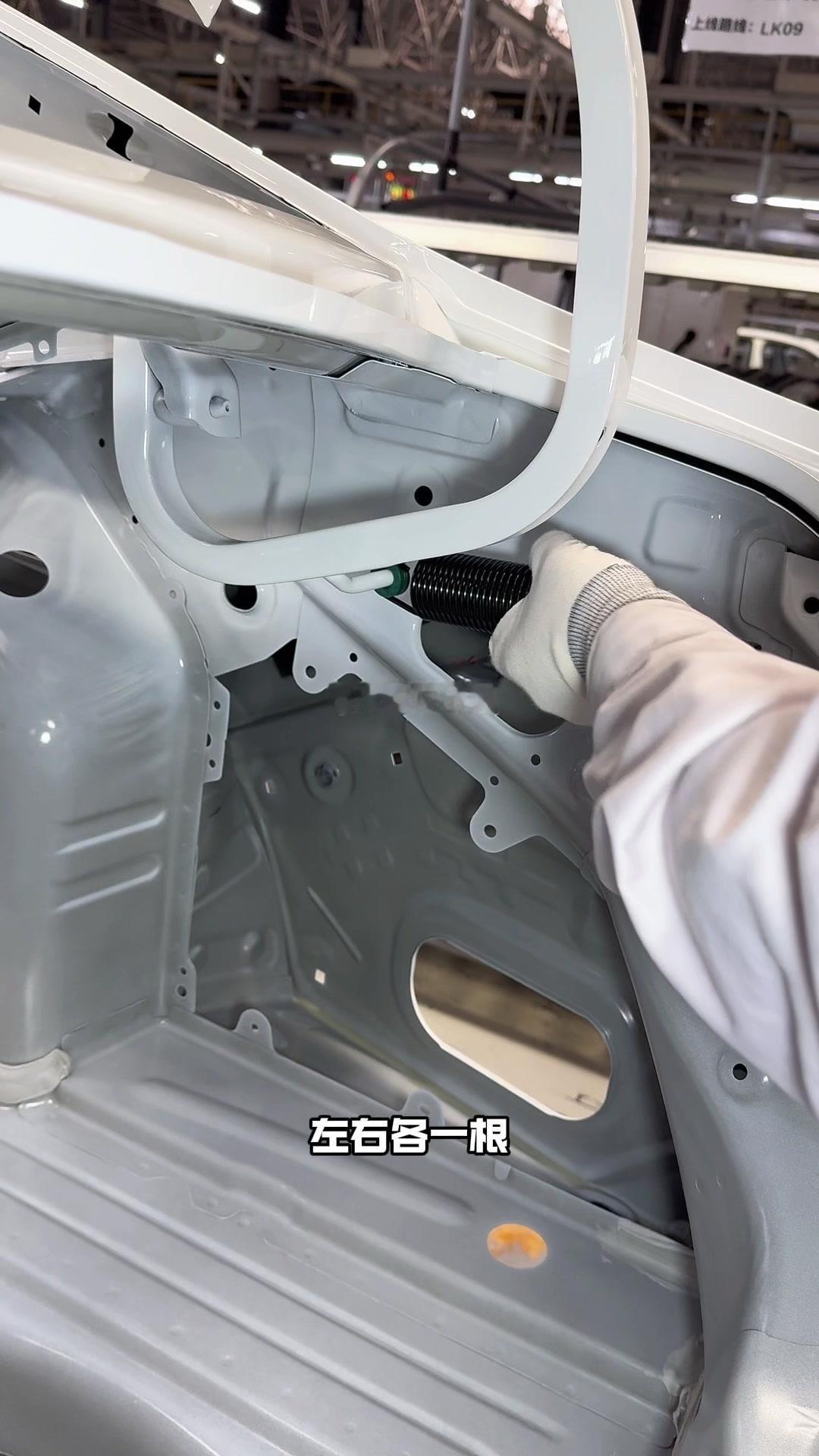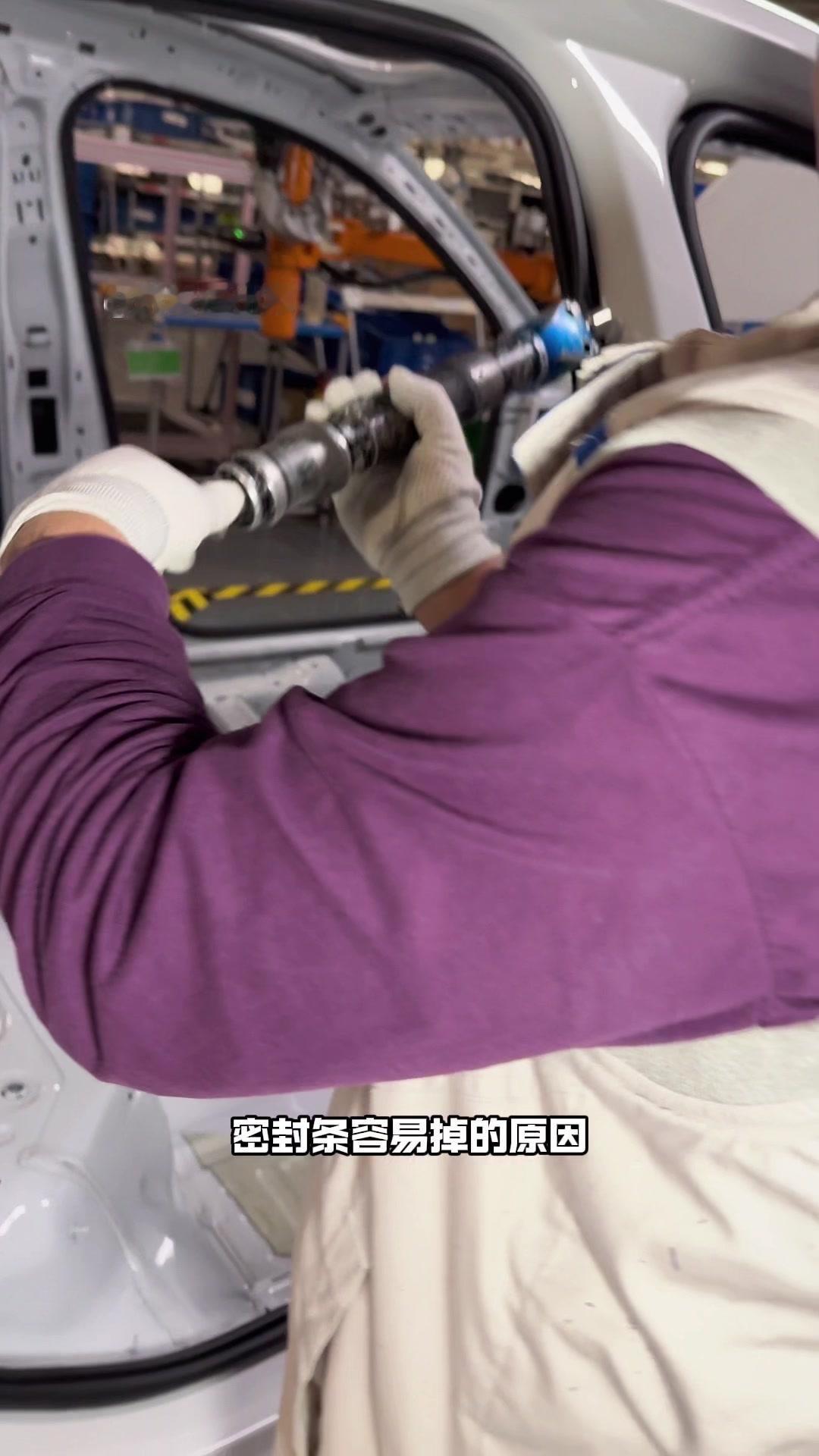 油漆车身到总装车间,第一步把前盖支撑起来,两侧安装两个密封条,起到减震作用。打开后盖安装弹簧和液压支杆,按开关即可自动开,很方便。粘贴尾部标识用进口3M胶,温度控制在30度,滚轮压紧压实,这样车开报废都不掉。 前盖隔热棉别误会是隔音棉,它能防止发动机高温烤黄油漆,发动机和前盖有距离就不用担心变色。车门拆卸是为了方便装配内部零件,避免车门划伤,提升良品率,拆卸后运到分装线装配,再合装到车上。 安装门洞密封条起到密封防水作用,里面是铝条没胶水,用夹紧机夹紧后很难扯掉,这也是外面维修密封条易掉的原因。安装锁扣时先松一颗螺丝,用电枪打到力矩后再拧紧,后盖还需两个螺丝,不然关不上。 电枪虽普通但每月校准力矩,尾部天线负责收音机、导航GPS信号。天窗密封条先装在钣金上,撕红色胶带让3M胶接触,滚轮压实,还得靠排水管排水。汽车进气口和后保险杠泄压口形成空气循环闭环。 雕刻钢架号要确保清晰,拓印两个并贴照片,上牌不用再拓印拍照,用透明胶带密封防生锈。天窗排水管是一体管无二次连接,漏水都难。油管黑色是供油管,白色是供气管,连接碳管。 安全气囊控制器接收碰撞信号,引爆气囊并记录行驶数据。安装天窗用气动设备转移固定,17颗螺丝紧固。主线束展开超100米,岗位辛苦但有序。保险盒、线束整理到位,前部隔音棉有泡沫隔音和防火层,底漆让风挡胶附着力更好。电子真空泵替代传统部件流行开来,油门刹车踏板预紧后连接线束,用专用拧紧机紧固并上传数据15年,进入仪表等安装环节。