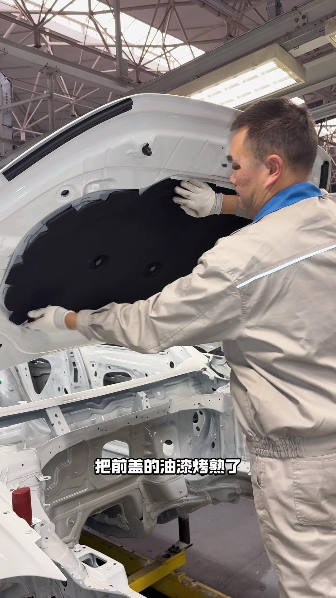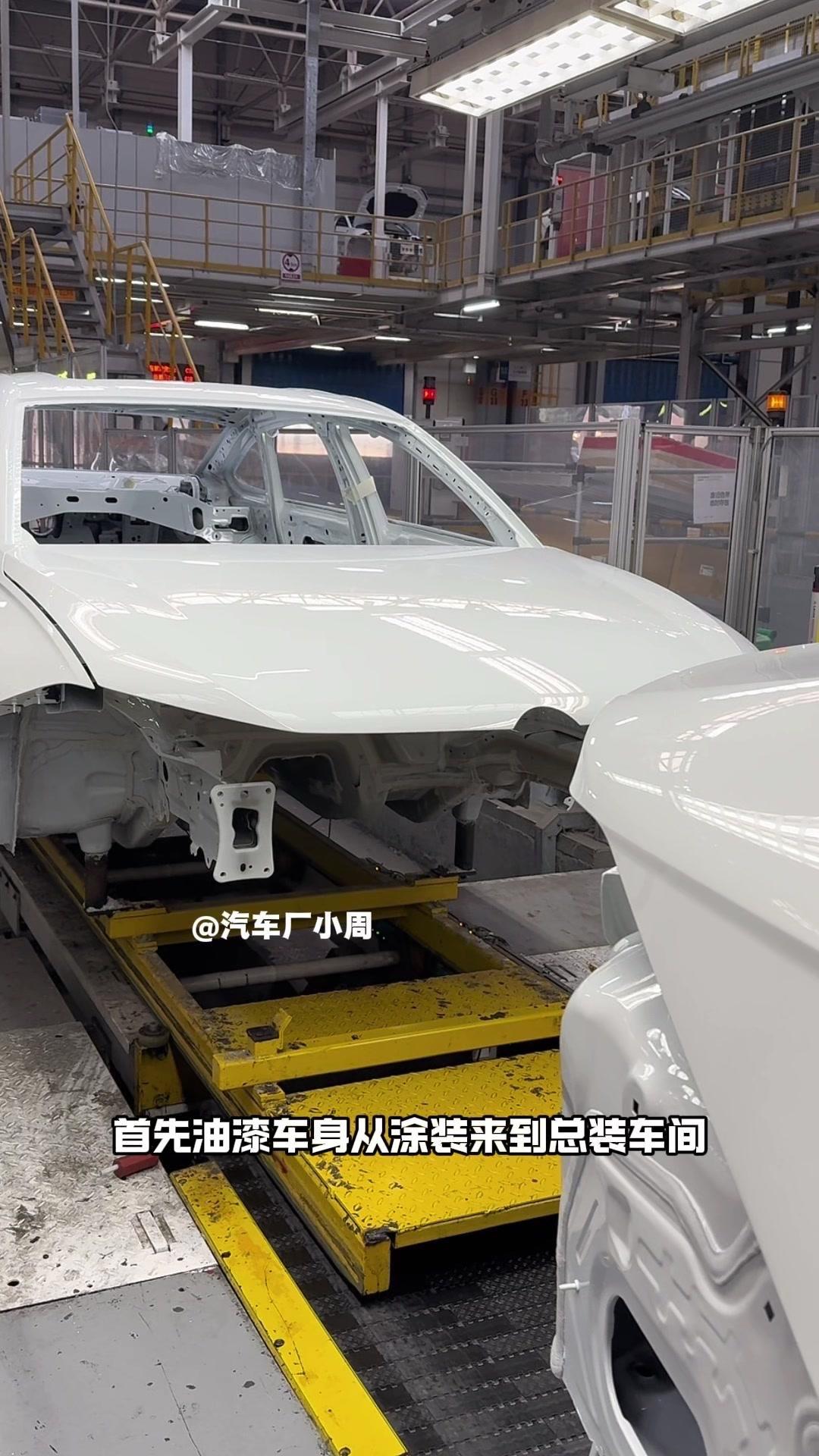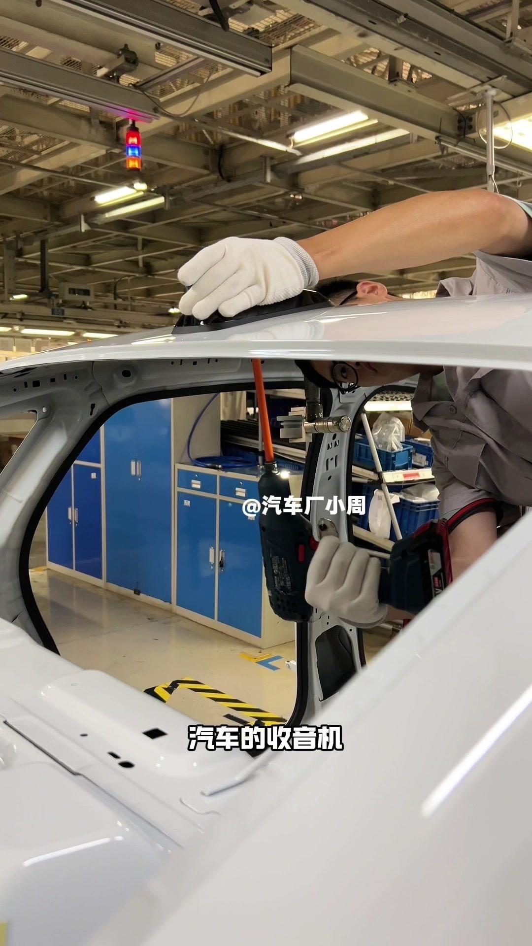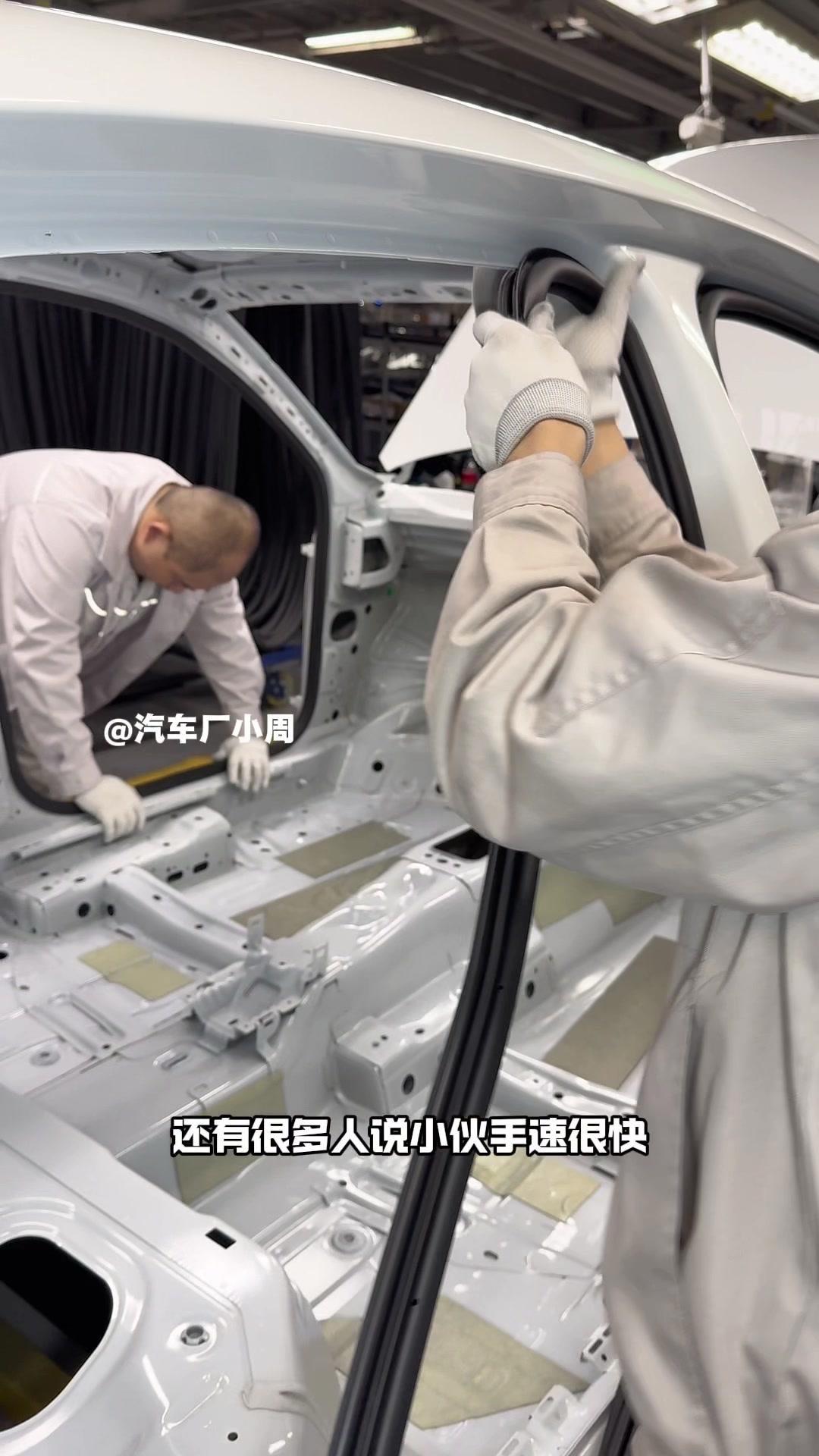 油漆车身到总装车间,第一步把前盖支撑起来,两侧安装两个密封条,起到减震作用。打开后盖安装弹簧和液压支杆,按开关即可自动开,很方便。粘贴尾部标识用进口3M胶,温度控制在30度,滚轮压紧压实,这样车开报废都不掉。 前盖隔热棉别误会是隔音棉,它能防止发动机高温烤黄油漆,发动机和前盖有距离就不用担心变色。车门拆卸是为了方便装配内部零件,避免车门划伤,提升良品率,拆卸后运到分装线装配,再合装到车上。 安装门洞密封条起到密封防水作用,里面是铝条没胶水,用夹紧机夹紧后很难扯掉,这也是外面维修密封条易掉的原因。安装锁扣时先松一颗螺丝,用电枪打到力矩后再拧紧,后盖还需两个螺丝,不然关不上。 电枪虽普通但每月校准力矩,尾部天线负责收音机、导航GPS信号。天窗密封条先装在钣金上,撕红色胶带让3M胶接触,滚轮压实,还得靠排水管排水。汽车进气口和后保险杠泄压口形成空气循环闭环。 雕刻钢架号要确保清晰,拓印两个并贴照片,上牌不用再拓印拍照,用透明胶带密封防生锈。天窗排水管是一体管无二次连接,漏水都难。油管黑色是供油管,白色是供气管,连接碳管。 安全气囊控制器接收碰撞信号,引爆气囊并记录行驶数据。安装天窗用气动设备转移固定,17颗螺丝紧固。主线束展开超100米,岗位辛苦但有序。保险盒、线束整理到位,前部隔音棉有泡沫隔音和防火层,底漆让风挡胶附着力更好。电子真空泵替代传统部件流行开来,油门刹车踏板预紧后连接线束,用专用拧紧机紧固并上传数据15年,进入仪表等安装环节。