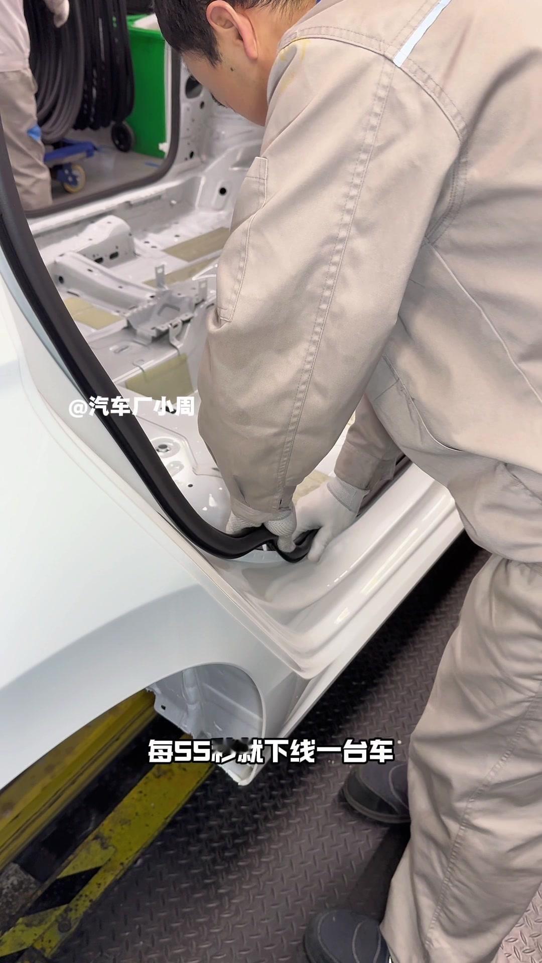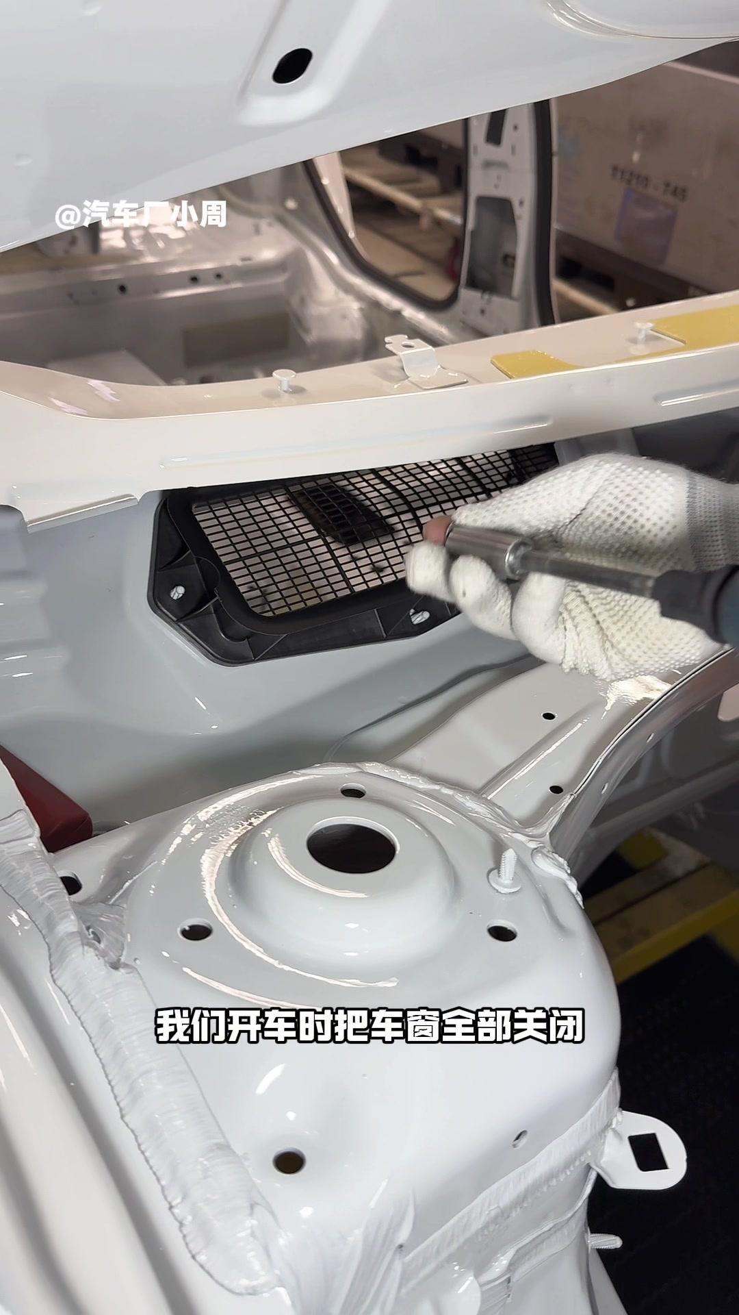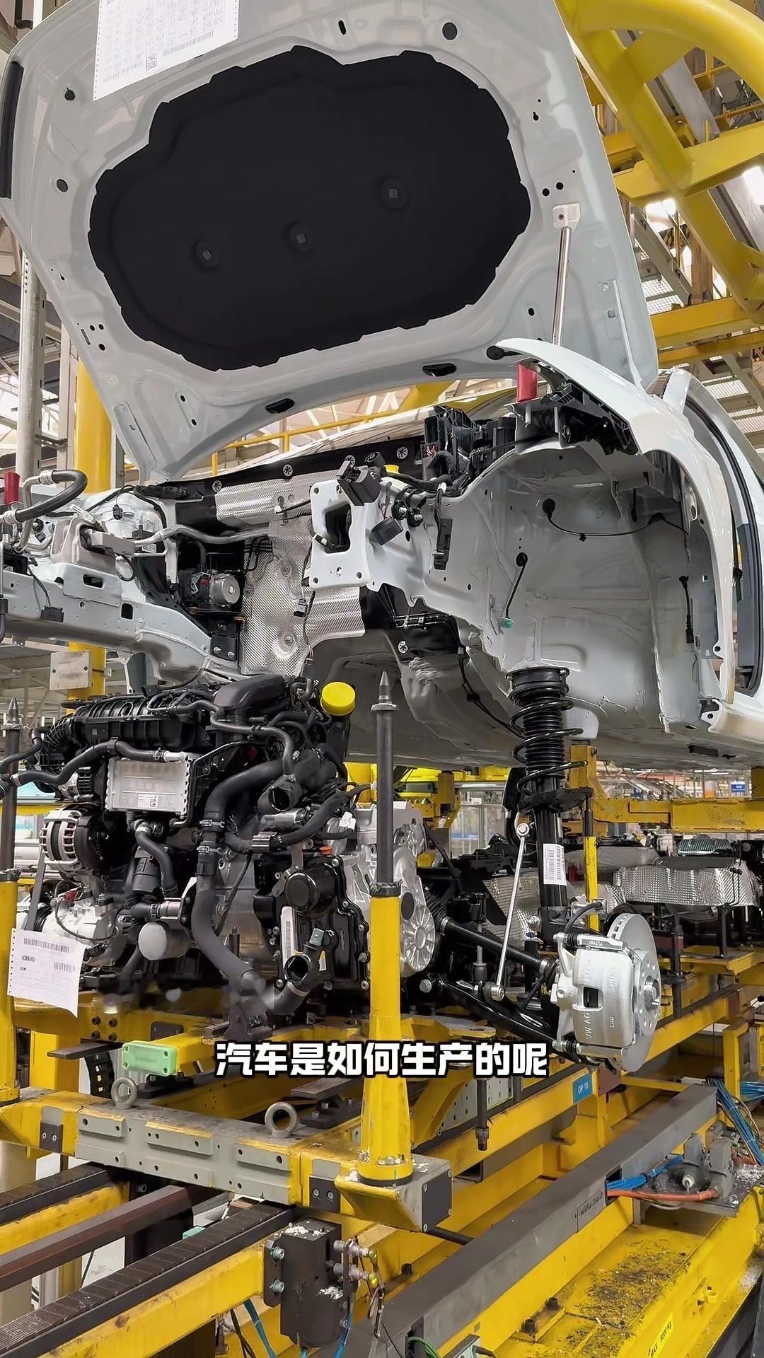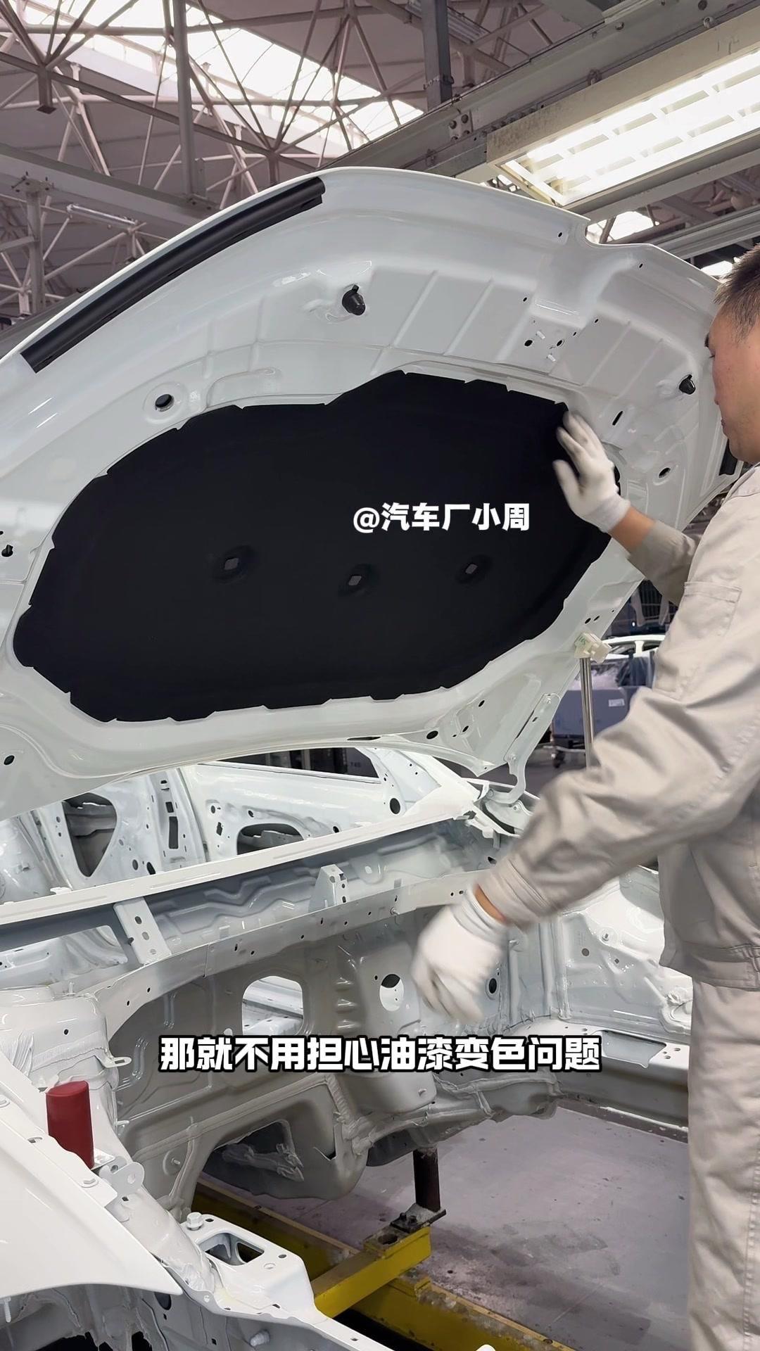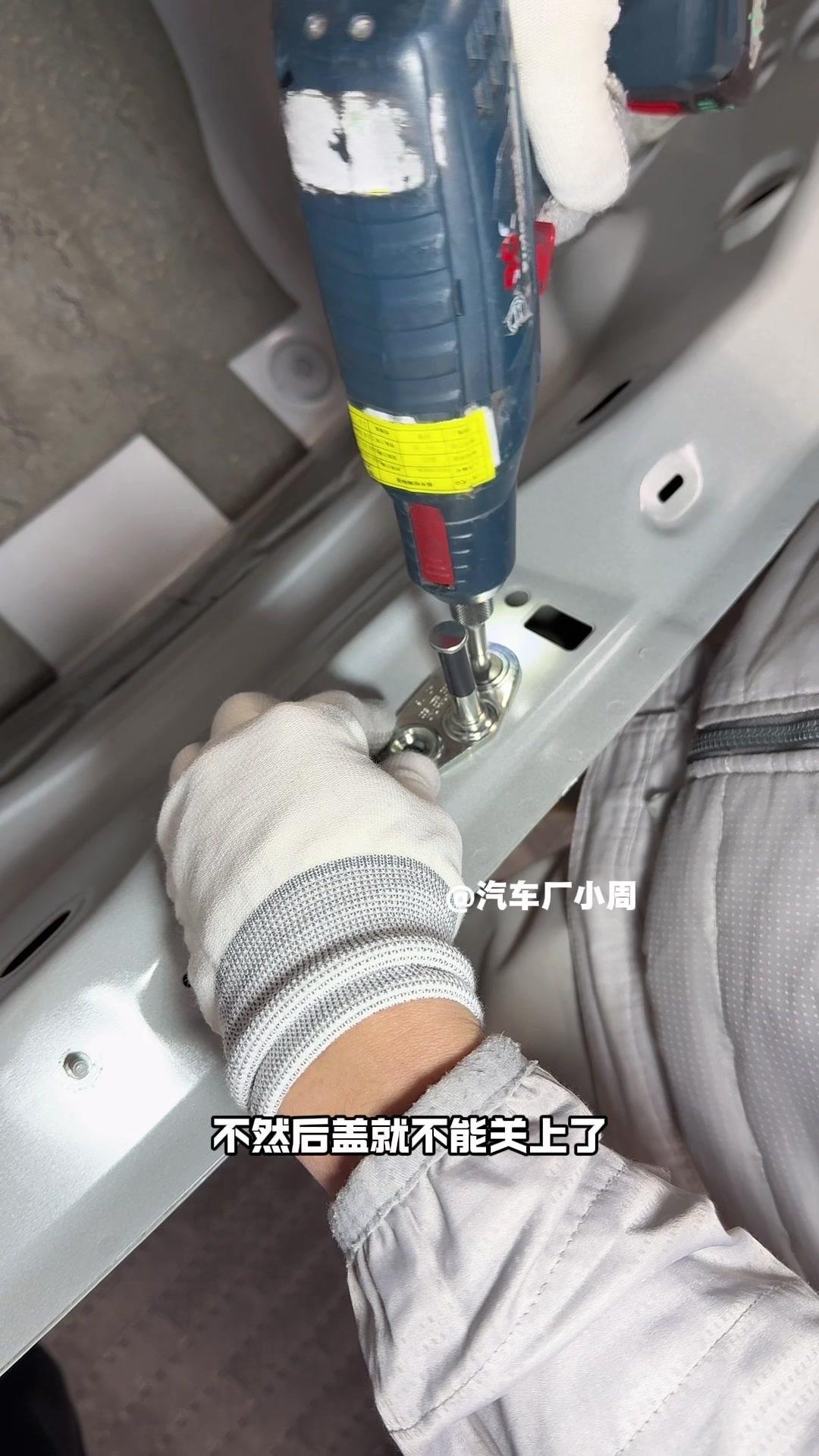 油漆车身到总装车间,第一步把前盖支撑起来,两侧安装两个密封条,起到减震作用。打开后盖安装弹簧和液压支杆,按开关即可自动开,很方便。粘贴尾部标识用进口3M胶,温度控制在30度,滚轮压紧压实,这样车开报废都不掉。 前盖隔热棉别误会是隔音棉,它能防止发动机高温烤黄油漆,发动机和前盖有距离就不用担心变色。车门拆卸是为了方便装配内部零件,避免车门划伤,提升良品率,拆卸后运到分装线装配,再合装到车上。 安装门洞密封条起到密封防水作用,里面是铝条没胶水,用夹紧机夹紧后很难扯掉,这也是外面维修密封条易掉的原因。安装锁扣时先松一颗螺丝,用电枪打到力矩后再拧紧,后盖还需两个螺丝,不然关不上。 电枪虽普通但每月校准力矩,尾部天线负责收音机、导航GPS信号。天窗密封条先装在钣金上,撕红色胶带让3M胶接触,滚轮压实,还得靠排水管排水。汽车进气口和后保险杠泄压口形成空气循环闭环。 雕刻钢架号要确保清晰,拓印两个并贴照片,上牌不用再拓印拍照,用透明胶带密封防生锈。天窗排水管是一体管无二次连接,漏水都难。油管黑色是供油管,白色是供气管,连接碳管。 安全气囊控制器接收碰撞信号,引爆气囊并记录行驶数据。安装天窗用气动设备转移固定,17颗螺丝紧固。主线束展开超100米,岗位辛苦但有序。保险盒、线束整理到位,前部隔音棉有泡沫隔音和防火层,底漆让风挡胶附着力更好。电子真空泵替代传统部件流行开来,油门刹车踏板预紧后连接线束,用专用拧紧机紧固并上传数据15年,进入仪表等安装环节。