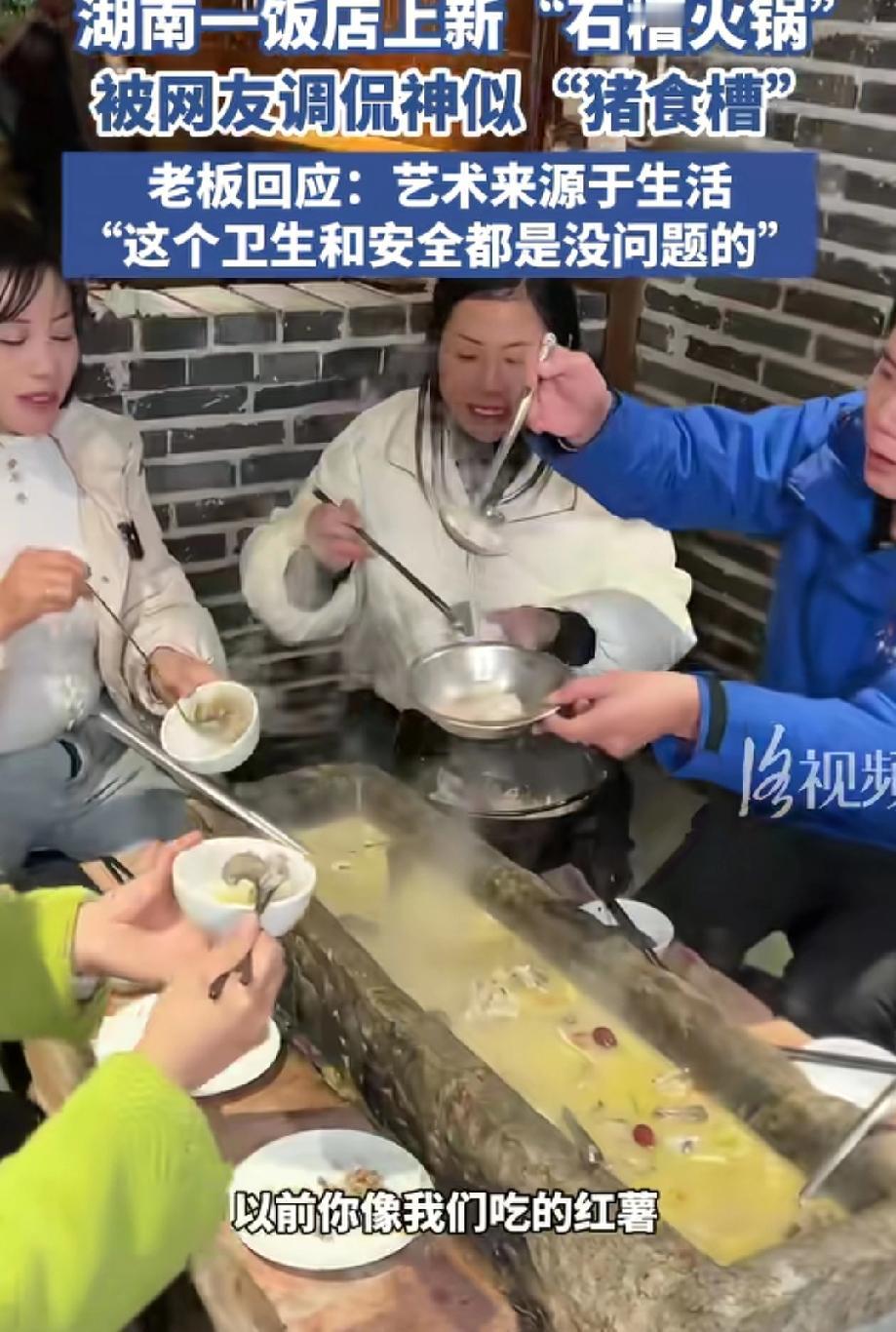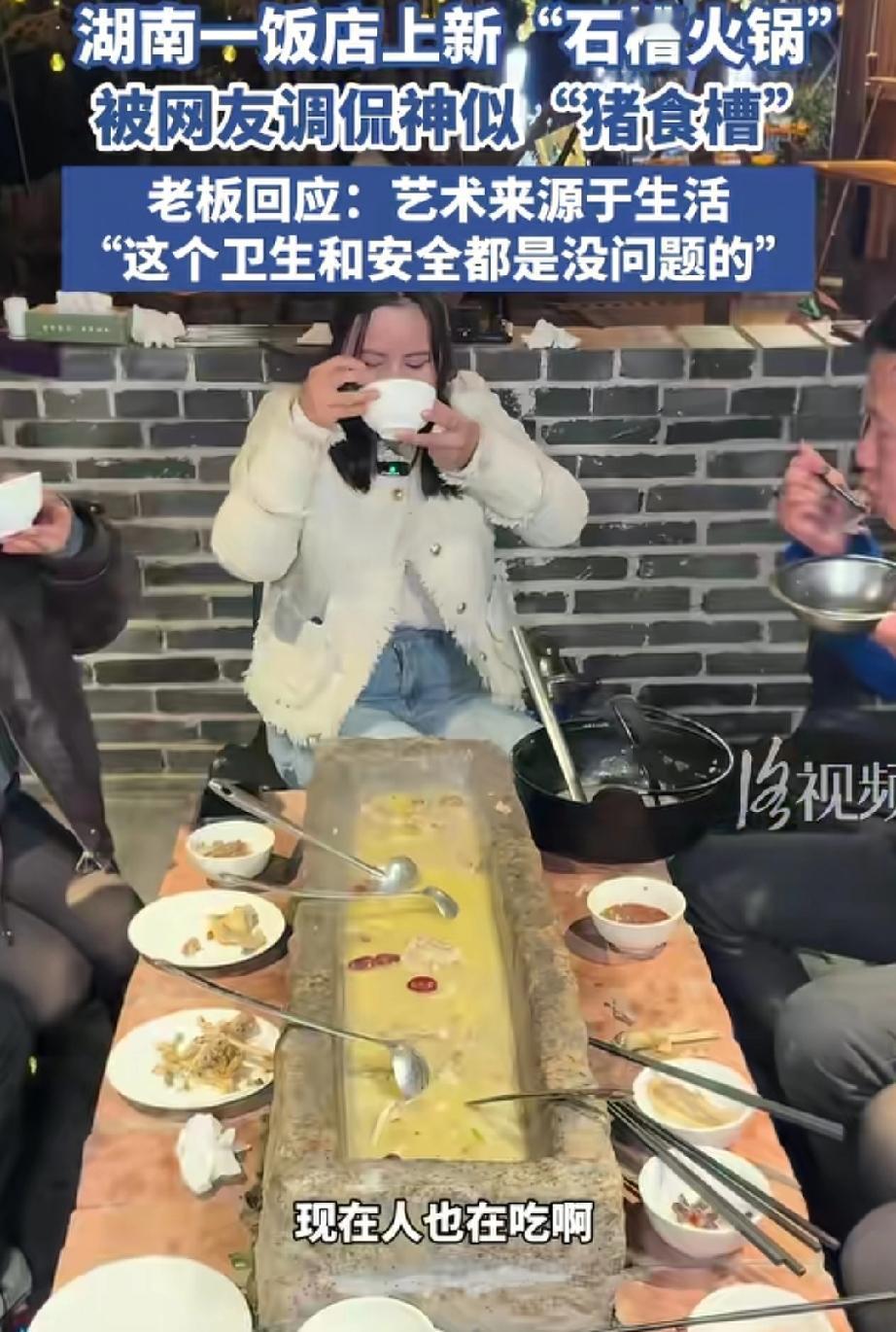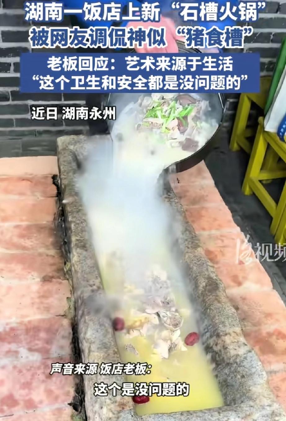 吵翻天!湖南永州,一家餐馆推出了一道“石槽火锅”,但因为餐具像极了小时候村里面喂猪的“猪槽子”引起了不少吐槽,店家解释说艺术来源于生活,而网友则表示:这不是像,这就是! 视频里,这家饭店用的火锅容器,可不是我们平常看到的圆锅或方锅,而是一个长长的、方方正正的石槽。这个石槽是用整块石头挖凿出来的,看上去就很厚重、古朴。 把各种火锅食材,像牛肉、蔬菜、丸子什么的,往这个长长的石槽里一放,那画面感马上就来了。 许多从小在农村长大,或者见过农村生活的网友,第一眼就觉得无比眼熟:“这不就是我家以前喂猪用的石槽吗? 只是里面装的东西从猪食变成了美味火锅!这种强烈的、带着泥土气息的既视感,正是它引爆网络的关键。 虽然被调侃像“猪食槽”,但店家走的是复古农家风。想用这种特别的容器,让顾客感受到一种粗犷、原始的乡土气息,体验不一样的用餐乐趣。 只不过,这“创意”和大众记忆的碰撞,产生了让人忍俊不禁的效果。 网友们脑洞大开: · “老板是个人才!下次是不是直接端个猪圈过来?” · “这吃的是情怀啊,不过是猪的情怀。” · “建议再配双筷子,哦不,配个瓢更对味儿!” · “看着这槽,我咋感觉自己也哼哼叫了呢?” 看着这些评论,我也忍不住笑了。说实在的,咱们中国人吃饭,有时候吃的就是一份热闹和趣味。这“石槽火锅”虽然造型清奇,被大家玩成了梗,但它确实成功地吸引了所有人的目光。 咱们不必太较真地去批评它“不雅”。在如今餐饮竞争这么激烈的时候,老板能想出这么个点子,胆子够大,也够有创意。 它至少让大家记住了,而且讨论得很开心。这本身不就是一种成功吗?生活需要幽默感,吃饭也一样。只要火锅味道好、卫生达标,用个有趣的容器让大家图一乐,没什么不好。 创意有时候就藏在最大胆的尝试里。哪怕这个尝试一开始看起来有点“雷人”,但只要它能触动人们的某根神经——无论是回忆还是幽默感——就可能产生意想不到的效果。 当然,创新也要把握尺度,不能为了博眼球而忽视基本的审美和舒适度。