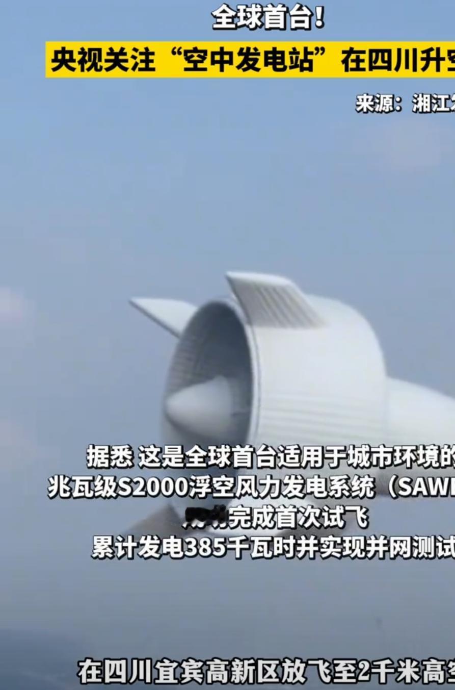 宜宾上空惊现全球首台″空中发电站",发电效率是地面27倍,来头不小! 近日,四川宜宾的天空飘来个“大家伙”,60米长、40米宽的浮空装置直冲2000米高空,市民惊呼像UFO,实则是全球首台城市空中发电站——S2000浮空风力发电系统。 老话说“巧妇难为无米之炊”,城市里地面风电又吵又占地,光伏靠天吃饭,这空中发电站偏能破局。它借充氦浮空器带发电系统上天,“站得高,发得多”,高空风速是地面3倍,发电效率达地面风机27倍,占地还不到5%,真正“不扰民生,只送光明”。 有人担心这“飞艇”高空遇险咋办?要知道“台上一分钟,台下十年功”,研发团队用2000兆帕高强钢丝做缆绳,抗12级台风,地面控制系统0.1秒响应风速变化,稳如泰山。 它年发电1000万千瓦时,省3000吨标煤,减碳堪比16万棵树,惠及千家万户。“治世不一道,便国不必法古”,国外卡脖子的技术,咱们联合高校攻克,拿下5亿订单。 虽说“万事开头难”,空域协调等问题待解,但它已开启城市绿电新篇。正如《天工开物》所言“天覆地载,物数号万,而事亦因之曲成而不遗”,中国智造正把风变成千家万户的光明。