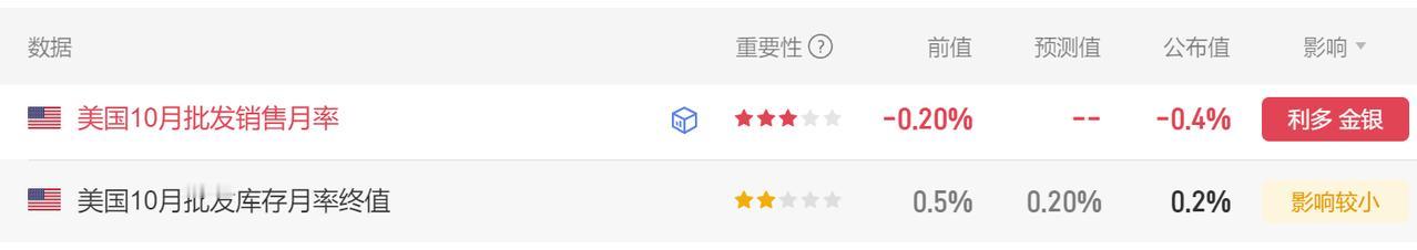 刚刚又有美国经济数据公布。 首先美国10月批发销售月率 -0.4%, 前期数值-0.20%。 其次美国10月批发库存月率终值 0.2%, 市场预期0.20%,前期数值0.5%。 这是利多的数据, 数据公布以后,金价略微有所反弹。