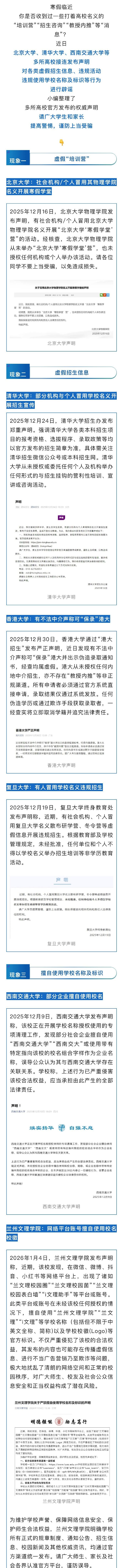 联合辟谣微博辟谣【北京大学、清华大学等多所高校发布声明】寒假临近,一些打着高校名义的“培训营”“招生咨询”等虚假信息层出不穷。近日,北京大学、清华大学、西南交通大学等多所高校接连发布声明,对各类虚假招生信息、违规活动、违规使用学校名称及标识等行为进行辟谣。请广大学生和家长提高警惕,谨防上当受骗。详戳↓↓↓(中国互联网联合辟谣平台)