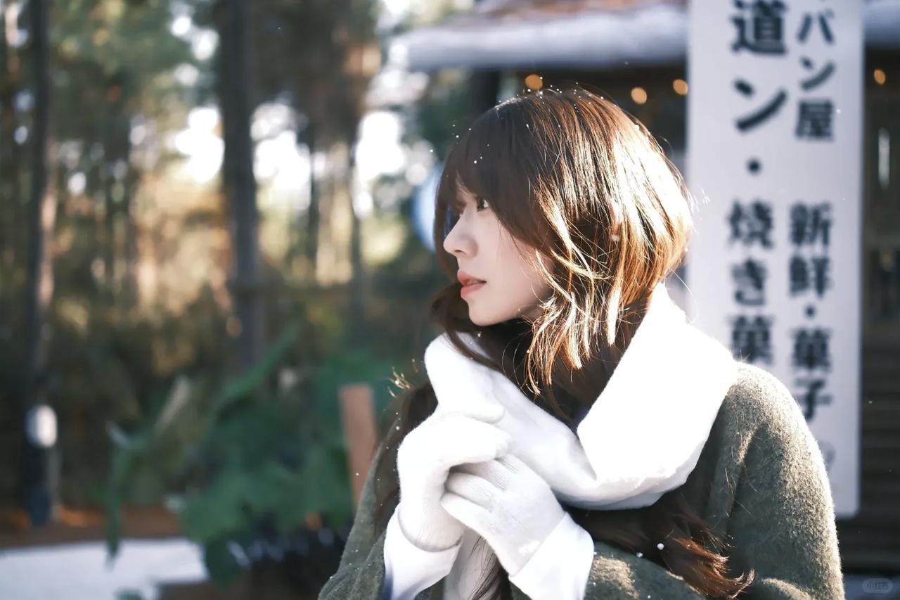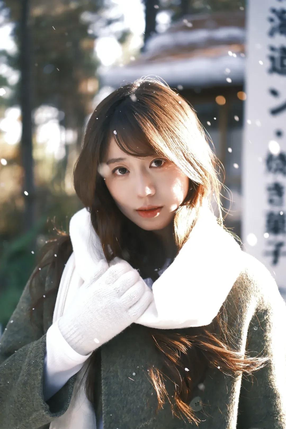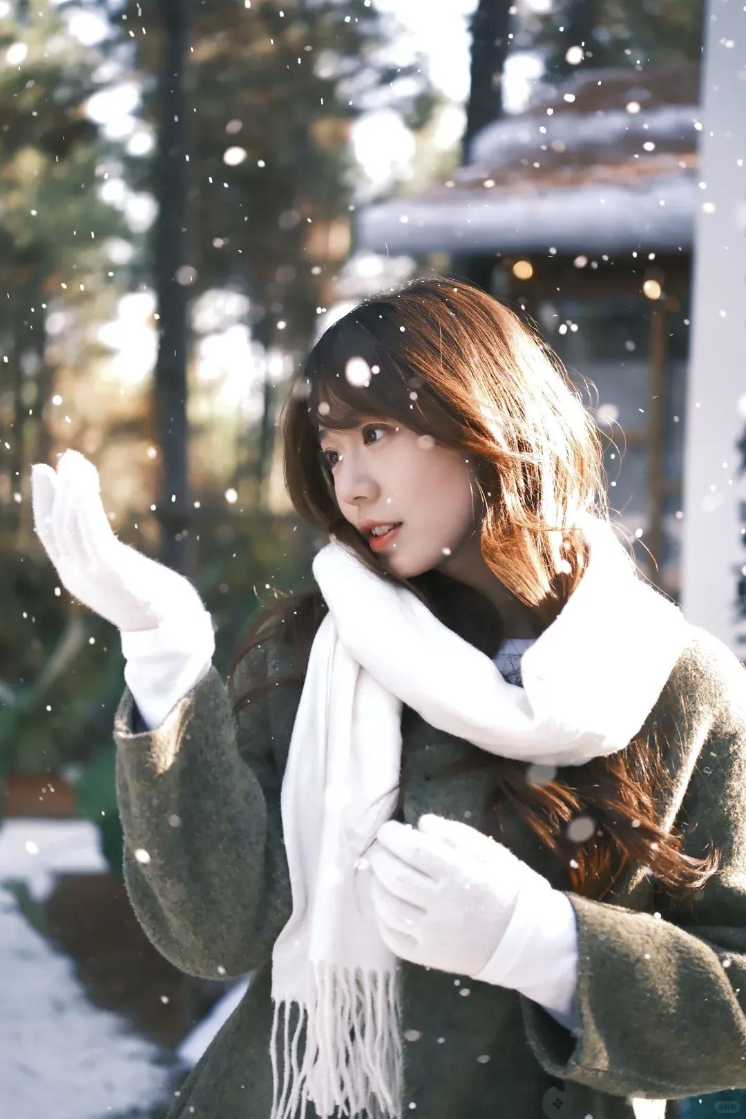 冬日穿搭,冬日写真。冬日暖阳又飘雪,少女微笑仰望,雪花飘落如梦冬日女神穿搭 雪景
