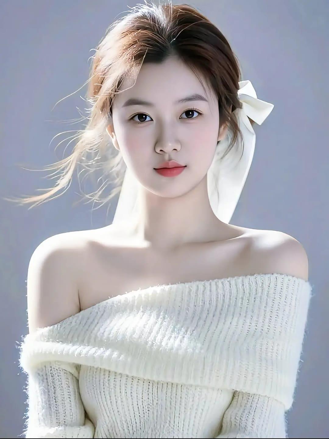 温柔甜美的少女,白色毛衣搭配蝴蝶结发饰,清新自然。