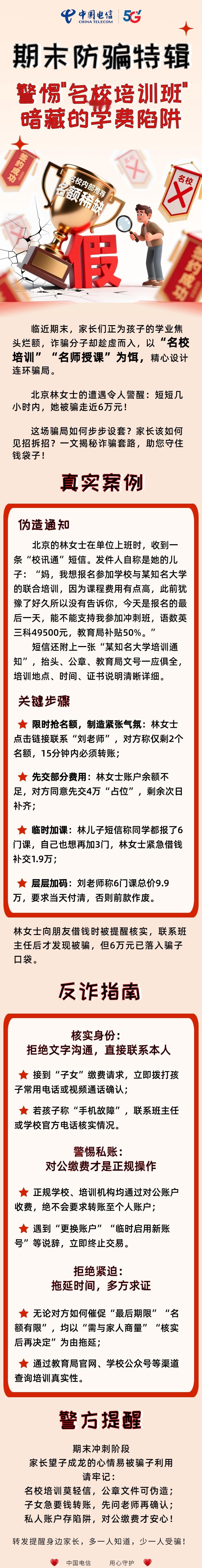 【期末防骗特辑——警惕“名校培训班”暗藏的学费陷阱!】临近期末,家长们正为孩子的学业焦头烂额,诈骗分子却以“名校培训”“名师授课”为饵,精心设计连环骗局。这场骗局如何步步设套?家长该如何见招拆招?一文揭秘诈骗套路,助您守住“钱袋子”!防范通讯信息诈骗 全民反诈 @国资小新 @央企头条 @12321受理中心