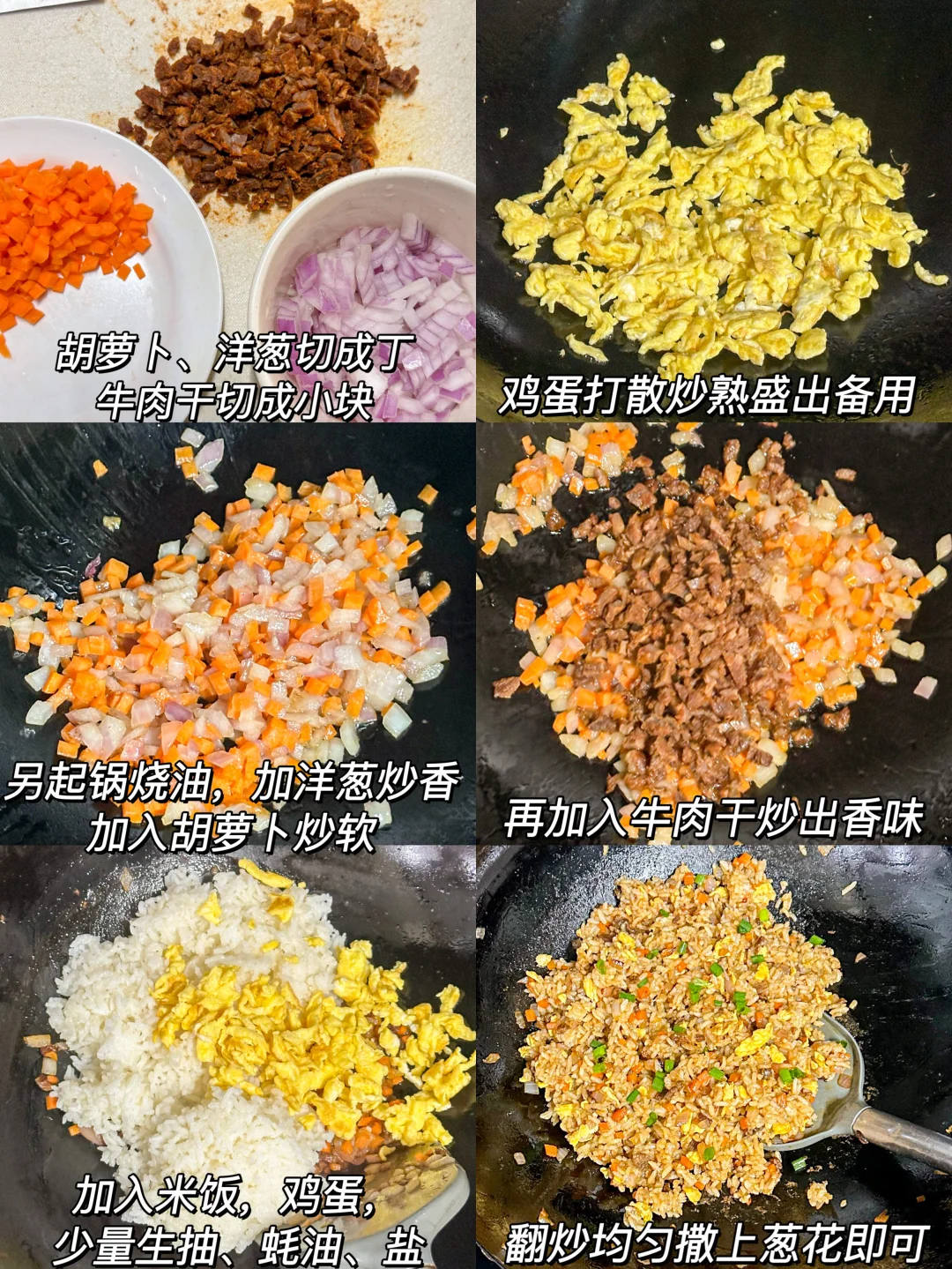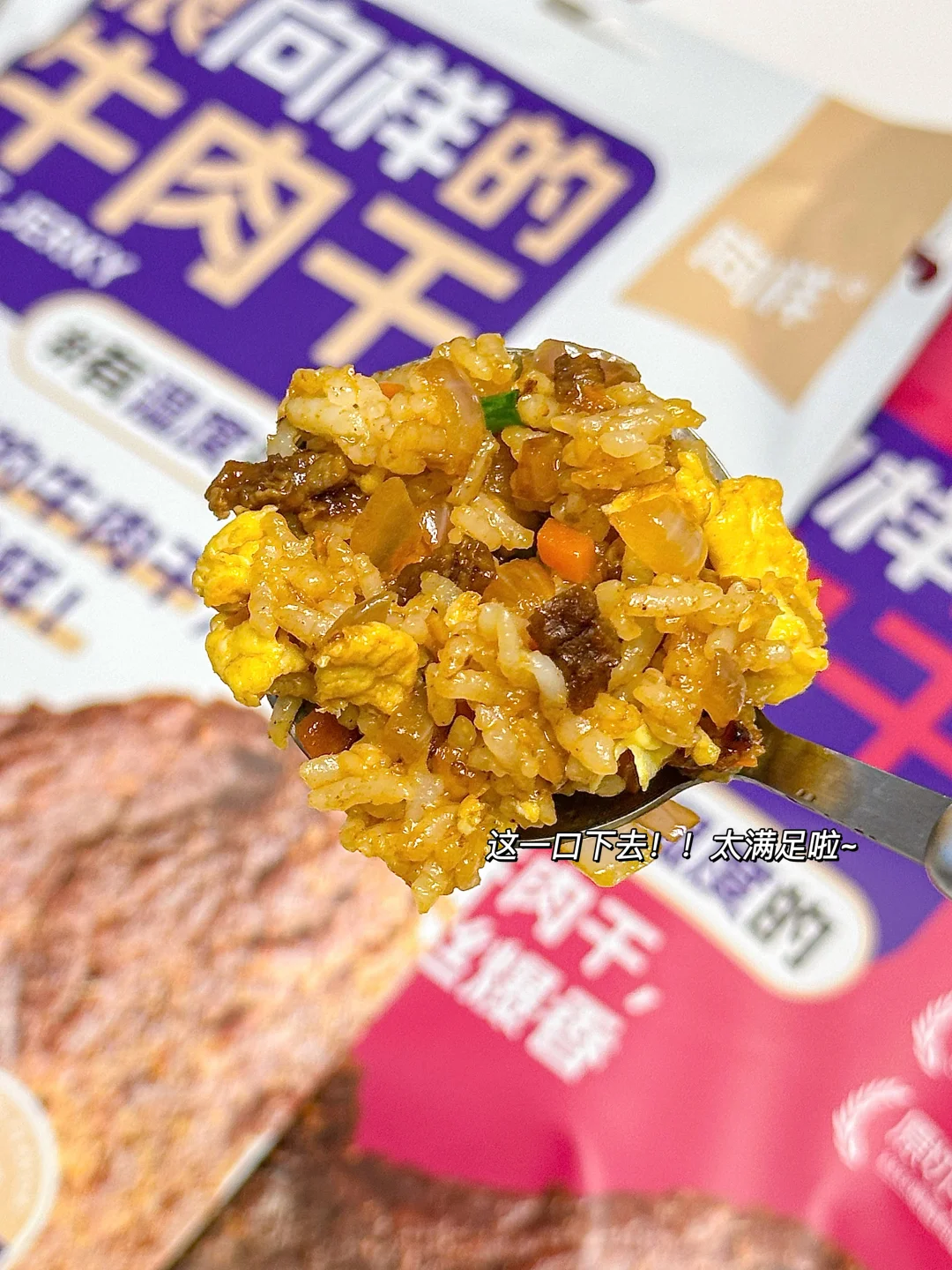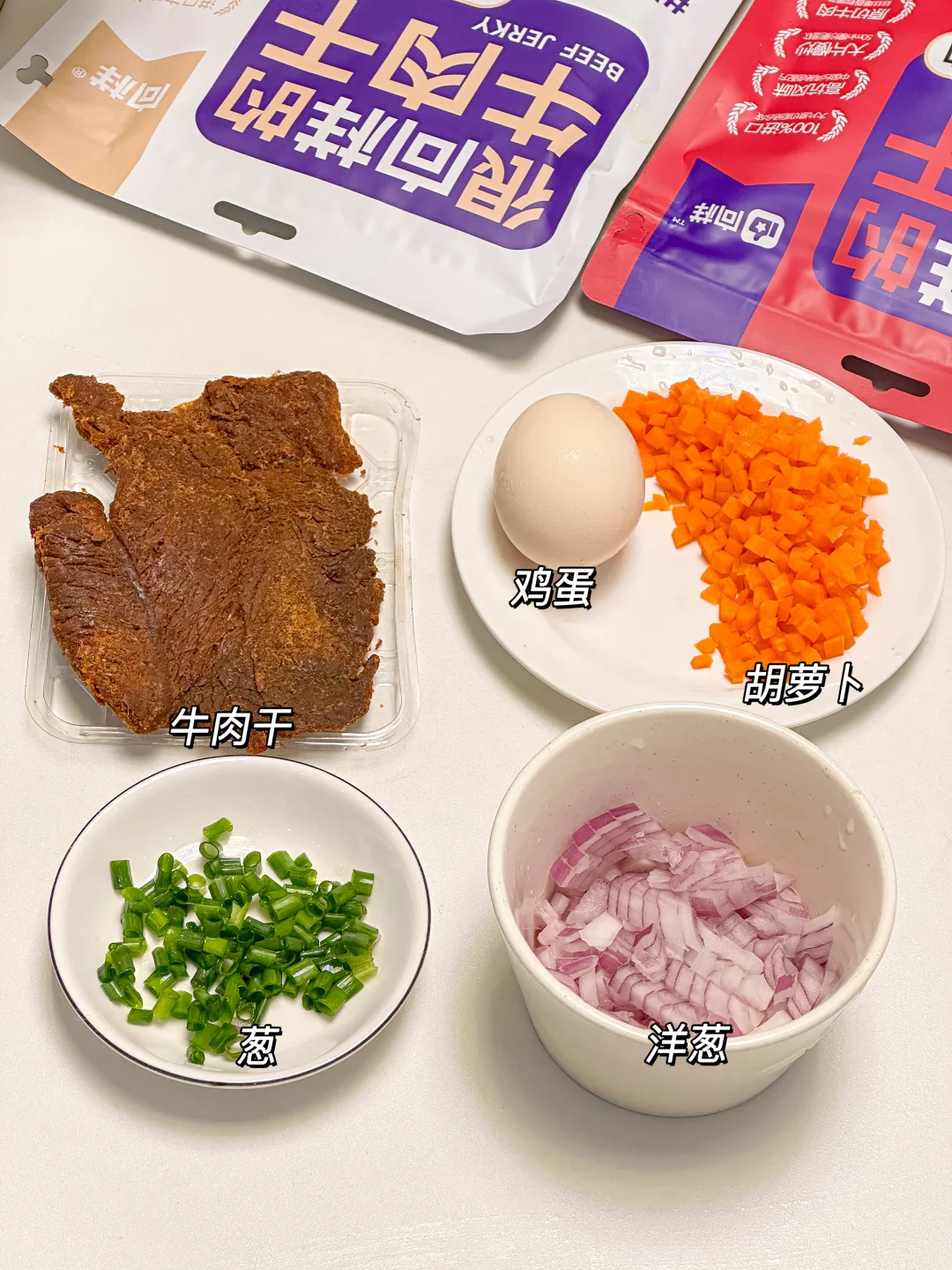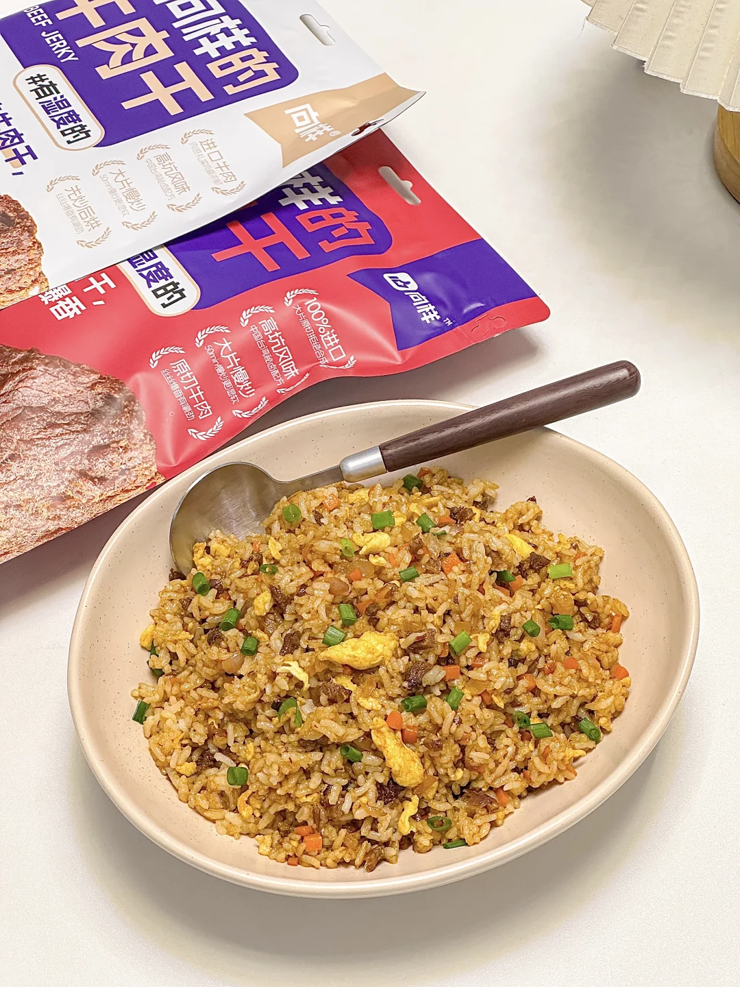 今天安排了洋葱牛肉干炒饭🥣,牛肉干炒出来的米饭和新鲜牛肉炒出来的不一样,更鲜香美味,做法简单,大人小孩都爱吃,好吃到停不下来😋 🌟准备食材: 鸡蛋一颗、胡萝卜碎、洋葱丁、牛肉干、葱花 🌟做法: 1️⃣胡萝卜、洋葱切成丁,牛肉干切成小块,鸡蛋打散炒熟盛出备用 2️⃣另起锅烧油,加洋葱炒香,加入胡萝卜炒软,再加入牛肉干炒出香味 3️⃣加入米饭,鸡蛋,加少量生抽、蚝油、盐炒匀,撒上一把葱花即可 炒好的饭真的可香了!!肉香饭香,吃了一碗还要再来一碗😋搭配这个向样牛肉干嘎嘎香,向样自营的大片原切牛肉干🐂,吃起来湿润好嚼不费牙☺️平时当个小零食越嚼越香,追剧吃向样,越吃越像样👍🏻