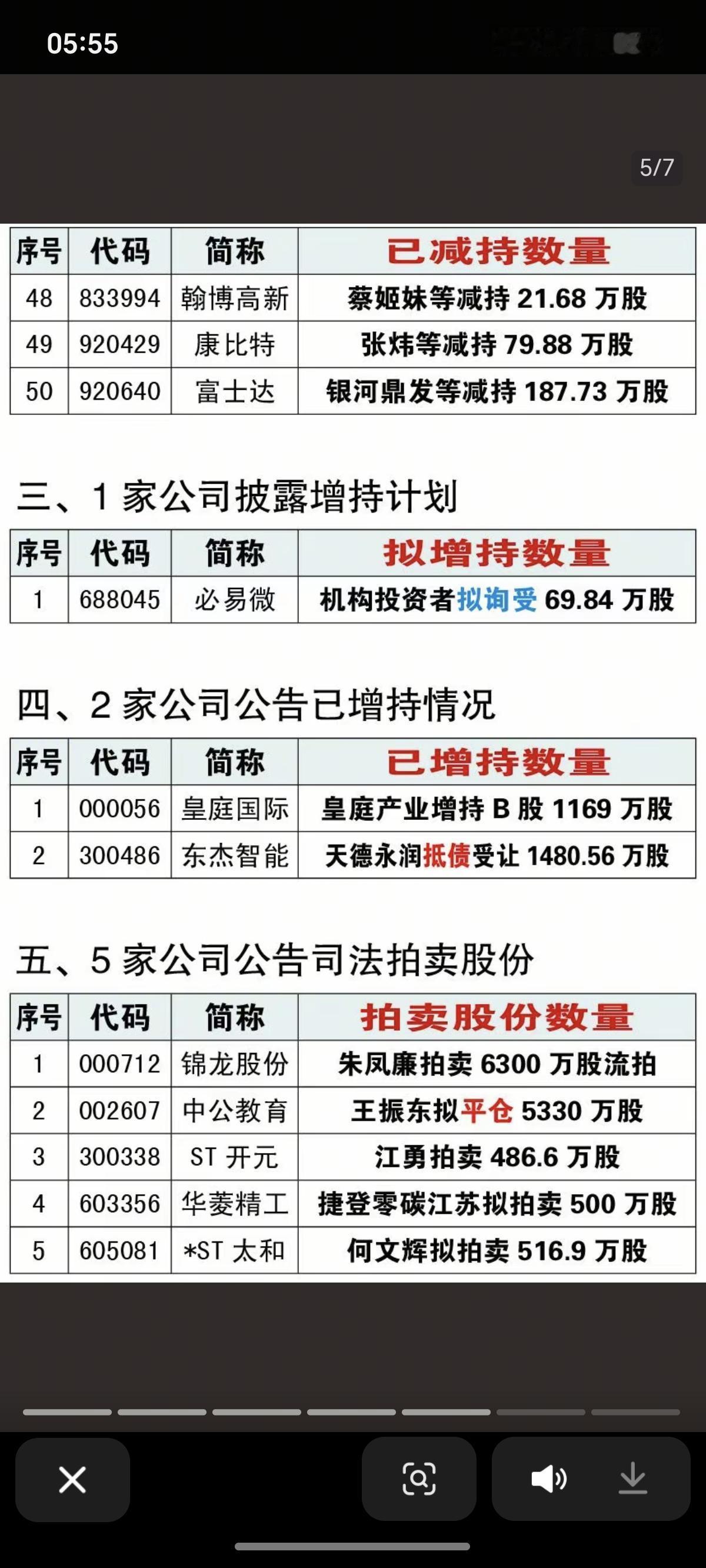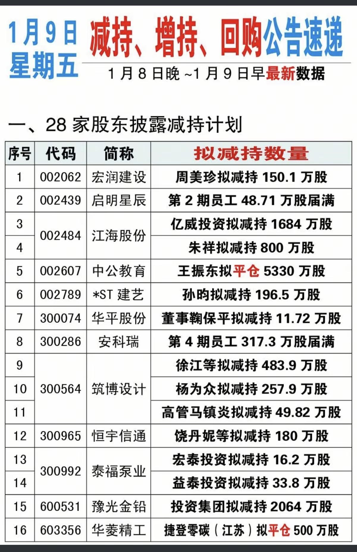 1.09周五 最新:减持,增持,回购公告! 28家股东减持计划,50家已减持情况,5家公司法拍股份,1家公司增持计划,7家公司回购股份,6家公司披露回购用途