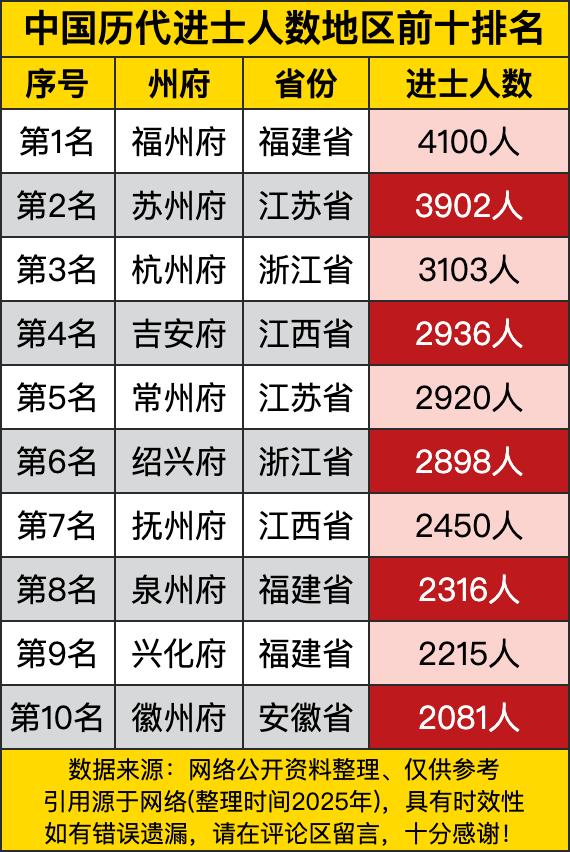 福州府那是一骑绝尘,以4100人的傲人成绩稳坐榜首,妥妥的“学霸之地”啊!就好比古代的“高考状元集中营”,这福州府的人才那是一个接一个往外冒,不知道的还以为他们那儿有啥独家的“智慧秘方”呢。 再看看亚军苏州府,3902人也相当厉害了,紧紧跟在福州府后面,就像个不服输的“追赶者”。江苏这地儿可真是人才辈出,苏州府和常州府都在前十里呢,看来江南水乡不仅风景美,还盛产才子佳人呐。这古代的文人墨客要是聚在一起,江苏籍的可不得占一大半呀。 浙江也不甘示弱,杭州府和绍兴府都榜上有名。杭州府有3103人,绍兴府有2898人,这两座城市就像浙江的两颗文化明珠。古代的浙江学子们那是相当争气,在科举的战场上杀得那叫一个漂亮。说不定当时的文人聚会,浙江的代表们都得抢着发言,展示自己的才华呢。 最后说说这排名里的其他地区。江西的吉安府、抚州府,福建的泉州府、兴化府,还有安徽的徽州府,也都各有亮眼表现。这些地方的人在古代那也是凭着自己的本事,在科举的舞台上大放异彩。看来各地都有自己的“教育秘籍”,才能培养出这么多优秀的学子,给咱留下了不少传奇故事呢!
