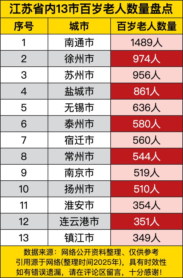南通那可是相当厉害,以1489位百岁老人的傲人成绩,稳稳坐上了榜首的宝座。这数据一摆出来,感觉南通那就是长寿之乡的“扛把子”呀!仿佛在跟其他城市说:“长寿这块儿,我南通是专业的!” 再瞧瞧紧跟其后的徐州和苏州,分别有974人和956位百岁老人。这俩城市也不甘示弱,就像赛场上的亚军和季军争夺者,紧紧咬着南通。看来徐州和苏州的老人们都很会享受生活,说不定还藏着不少长寿的小秘诀呢,真让人好奇! 接着看看排名中间的城市,从盐城到扬州,百岁老人数量都在350 - 861人之间。这些城市的老年人们也都很有活力嘛,虽然没进前三甲,但长寿的队伍也是相当壮大。就好比一场马拉松比赛,它们处于中间梯队,不紧不慢,却也有着自己的节奏。 最后是淮安、连云港和镇江,百岁老人数量相对少一些,在349 - 354人。不过可别小瞧了它们,每一位百岁老人都是生活的赢家。也许它们正憋着一股劲儿,准备在未来给咱一个大惊喜,让排名来个大逆袭呢,咱们就拭目以待啦!