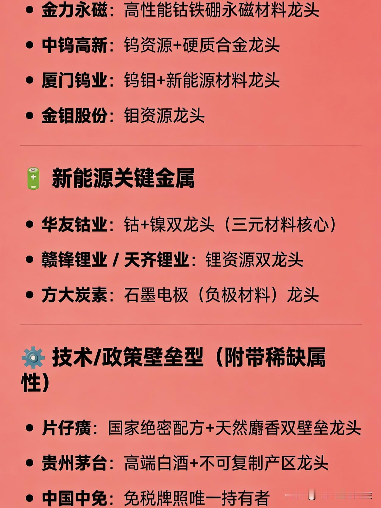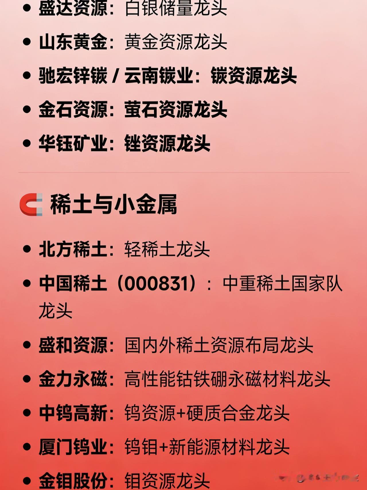 稀缺资源概念的主要龙头公司 🌍 资源垄断型 盐湖股份:钾肥+锂资源双龙头 中国铀业:铀矿开采唯一资质龙头 紫金矿业:黄金+铜双龙头 洛阳钼业:铜+钴双龙头 兴业银锡:白银+锡双龙头 华锡有色:锡+锑双龙头 湖南黄金:黄金+锑双龙头 金岭矿业:高品位铁矿石龙头 兖矿能源:动力煤/喷吹煤龙头 北方铜业:铜资源龙头 中金岭南:铅锌资源龙头 盛达资源:白银储量龙头 山东黄金:黄金资源龙头 驰宏锌锗 / 云南锗业:锗资源龙头 金石资源:萤石资源龙头 华钰矿业:锑资源龙头   🧲 稀土与小金属 北方稀土:轻稀土龙头 中国稀土(000831):中重稀土国家队龙头 盛和资源:国内外稀土资源布局龙头 金力永磁:高性能钕铁硼永磁材料龙头 中钨高新:钨资源+硬质合金龙头 厦门钨业:钨钼+新能源材料龙头 金钼股份:钼资源龙头   🔋 新能源关键金属 华友钴业:钴+镍双龙头(三元材料核心) 赣锋锂业 / 天齐锂业:锂资源双龙头 方大炭素:石墨电极(负极材料)龙头   ⚙️ 技术/政策壁垒型(附带稀缺属性) 片仔癀:国家绝密配方+天然麝香双壁垒龙头 贵州茅台:高端白酒+不可复制产区龙头 中国中免:免税牌照唯一持有者
