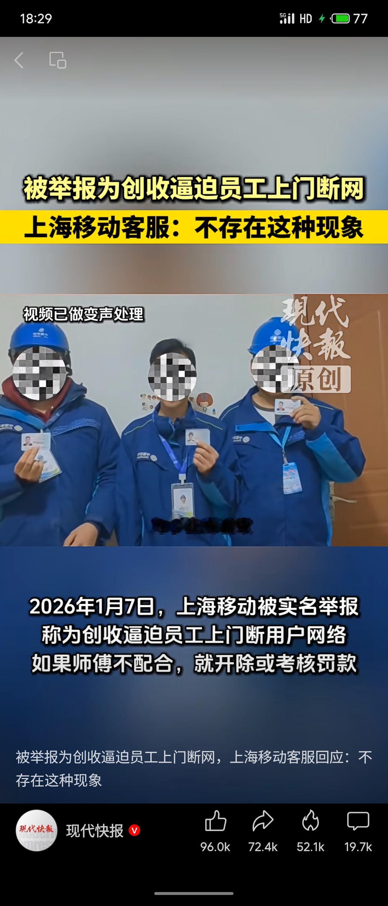 上海移动被实名举报为创收逼迫员工上门断网,公司客服于次日回应称不存在此类现象。