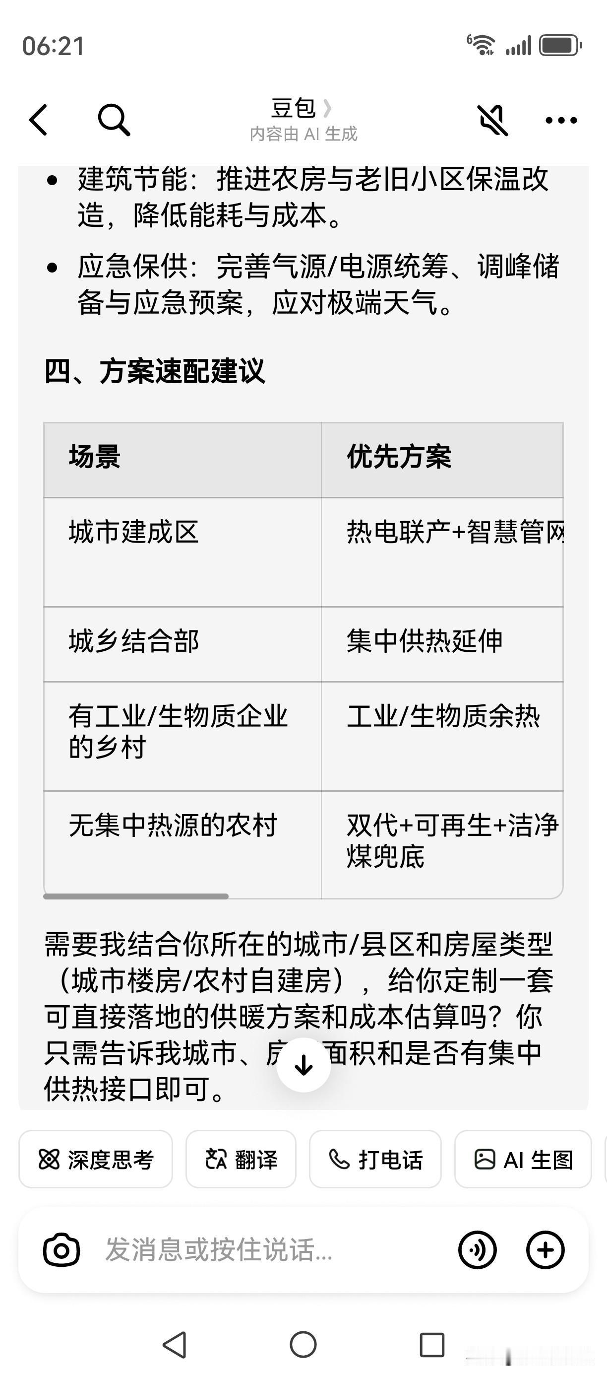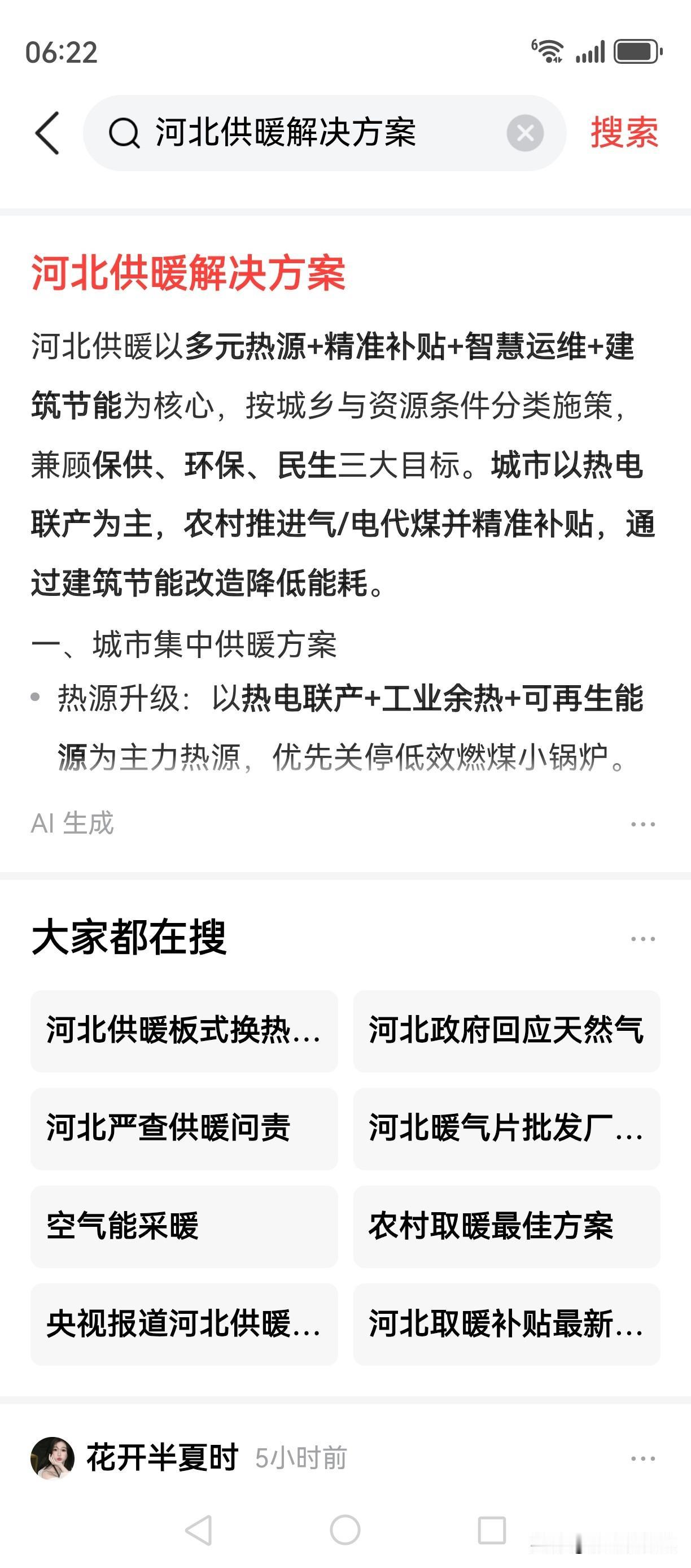 “河北供暖问题解决方案”出来了?连AI都关注起河北供暖问题了,刚打开头条就出现了:河北供暖问题解决方案。仔细一看,原来这个是AI给出的方案。 方案如下: 河北供暖以多元热源+精准补贴+智慧运维+建筑节能为核心,按城乡与资源条件分类施策,兼顾保供、环保、民生三大目标。城市以热电联产为主,农村推进气/电代煤并精准补贴,通过建筑节能改造降低能耗。 一、城市集中供暖方案 - 热源升级:以热电联产+工业余热+可再生能源为主力热源,优先关停低效燃煤小锅炉。 - 管网优化:推进老旧管网改造与"冬病夏治",新增区域按规划并网,避免"交房不交暖"。 - 智慧调控:建"源-网-站-户"全流程监测,按室温与气象数据动态调温,降低能耗与投诉。 - 服务规范:执行《河北省供热用热办法》,室温不低于18℃,不得"连坐停暖"或捆绑收费。 二、农村清洁供暖方案(因地制宜) - 集中供热延伸:靠近城镇的农村接入市政管网,成本更低、室温更稳。 - 工业/生物质余热:村企共建,用工厂或农林加工余热供暖,典型案例如承德滦平、遵化,25元/㎡左右,室温稳定。 - 双代工程(气/电代煤):气代煤每方补0.8元,上限1200m³,最高省960元;电代煤每度补0.12元,上限10000度,最高省1200元;特殊群体全额补贴,补贴直发到户。 - 可再生+储热:太阳能光热+跨季储热(如馆陶)、空气源/地源热泵,适合资源丰富区域。 - 洁净煤兜底:对暂不具备改电改气条件的地区,推广合规洁净煤并配套服务。 三、关键保障措施 - 政策法规:新版《河北省供热用热办法》2026年1月起施行,弹性调供暖时段,强化监管与服务。 - 补贴精准:差异化补贴,重点保障低收入与特殊群体,简化流程、直达用户。 - 建筑节能:推进农房与老旧小区保温改造,降低能耗与成本。 - 应急保供:完善气源/电源统筹、调峰储备与应急预案,应对极端天气。 四、方案速配建议 场景 优先方案 核心优势 1,城市建成区 热电联产+智慧管网 稳定、高效、易监管 2,城乡结合部 集中供热延伸 成本低、接入快 3,有工业/生物质企业的乡村 工业/生物质余热 经济、环保、带动就业 4,无集中热源的农村 双代+可再生+洁净煤兜底 灵活适配、保障民生 你们觉得这个方案可行吗?河北邢台采暖 河北供暖系统 京津冀供暖 关注河北供暖