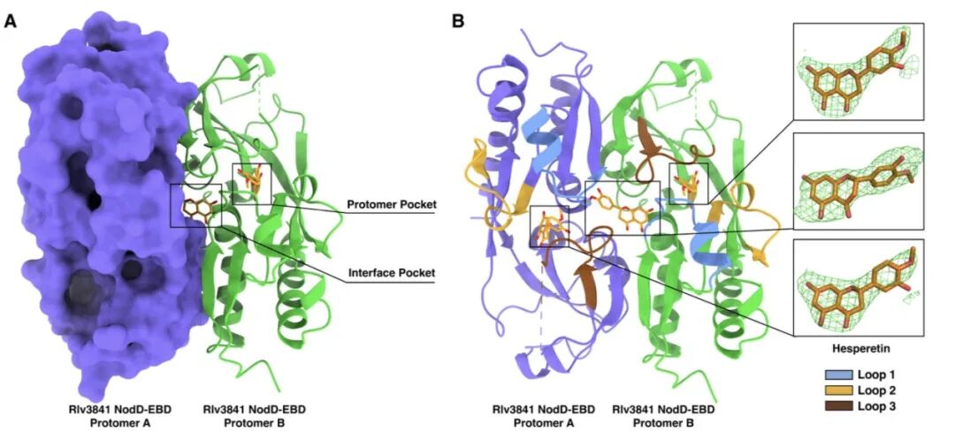 研究发现,豌豆根瘤菌NodD蛋白的配体结合结构域,通过两个蛋白口袋识别橙皮素——一个位于NodD蛋白的单体中,另一个位于NodD蛋白的二聚界面上,这种结合构象在NodD所属的转录调控因子家族中属首次发现。