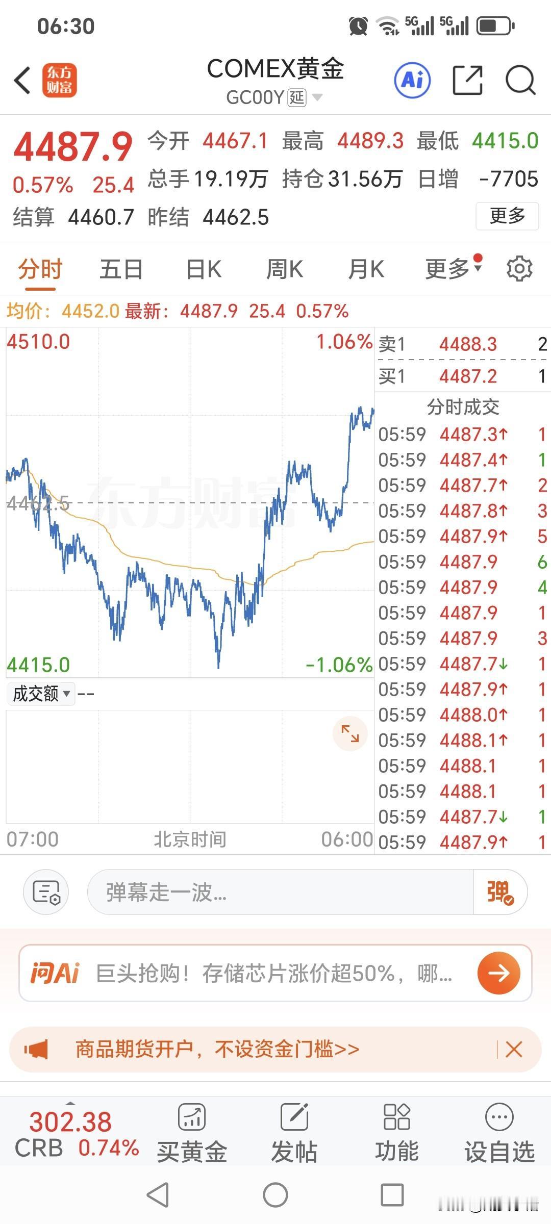 周四国际金价止跌回升, 小幅走强上涨。 昨日国际金价震荡运行, 开盘4467.1美元, 盘中最高4489.3美元, 最低跌至4415美元, 收盘于4487.9美金, 较上一日上涨25.4美金, 涨幅0.57%。 虽然再次上涨, 期货小褚观点不变, 还是认为观望为主比较好!