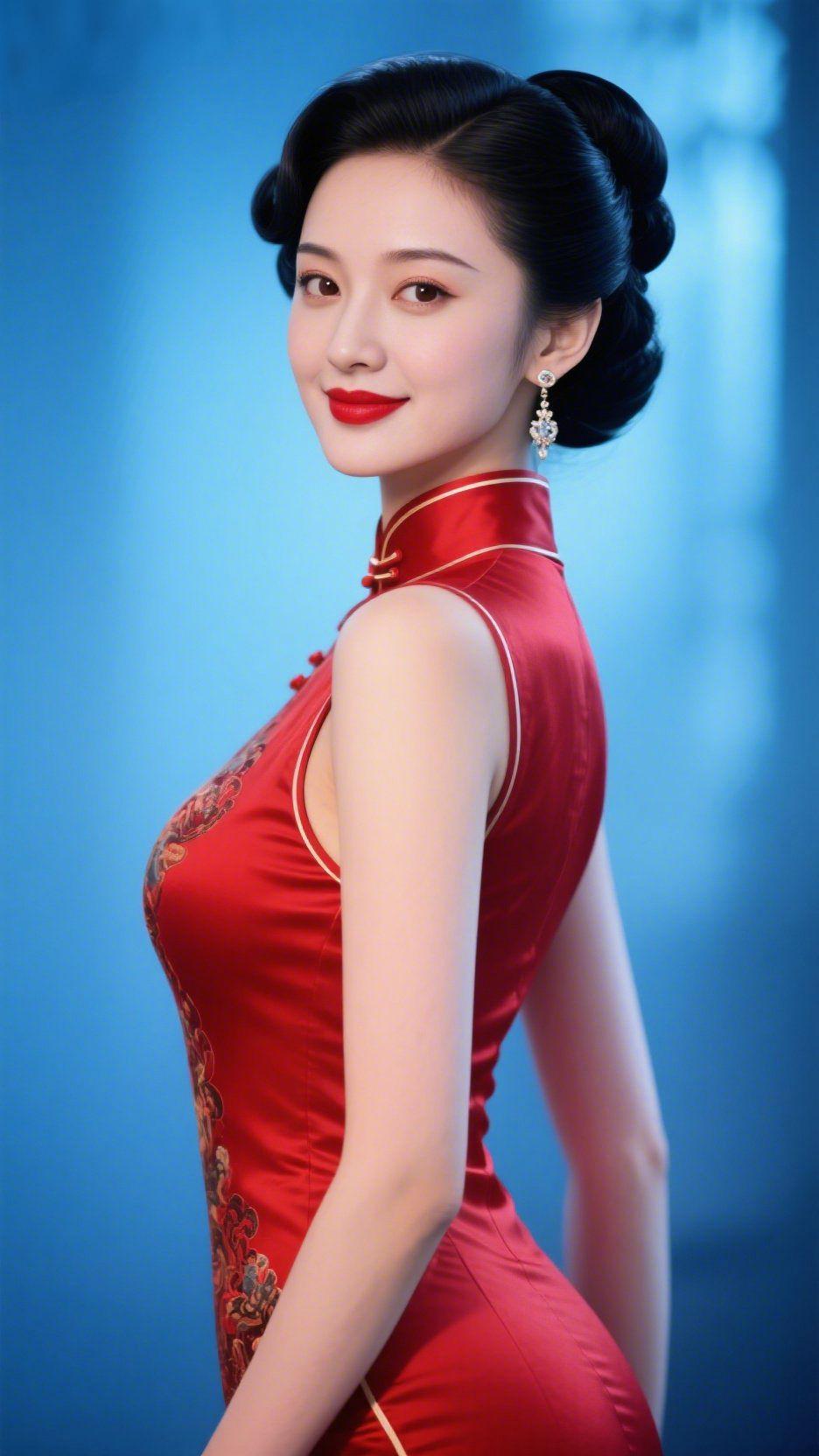 红袍映蓝韵生香 幽蓝背景如澄澈的琉璃,将一袭正红旗袍衬得愈发明艳。旗袍的缎面莹润如凝脂,金线滚边衬出立领的精致,衣身的刺绣暗纹似藏了江南的婉约,在光影里若隐若现。乌黑发丝挽成复古发髻,鬓边的珍珠耳饰轻晃,像星子坠在耳畔,添了几分灵动。 她回眸的瞬间,唇间的红韵如丹砂点染,眼眸弯成月牙,笑意里漾着中式女子的温婉与明媚。红与蓝的撞色没有丝毫违和,反倒将东方美学的对比之美展现得淋漓尽致。原来传统服饰的魅力,从不是刻板的复刻,而是这般与现代审美相融,在色彩的碰撞里,绽放出跨越时光的优雅,让人沉醉于中式美学的独特韵味中,心生对传统之美的无限喜爱。 红蓝撞色旗袍 中式复古美学
