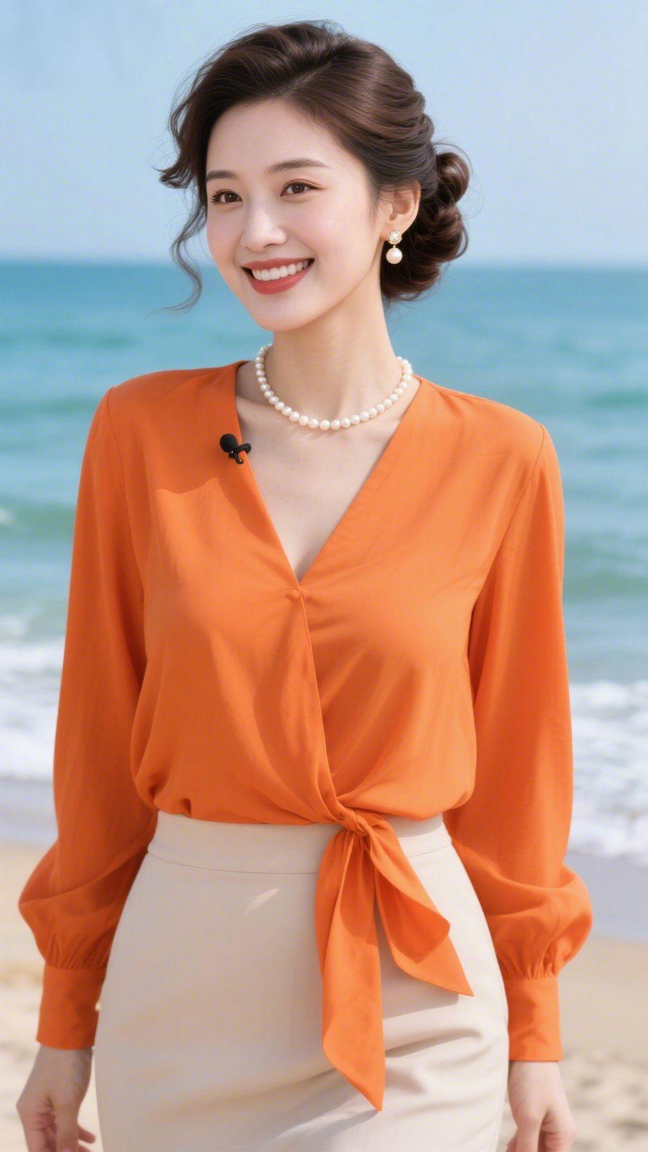橘衫伴海夏闲柔 海风裹着咸湿气息漫开时,她身着橘衫立在沙滩旁,恰似将夏阳暖调揉进浪声柔意里。 发鬓轻挽、珍珠衬颈,衬得那抹橘愈发明润——是浸了松弛的舒展,无半分张扬。衣装轻垂身侧却自在轻盈,结带的设计添了灵秀;笑意落进眉眼,连浪尖的光都似柔了几分。 这景致藏着日常的鲜活:橘的暖裹着肩臂,海的蓝衬着清容,身影落在滩边,像潮间轻晃的光,雅得恰好。 原来夏日从不是灼人的,是这般妥帖的、浸了海风的柔,落进眼底,便成了心上一点轻喜。 夏滩橘衫雅 日常松弛感