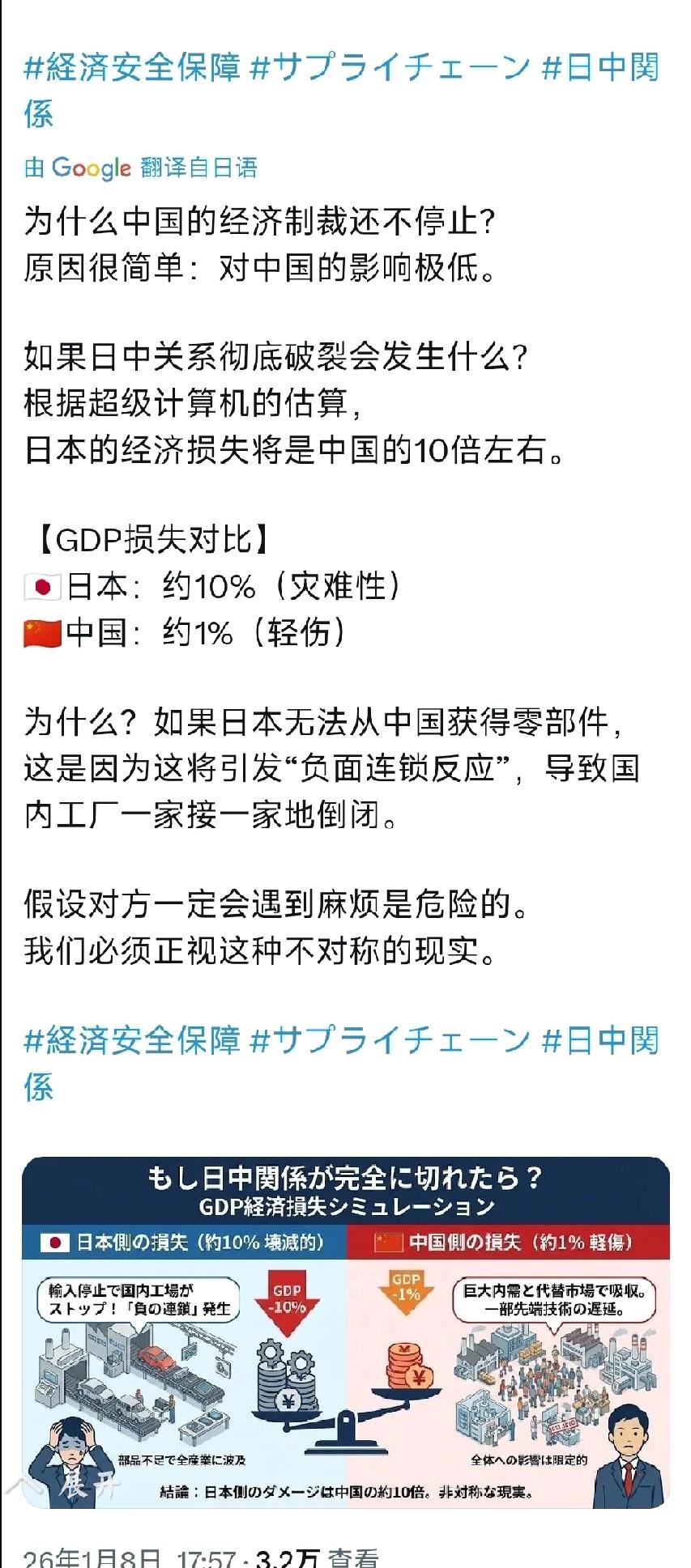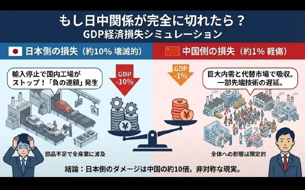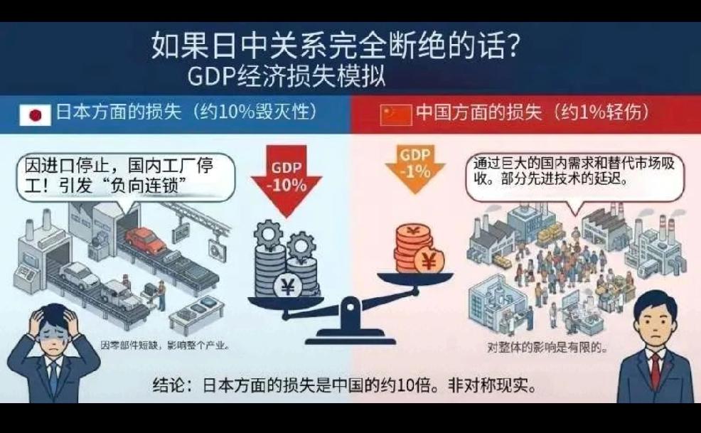 顽抗到底 请看来自日本社交媒体并且大量转发的一张图片和一个说法,首先允许个人观点叙述:日本当前政府,就是在用行动表达:顽抗到底的意思。 “为什么中国的经济制裁还不停止?原因很简单,对中国的影响极低。 如果日中关系彻底破裂,会发生什么?根据超级计算机的估算,日本的经济损失将是中国的10倍左右。 GDP损失,对比日本约10%,灾难级;中国约1%,轻伤。为什么?如果日本无法从中国获得零部件,这是因为引发“负面连锁反应”导致国内工厂一家接一家的倒闭。假设对方一定会遇到麻烦是危险的,我们必须正视这种不对称的现实” 日本的经济结构是把日本的半导体和汽车行业作为核心产业,是整个日本出口经济的核心。 而这次中国以两用物项出口管制,直接封锁日本军工,半导体,汽车等核心产业,这将会导致日本出口严重受损。 此刻的国内现状是股市下跌,企业与政府毫无办法,无能为力。 在这种情况下,日本当前领导层选择沉默至今,毫无官方正式表态。个人理解就是无声表达:“顽抗到底,伪装可怜,继续颠倒黑白,扭曲是非,倒打一耙,无事生非。”