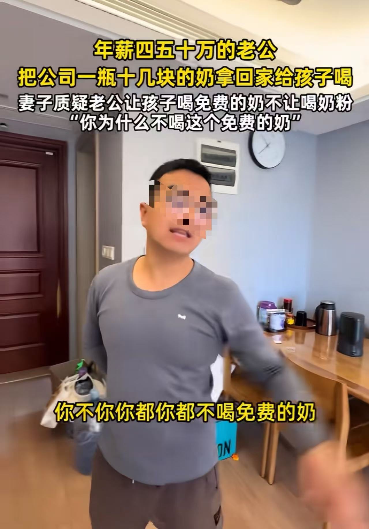 老婆不放过他,继续质问:“你都不喝免费的奶,然后拿回来给孩子喝,这算怎么回事?你为什么自己不喝?”