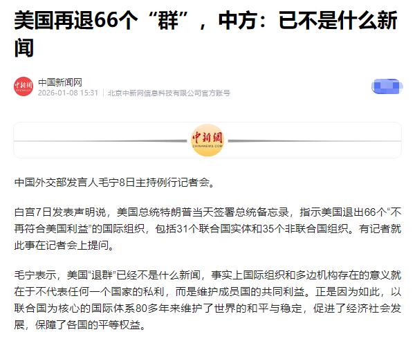 一夜醒来,传来特朗普的五个消息,全与中国有关! 先说北约这事,他反复念叨"中俄怕美国",这话听着耳熟——就像当年他说"墨西哥会掏钱建墙"一样,带着股子自我催眠的劲儿。 格陵兰岛争端里,丹麦首相直接呛声"美军敢动手北约就散伙",欧洲国家罕见抱团,这让习惯了"美国一声吼、盟友抖三抖"的特朗普急了。 他在社交媒体敲出千字长文,把自己说成"单枪匹马镇住中俄"的救世主,甚至搬出"结束八场战争"的陈年旧事——可明白人都知道,俄乌停战谈判桌上,普京正用能源牌和特朗普周旋,美军在北大西洋扣俄油轮时,俄军军舰压根没接招,这种战略克制哪是"害怕",分明是算准了美国不敢在大西洋开第一枪。 这边吓唬北约,那边特朗普签了退出66个国际组织的备忘录。从联合国人权理事会到教科文组织,从气候机构到劳工组织,全被他贴上"不符合美国利益"的标签。 这让人想起他第一任期退巴黎协定、退世卫组织的戏码,只不过这次更狠——31个联合国实体、35个非联合国组织,连负责难民救济的近东工程处都不放过。 可退群容易填坑难,美国欠联合国教科文组织10亿美元会费的老账还没清,欧洲盟友私下嘀咕:"退了群谁来擦全球气候、公共卫生的屁股?" 更讽刺的是,同一天委内瑞拉海域,美国刚扣了中国油轮,转头特朗普就在空军一号上强调"中美关系非常好",这种"左手秀肌肉、右手谈生意"的分裂,暴露了他嘴上喊打、身体却诚实的本质——四月份访华行程要铺路,制造业回流还指着中国供应链松口呢。 军费飙到1.5万亿的消息,看着像给军工复合体送红包,实则藏着大矛盾。特朗普说靠关税收入"轻松负担",可美国商务部数据显示,2025年关税收入同比下降12%,军费窟窿靠印钞填,最终还是美国纳税人买单。 更打脸的是,他刚骂雷神公司"增产慢、拿钱喂股东",转头又给整个军工体系加预算。洛克希德·马丁的F-35战机还在趴窝,雷神的导弹生产线早就被股东分红捆住了手脚,1.5万亿砸下去,怕是又要养出一堆"只收钱不干活"的承包商。 最耐人寻味的是马斯克的"神预测"。他在播客里直言"中国盯着我的话,要么照做要么本来就在做",这话戳破了美国的窗户纸——芯片禁令下,中芯国际的14纳米产能已经追上台积电2019年水平,华为的昇腾芯片装机量去年翻了三倍。 特朗普团队还在喊"卡脖子就能让中国怕",可现实是深圳的电子厂每天生产2000万块国产芯片,成都的超算中心算力已经摸到全球前三。这种"嘴上威胁、身体跟进"的错位,像极了二十年前美国说"中国加入WTO会崩溃",结果反而养大了世界第二大经济体。 把这些消息串起来看,特朗普的焦虑藏不住了。他需要北约当枪使,可欧洲算的是格陵兰岛的稀土矿比美国承诺更实在;他想靠退群省军费,可退出的气候组织正在帮中国争取绿色技术标准话语权;他骂军工企业不争气,可1.5万亿预算里,至少4000亿要流进游说公司的口袋。 最致命的是,当他还在用"中俄害怕美国"的老剧本时,莫斯科在谈判桌玩太极,北京在产业链闷头干,连马斯克这种美国富豪都承认"中国的执行力让人睡不着"。 特朗普的五连击,看似招招针对中国,实则拳拳打在自己的旧伤上,反而让世界看清了一个真相:吓唬人的时代过去了,现在拼的是谁能坐下来算总账。
