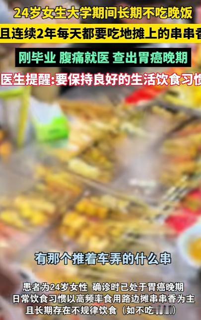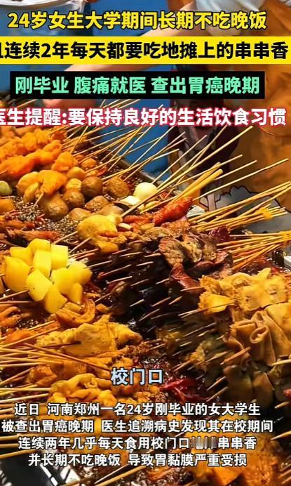“悲剧还是发生了!”河南郑州,一女生在校期间,几乎每天都会吃校门口的串串香,这一习惯持续了2年,再加上经常不吃晚饭,结果胃黏膜受损,持续胃痛,体重还一直下降,去医院检查时,才知道自己得了胃癌,并且癌细胞已经扩散。 事情的主人公,是郑州一所高校的女生小林(化名)。在同学眼中,她性格温和、学习努力,唯一的“标签”,就是几乎每天雷打不动要去校门口吃一顿串串香。 红油翻滚、香气四溢,十几块钱就能吃到满满一盆,对学生来说既解馋又省钱。起初,这只是再普通不过的校园日常。 但这个习惯,一坚持就是整整两年。 不少同学回忆,小林经常一边刷手机一边吃串串,辣油顺着竹签往下滴,她却觉得“越辣越爽”。 为了控制体重,或者图省事,她常常不吃晚饭,有时甚至一天只吃一顿串串。室友劝她注意身体,她总是笑着说:“年轻嘛,扛得住。” 真正的变化,是从胃痛开始的。 最初只是隐隐作痛,小林以为是吃辣上火,买点胃药应付一下。后来疼痛开始频繁出现,空腹痛、夜里痛、吃完更痛,她却依然没当回事。 再后来,她的食量明显变小,稍微吃一点就恶心反酸,体重也在不知不觉中下降。短短几个月,人瘦了一圈,脸色蜡黄。 直到一次上课时,她突然疼得直不起腰,被同学送到医院。 检查结果出来的那一刻,所有人都愣住了——胃癌。而且,并非早期,癌细胞已经出现扩散迹象。 医生在询问病史时得知,小林长期高频食用高油、高辣、高盐食物,饮食极不规律,加之长期空腹刺激胃黏膜,导致胃黏膜严重受损。 在慢性炎症反复刺激下,病变悄然发生,却被她一次次忽视。 “如果早点来,结局可能完全不同。”医生的话,让家属当场崩溃。 消息传出后,网络瞬间炸开了锅。 有网友震惊:“20出头就胃癌?这也太可怕了!” 也有人开始反思:“我大学四年也是外卖+烧烤+不吃晚饭,现在越看越后怕。” 还有网友痛心直言:“不是串串香有多罪恶,是长期、频繁、不节制,身体真的扛不住。” 不少医务人员也参与讨论,强调一个被很多年轻人忽略的事实:胃从不‘突然生病’,它是在长期忍耐中被一点点拖垮的。 高温、重辣、重油反复刺激胃黏膜,再叠加饮食不规律,等真正疼到受不了,往往已经不是“小毛病”。 更让人唏嘘的是,小林曾在社交平台发过不少“吃播式”照片,配文是:“人活着,总要对自己好一点。”如今再看,评论区满是叹息。 “对自己好,不是把胃当垃圾桶。” “年轻不是免死金牌。” “希望这条热搜,能救下更多还在熬夜吃辣的孩子。” 这起事件之所以引发巨大共鸣,是因为它太“像我们身边的人”。 校门口的小吃、为了省钱和方便而忽略的正餐、被推迟的体检、被忽视的疼痛……几乎每一个细节,都在无数年轻人身上出现过。 悲剧已经发生,无法重来。但它至少提醒了所有人:身体的警告,从来不是空穴来风。当胃反复疼、体重异常下降、食欲明显改变时,那不是“忍一忍就过去”,而是身体在拼命求救。 网友的一句话,被点赞无数:“希望她的经历,能成为别人的‘止损点’,而不是下一场悲剧的开始。”