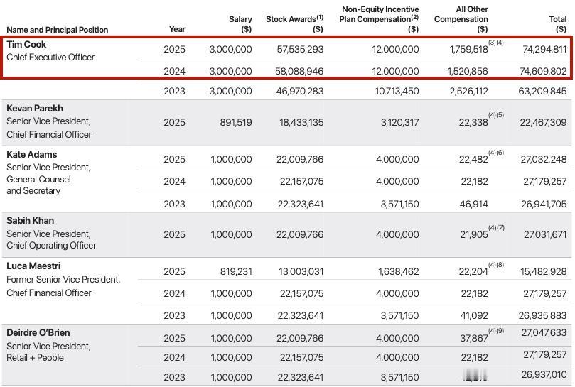苹果掌门人库克年薪终于下降了,2025年总薪酬为7430万美元(约合5.2亿元人民币),较2024年的7460万美元微降0.4%,但但依然遥遥领先于普通打工人。
