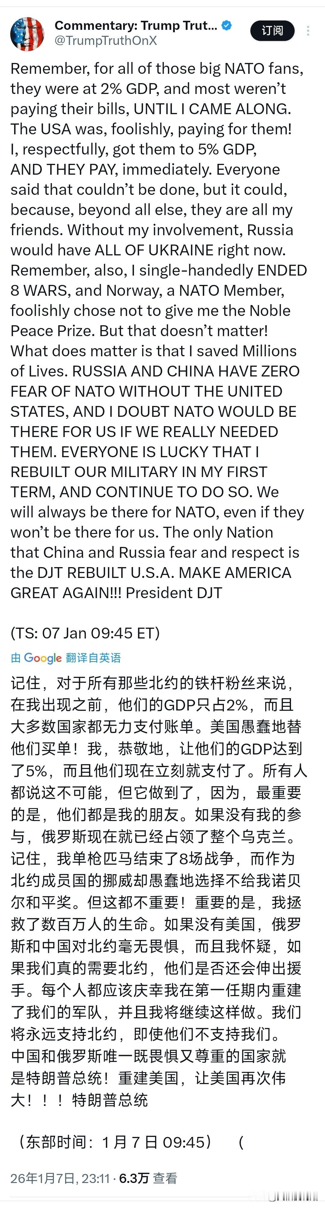 特朗普(1月7日)发文说:“听着,那些北约的铁杆拥趸们,听好了——在我横空出世之前,他们承诺的军费开支是GDP的2%,可绝大多数国家都在耍赖皮、不掏钱!而我们美国呢?简直蠢到家了,一直在替他们买单!是我,凭着我的方式,让他们乖乖把军费提到了GDP的5%,而且他们当场就掏了钱!所有人都说这事儿绝不可能办成,但我办成了,因为说到底,他们全都是我的朋友。 那个声音一出来,很多人其实已经有心理准备了,音量不低,节奏很快,说话时几乎不给人插嘴的空间。 你能明显感觉到,他并不是在回应谁的问题,而是在重复一套早就准备好的说法,与其说是在谈外交,不如说更像是一个习惯站在会议桌主位的人,在不断强调“事情是我定的”。 特朗普最近这段长时间的讲话里,有一个很明显的特点:复杂的问题都会被压缩成极少数几个指标。 国际关系不再是制度、历史和博弈的结果,而更像是一张账单,谁出了钱,谁没出钱,谁让美国吃亏了,谁被他“纠正”过,在这样的叙述里,他始终处在中心位置,其他国家只是围绕着他的变量。 他说北约国家的军费应该提高到GDP的5%,这个数字放在现实中,其实非常刺眼,就算是在安全压力明显上升的这几年,大多数欧洲国家也只是勉强向2%靠拢,而且过程并不轻松。 财政赤字、福利支出、国内政治博弈,每一项都会直接卡住预算空间,但这些现实问题,在他的讲述中几乎完全消失了。 取而代之的,是一种非常个人化的表达方式,他反复强调,是自己“逼”盟友掏钱,是自己让他们意识到不能再“占美国便宜”。 在他的说法里,北约不像是一个协商运作的联盟,更像是一个需要不断催款的客户群体,如果没有他的强硬态度,这些国家就会继续拖延、赖账。 这种说法,听起来很解气,但它本质上把“共同防务”讲成了一种交易,安全不再是共同承担的风险,而是一种随时可以涨价、也可以断供的服务。 这对国内听众来说或许容易理解,但对真正参与联盟运作的人来说,显然并不符合实际情况。 类似的处理方式,也出现在他对“和平贡献”的描述中,他多次提到,如果不是自己,某些地区早就爆发全面战争,甚至会造成更大的伤亡。 他讲这些话时的语气非常肯定,像是在陈述已经发生过的历史。 但如果把这些说法放回现实坐标里看,会发现很多内容,并没有清晰对应的事实支撑。 一些地区的冲突并未结束,有的只是暂时降温,有的则根本没有进入实质谈判阶段,更多时候,那些被他称为“阻止的战争”,只是停留在推测层面。 即便如此,这并没有影响他对自己角色的高度认可,尤其是在提到诺贝尔和平奖时,这种情绪几乎不加掩饰——他认为自己做得足够多,却没有得到应有的回报。 于是,原本独立运作的评奖机制,也被他一并否定,在他的逻辑里,只要结果不是他想要的,那问题一定出在对方身上。 这种“以结果倒推正当性”的方式,也体现在他对中俄等大国关系的解读上,他强调美国军力的重建,强调威慑的重要性,但最终的落点,依然是个人影响力。 他暗示,只有在自己执政时,美国才真正让对手感到忌惮。 同时,他又反复表达对盟友的不信任,认为关键时刻他们并不可靠,这就形成了一种很拧巴的叙事:盟友既被嫌弃为负担,又被描述成必须由他亲自撑起的对象。 对手被描绘得很强,但他们的决策动机,却被简化成对特朗普个人态度的反应。 这种说法,显然忽略了国家行为背后的长期利益、制度约束和战略延续性,世界并不是围绕某一个人转动的,但在他的讲述里,很多复杂判断都被压缩成了“怕不怕我”。 把这些内容连起来看,会发现一个很清晰的核心:所有重要的事情,最终都要回到“我做了什么”。 盟友、对手、战争、和平,都成了衬托个人能力的背景,合作被弱化成交易,制度被简化为压力测试,国际秩序则成了可以随时调整的舞台布景。 这种表达方式,在国内政治动员中或许有效,但放到现实世界里,很难长期成立,国际关系不是靠音量维持的,也不是靠反复强调“如果没有我”来运转的。 真正起作用的,往往是那些不太显眼、却持续存在的协商、妥协和规则。 当一个叙事里,所有功劳都必须指向一个人时,那些被忽略的复杂性就会越来越多,而这些复杂性,往往不会因为被忽略而消失,反而会在关键时刻,以更难处理的方式出现。