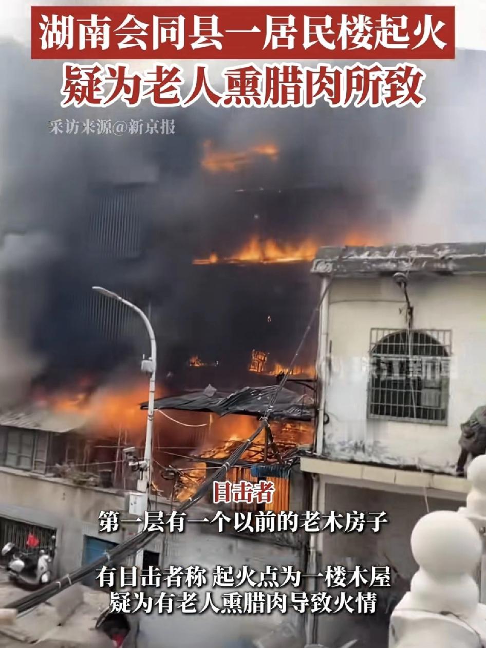 湖南怀化一栋房子嶷因老人熏腊肉时发生火灾,一楼为老木房子着火之后一直延伸至2楼,整栋楼都被烧了,每到冬季不少家庭都会熏腊肉,这种熏腊肉很多老人采取的是木材熏制的方式,如果防火措施不做好,就很容易发生火灾。如果因为一顿美味的腊肉烧了房子,真的是太不值得了。