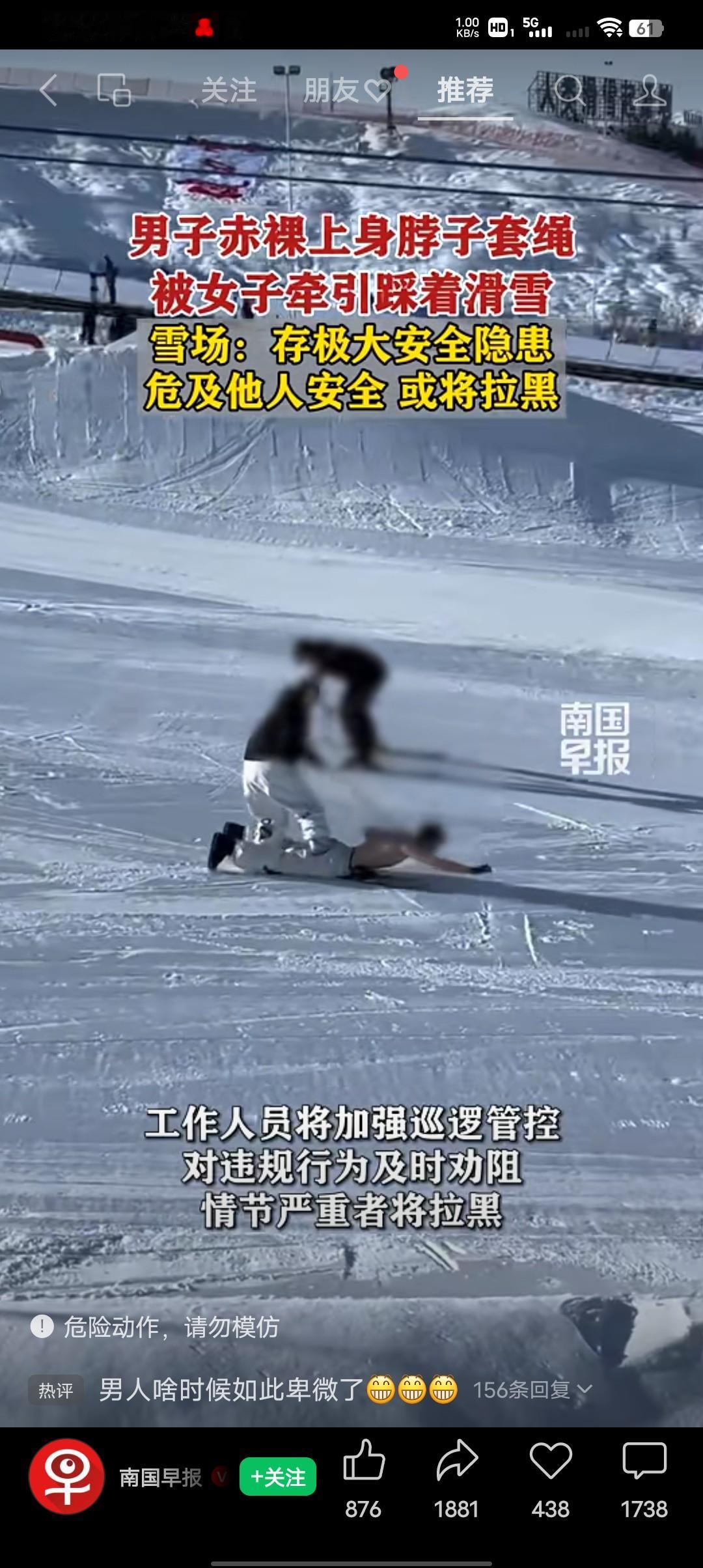 啥时候开始男人变得这样卑微了? 1月5号新疆阿勒泰将军山滑雪度假区,男子赤裸上身脖子套绳,被女子牵引踩着滑雪,旁边还有一个人拿着手机拍视频。男子还问飞起来了吗?女子口中还喊着:“飞起来了,好玩,好玩。”我觉得这个女人一点都不尊重男人,男人为了讨好女人没有底线。 滑雪场工作人员:这样真的很危险,存在极大的安全隐患,记者从该滑雪度假区获悉,事发后引起高度重视,并进行了核查该游客的行为存在极大安全隐患会危及周边雪友的安全。 说实话,我是一名女性,我觉得这样的女人真的不值得娶回家,因为她的潜意识里没有尊重男人的意思,如果一个人从心底不尊重你,那你在她的世界存在的意义是什么呢? 说句好听的是不尊重你,不好听,就是没拿你当个男人,或者说你只是她的陪玩工具,如果是你,你会选这样的女人做你伴侣吗?你觉得这样的女人靠得住吗?值得你把全部的幸福压在她一个人身上吗?反正我绝对不会选择这样的女人。