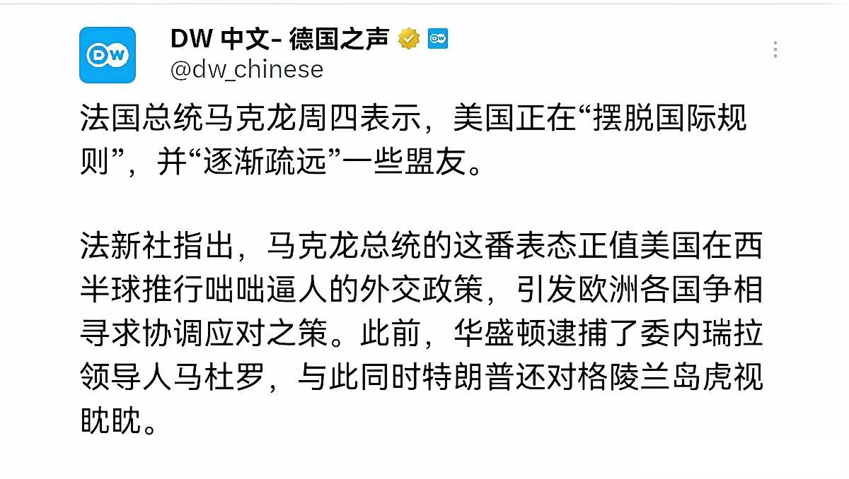 1月8日,法国总统马克龙表示,美国是一个老牌强国,但它正在逐渐疏远一些盟友,并摆脱不久前仍在推行的国际规则。我们生活在一个大国林立的世界,各大强国面对着重新划分世界的诱惑。 马克龙已经意识到,以往欧洲国家跟着美国闯荡世界的时代已在悄然发生改变。美国作为军事强国,曾经给一帮欧洲小弟带来了莫大实惠。在欧洲人面前,美国无所不能,既是规则的制定者,又是规矩的破坏者。 特朗普执政后,随着美国国家安全战略重心的转移,对待欧洲各国方面,美国正在抛弃与拥有之间进行割舍,欧洲已经不再重要,欧洲依赖美国的时代已经变得遥不可及。 马克龙指出“各大强国面对着重新划分世界的诱惑”,很显然马克龙暗指美国。 如今的美国已经不再是那个过去带领欧洲叱诧风云的美国了,一切都变了样,今天美国可以觊觎格陵兰岛,明天也可能会针对欧洲其他任何一个国家。 所以,欧洲各国现在也变得焦虑不安,毕竟特朗普真的不靠谱。