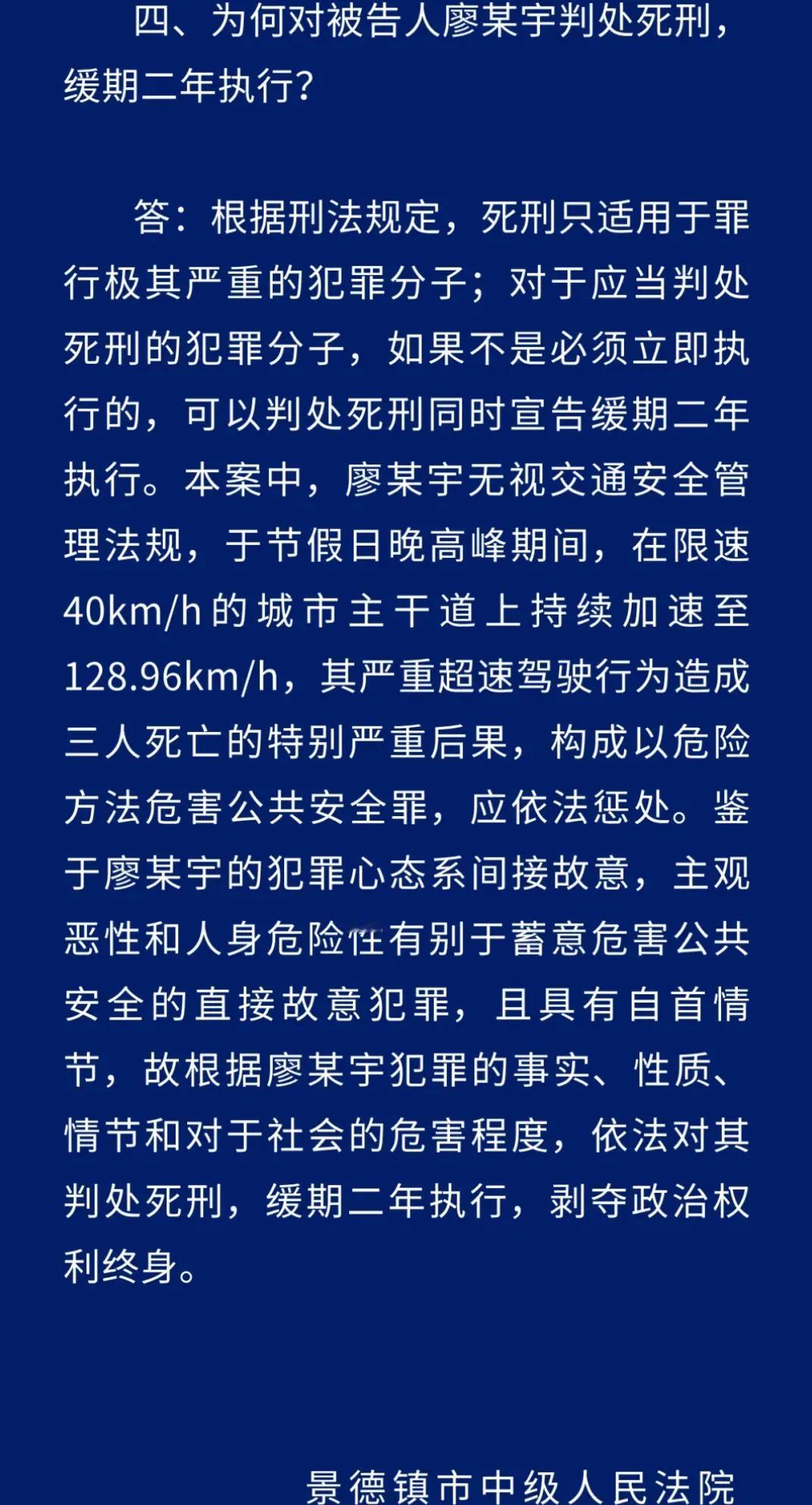 意料之外?估计有部分人会失望了 大家心心念念想着景德镇一家3口案件今日宣判了,不是预想中的结果,而是“S刑缓期执行”。 至于为什么这么判,大家可以看一下底下这个法院的解释。说真心话,从现有的规定和程序来看,法院判的,可能也没什么问题! 只是有时候,法律之外还能不能更加多一点温情?那可是三条人命,两个家庭,直接是支离破碎。 如果可以,我相信那两对父母肯定愿意用命来换子女和孙子。但事实就是这么的残酷?真的很难想象未来的日子他们该怎么度过!