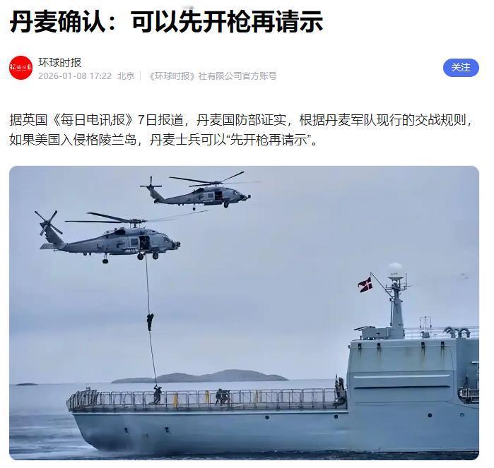 一夜之间,态度大变!丹麦对美亮强硬底牌:入侵格陵兰可先开枪再请示!   1月7日,丹麦联合法国、德国、英国、意大利等多国,苦口婆心地呼吁美国谨慎对待格陵兰岛问题,别破坏北约内部的团结大局。   转天,英国《每日电讯报》披露称:丹麦国防部已下令,一旦美国军队入侵格陵兰岛,丹麦士兵无需等待开火命令,完全可以先开枪再请示。丹麦国防部还公开表态,就算来的是美国士兵,只要擅自闯岛,就会被认定为军事入侵,等同于丹麦遭受攻击、战争正式打响。   这一前一后的态度反差,简直让人始料未及,也让本就紧张的格陵兰岛问题,瞬间剑拔弩张。   格陵兰岛是世界第一大岛,属于丹麦的自治领地,虽然拥有高度自治权,但国防和外交事务仍由丹麦政府掌管,而且它的安全事务早已纳入北约体系。   这些年来,美国一直对格陵兰岛虎视眈眈,不是惦记着岛上的稀土、石油天然气等稀缺资源,就是看重它北极要冲的战略位置,想通过控制格陵兰岛介入北极事务,掌控未来的北极航道。   尤其是最近这段时间,美国对格陵兰岛的觊觎更是毫不掩饰。美国总统特朗普多次公开宣称“美国绝对需要格陵兰岛”,白宫官员甚至放出风声,正在讨论包括“购买”格陵兰岛、动用军事力量在内的多种获取方案,还直言“所有选项都在桌面上”。   这种赤裸裸的表态,让丹麦和欧洲多国深感不安,毕竟丹麦和美国同为北约成员国,按道理应该是盟友关系,如今盟友却要觊觎自己的领地,这换谁都无法接受。   也正因为如此,丹麦才会先联合法国、德国、英国、意大利等多国发声,呼吁美国保持克制,谨慎处理格陵兰岛问题,别因为这事破坏了北约内部的团结。   北约成立的初衷是为了集体防御,成员国之间本该相互信任、相互支持,现在美国的做法明显已经越界,让北约内部的互信出现了裂痕。丹麦牵头呼吁,其实也是想给美国一个台阶,希望通过协商解决问题,维护北约的整体稳定。   可没想到,丹麦的善意提醒似乎没被美国放在眼里。就在联合呼吁之后没多久,丹麦就果断升级了应对姿态,直接亮出了“先开枪再请示”的强硬底牌。   这一命令是基于丹麦1952年就制定的军事规定,丹麦国防部也明确证实,这项规定目前仍然有效。按照这个规定,只要发生入侵行为,哪怕指挥官还不知道已经宣战或进入战争状态,被攻击的部队也必须立即投入战斗,不用等待上级命令。   丹麦的这个表态,无疑是向美国划出了明确的红线,足以看出丹麦捍卫领土主权的决心。   而且不只是丹麦,欧洲多国也纷纷站出来支持丹麦的立场,法国外长就明确表示,美国攻击另一个北约国家完全违背自身利益,德国、意大利等国也强调,格陵兰岛的事务只能由丹麦和格陵兰岛自己决定,任何国家都无权干涉。   现在整个局势变得十分微妙,美国一边说要通过外交渠道解决问题,一边又不放弃军事选项,这种模棱两可的态度让矛盾难以化解。
