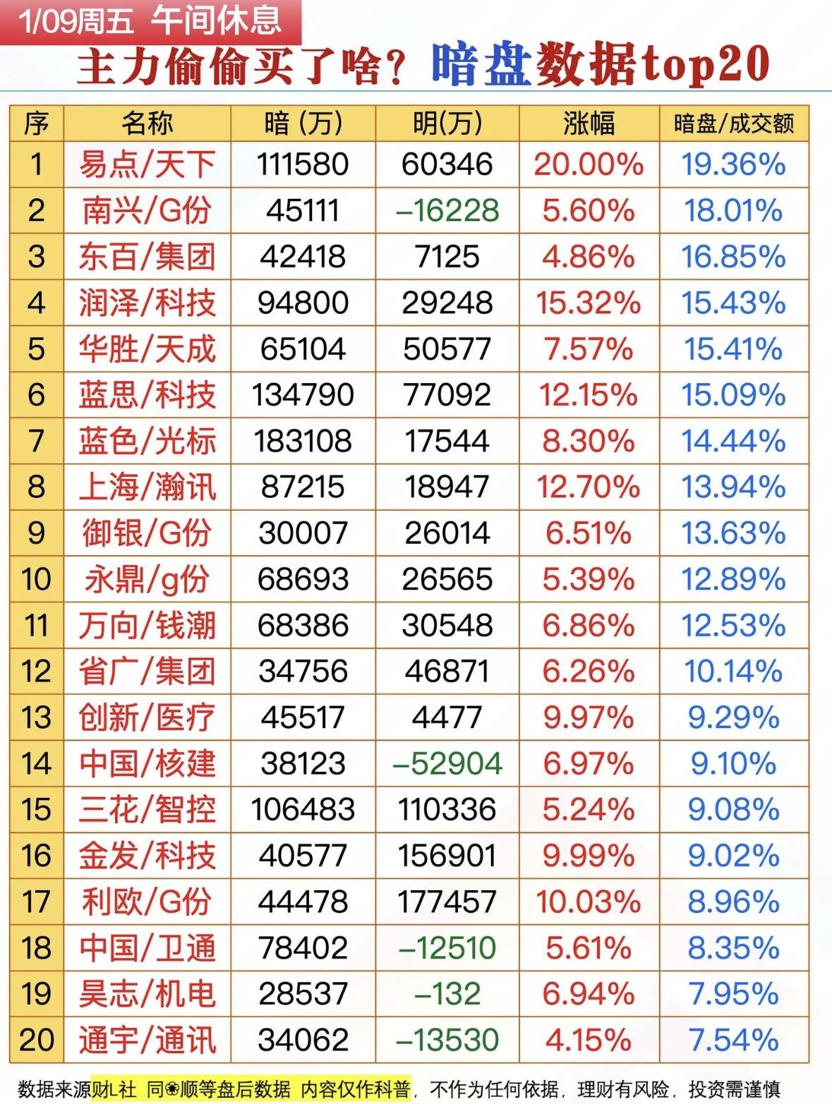 1月9日暗盘资金流入TOP10,揭秘哪些股票最受欢迎! "暗盘资金活跃股:蓝标