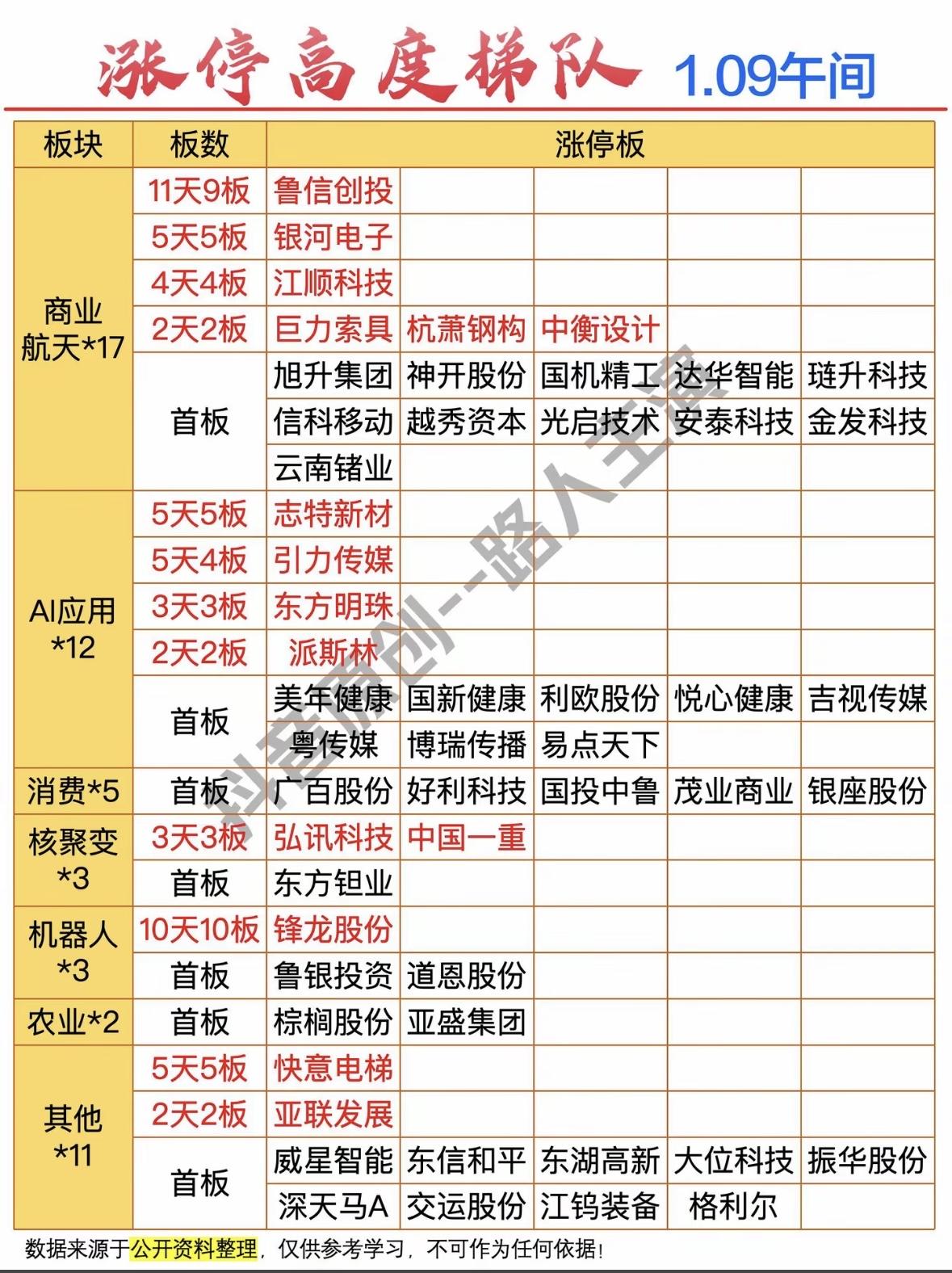 涨停高度梯队 1.09午间复盘,带你掌握热门股! 股市热点轮动:创投领涨,商业、航天、消费、核聚变等板块活跃,多股连板,机器人概念亮