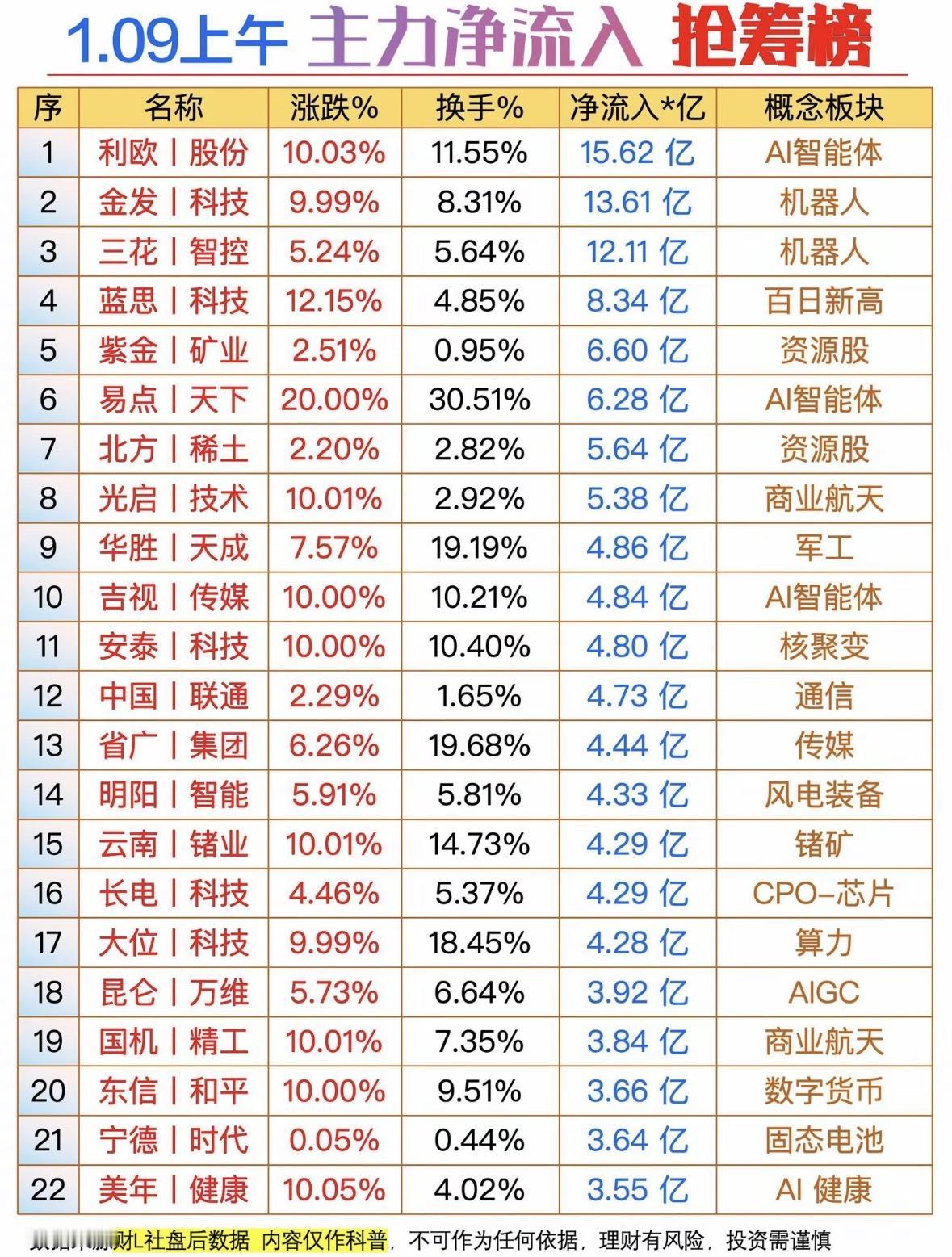 今日主力净流入抢筹榜,AI智能体、机器人、百日新高概念股领涨! AI智能体、机器人获主力抢筹,商业航天、军工、核聚变等概念活跃,市场热点轮动加速。