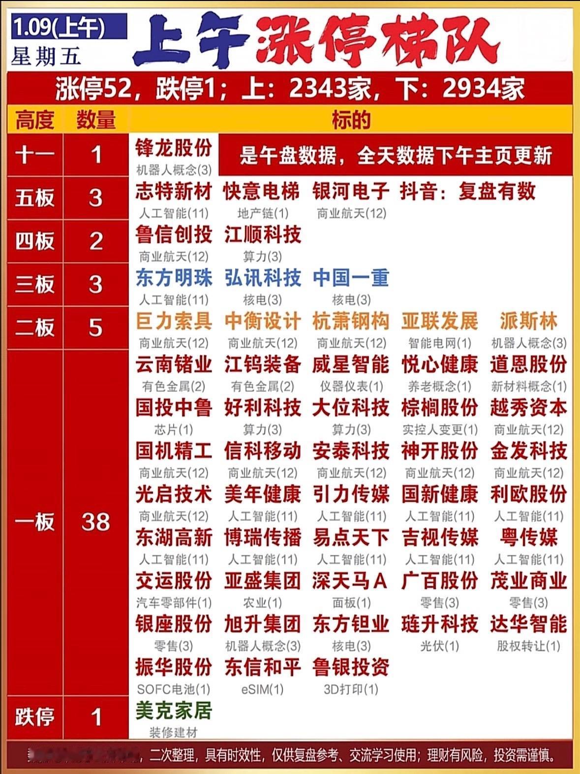 周五今天早上涨停梯队梳理 人工智能领涨,商业航天活跃,核电机器人跟风,市场分化明显,投资需谨慎。