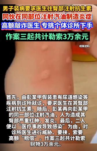 2025年,湖北荆州,一男子假装生病到私人诊所里打针,没想到却趁着医生不注意,往自己的屁股上注射汽油!结果被打针的部位严重红肿后,男子又讹诈医生索要高额赔偿,网友:有这头脑偏要去当骗子。 为了敲诈几千块,竟对自己下此狠手,这场自导自演的“苦肉计”,最终让两人付出了坐牢又毁身的惨痛代价。 谁能想到,看似周密的骗局,早已被身体的剧痛和法律的天网埋下了覆灭的伏笔。 事情的主角是彭某和彭某甲,两人臭味相投,合计出这套极端碰瓷手法。 2024年11月,彭某甲揣着提前备好的针管,走进了荆州区李医生的临街个体诊所。 他刻意装出难受的模样,操着沙哑嗓音谎称尿道发炎,恳求李医生打一针抗生素快速缓解。 全程他配合登记问诊,对李医生询问的过敏史、过往病史对答如流,演技毫无破绽。 打针时,彭某甲故意侧身,巧妙挡住诊所监控的关键角度,为同伙创造机会。 待李医生转身收拾医疗垃圾的间隙,躲在门外的彭某迅速上前,将针管里的汽油顺着同一个针眼,快速推入彭某甲体内。 汽油作为强腐蚀性有机溶剂,瞬间侵蚀肌肉组织,彭某甲疼得浑身冒冷汗,却强忍着不敢声张。 短短十分钟,注射部位就肿得像馒头,皮肤起皱溃烂、渗出血液,触目惊心。 “这针有问题!针头肯定不干净!”彭某甲立刻变脸,捂着伤口拍桌指责李医生。 彭某也适时冲进来,拿着手机对着伤口拍照录像,威胁要向卫健部门举报,还要找媒体曝光“黑诊所”。 李医生开诊所五年,全靠周边街坊信任维系生意,最怕这种说不清的医疗纠纷。 两人精准拿捏这份顾虑,直接索要一万块赔偿,还“好心”劝说私了省事,否则诊所可能被查封。 纠结再三,李医生无奈转账妥协,但看着两人离去的背影,越想越蹊跷,悄悄记下车牌号报了警。 殊不知,这并非他们第一次作案。 2024年11月至2025年2月间,两人流窜湖北、湖南两省,专挑个体诊所下手,吃透了小诊所怕麻烦的软肋。 三个月里,他们靠着这招敲诈勒索了三万多块,彭某甲的臀部却越来越糟,溃烂处开始流脓,连走路都得拖着腿。 汽油的腐蚀性在体内持续扩散,组织不断坏死,每一次作案都让他承受钻心之痛,却被贪念裹挟着不愿停手。 他以为忍一时疼痛就能换轻松钱财,却不知身体早已被不可逆地摧毁,终身伤痛的种子就此埋下。 纸终究包不住火,李医生的报警线索让警方顺藤摸瓜,很快锁定了两人的行踪。 警方调取两人的通信记录和行程轨迹,发现他们每次作案前都会电话确认目标,赃款也全部转入同一银行卡,证据链完整。 荆州市中心医院的医学鉴定更是给出铁证,彭某甲的伤口是典型化学性烧伤,与医疗感染症状完全不符,系有机溶剂所致。 2025年10月14日,荆州区法院作出一审判决,彭某因敲诈勒索罪获刑一年、罚金一万元。 彭某甲获刑十一个月、罚金八千元,作案工具被依法没收处置。 庭审时,彭某甲需扶着栏杆才能站稳,即便经过治疗,臀部的永久性损伤也让他行动不便。 “早知道会这样,打死我也不干。” 他的忏悔在法槌声中格外苍白,三万多赃款早已被两人吃喝挥霍一空。 最新消息显示,截至2026年1月9日,彭某与彭某甲均已入狱服刑,判决已生效执行。 李医生的损失已被追回,诊所经营回归正轨。 这场荒唐骗局警示世人,投机取巧的歪路走不通,以伤害自身为代价的犯罪,终将反噬己身,唯有遵纪守法方能安身立命。 信源:男子装病让医生臀部注射抗生素,同伙在同部位注射汽油制造炎症敲-微博