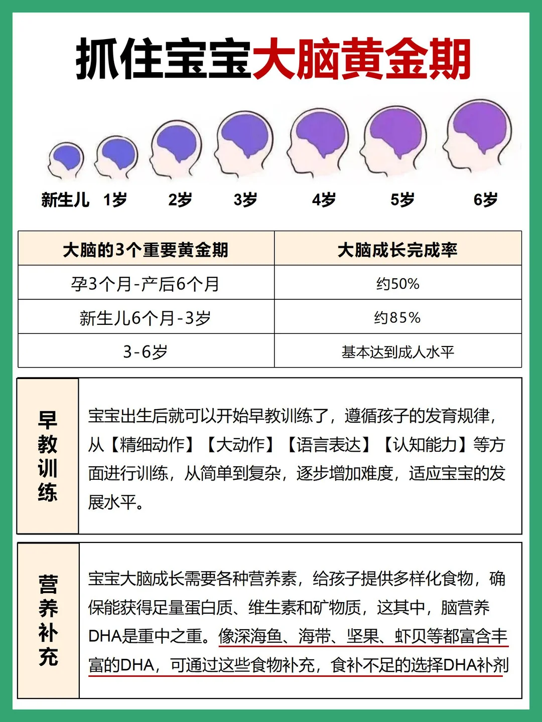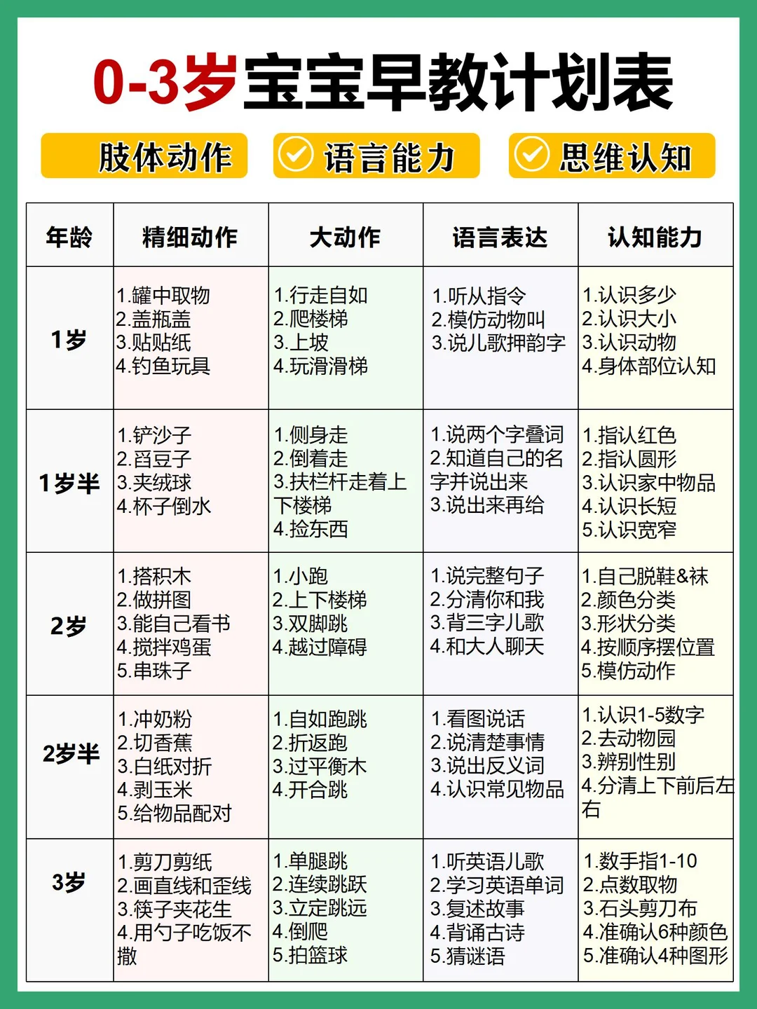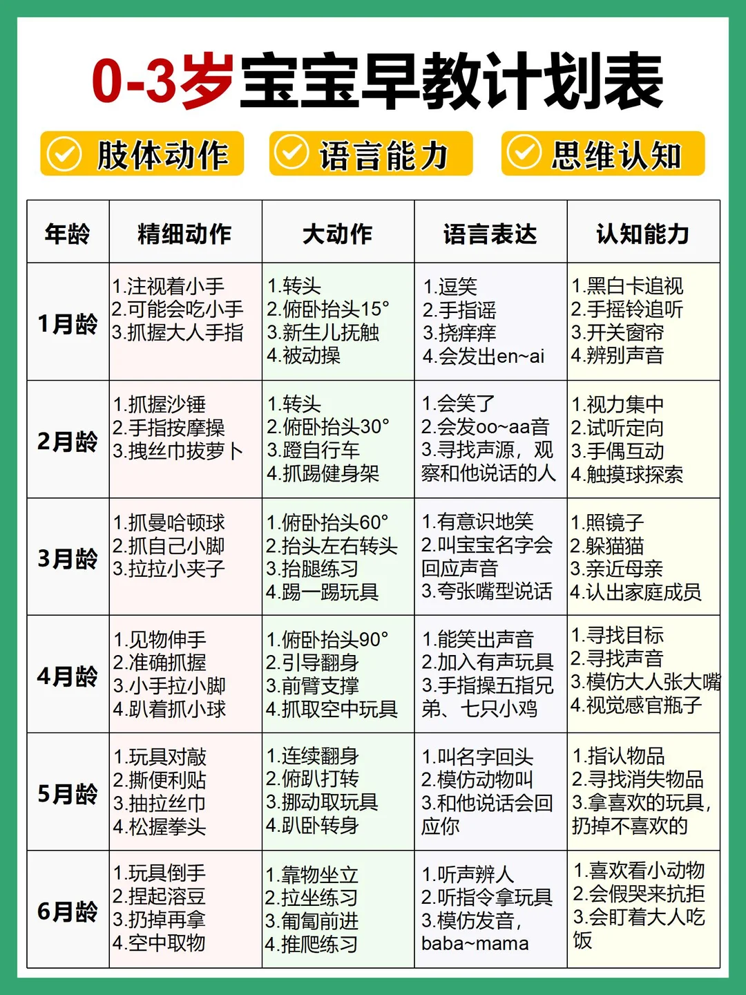 在孕妈妈肚子里,胎宝宝的大脑就已经开始发育了,出生6个月大脑完成约50%,到3岁时完成约85%。在宝宝大脑🧠发育的黄金期,早教是非常重要的,这篇精心整理了0-3岁宝宝早教计划,新手妈妈记得点五角星~