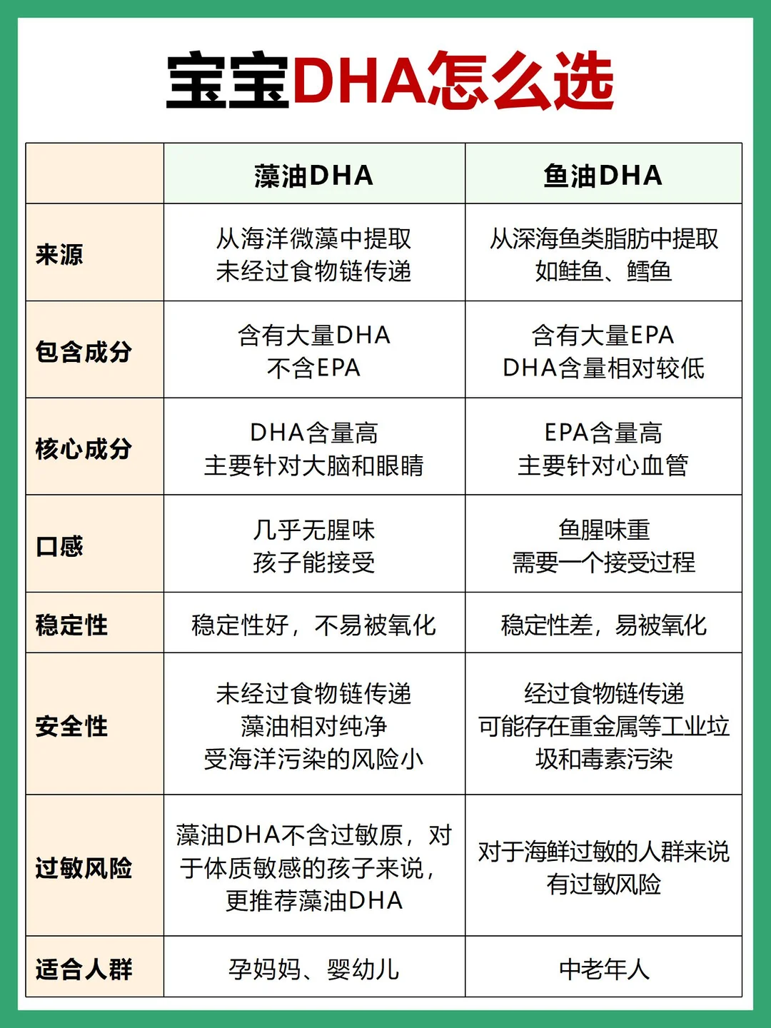 ⭕鱼油DHA:从深海鱼类🐟脂肪中提取,经过食物链传递,可能存在重金属等工业垃圾和毒素污染。主要成分EPA,更针对心血管,适合中老年人👵🏻👴🏻,海鲜过敏人群谨慎选择。
