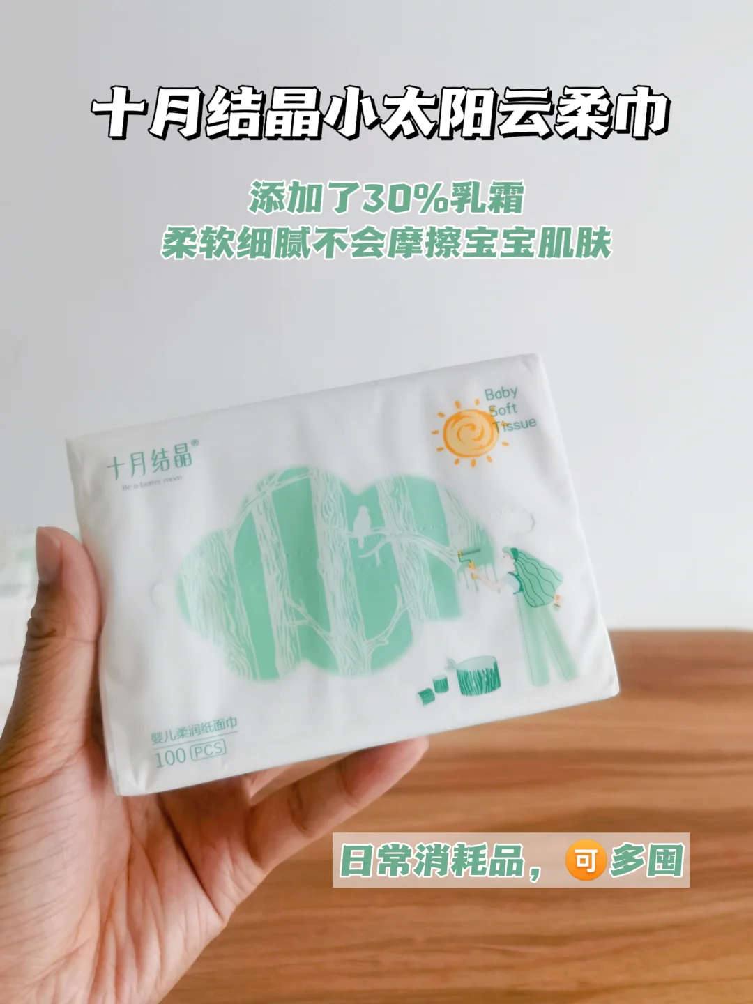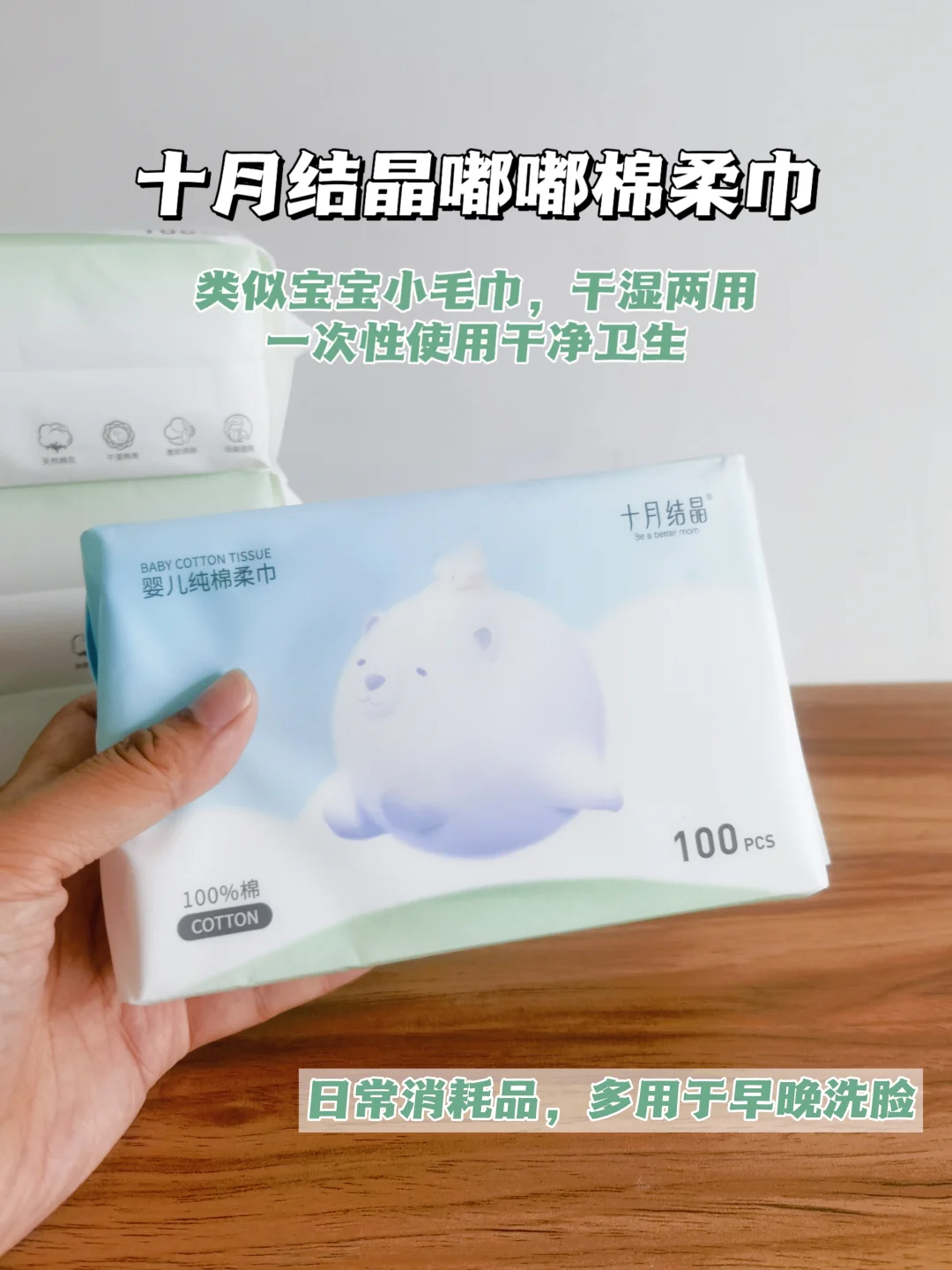 宝宝的三巾我选用的都是十月结晶家的,他家的云柔巾是原生木浆制作,30%的乳霜含量,摸起来软软的,特别柔润、细腻;棉柔巾100%棉,双面都是细腻平纹,不会摩擦宝宝娇嫩皮肤;最值得夸赞的是他家的湿巾了,无敏配方,宝宝的口👄、眼👀、鼻👃🏻都能擦,敏感肌也可以用哟~