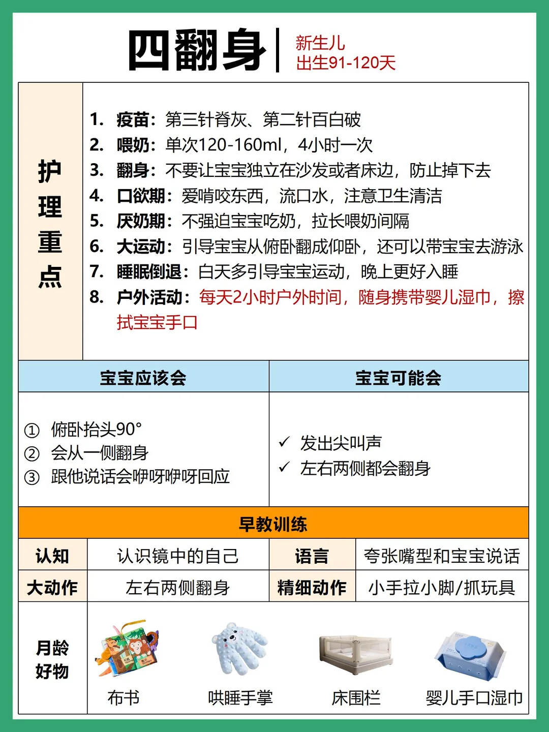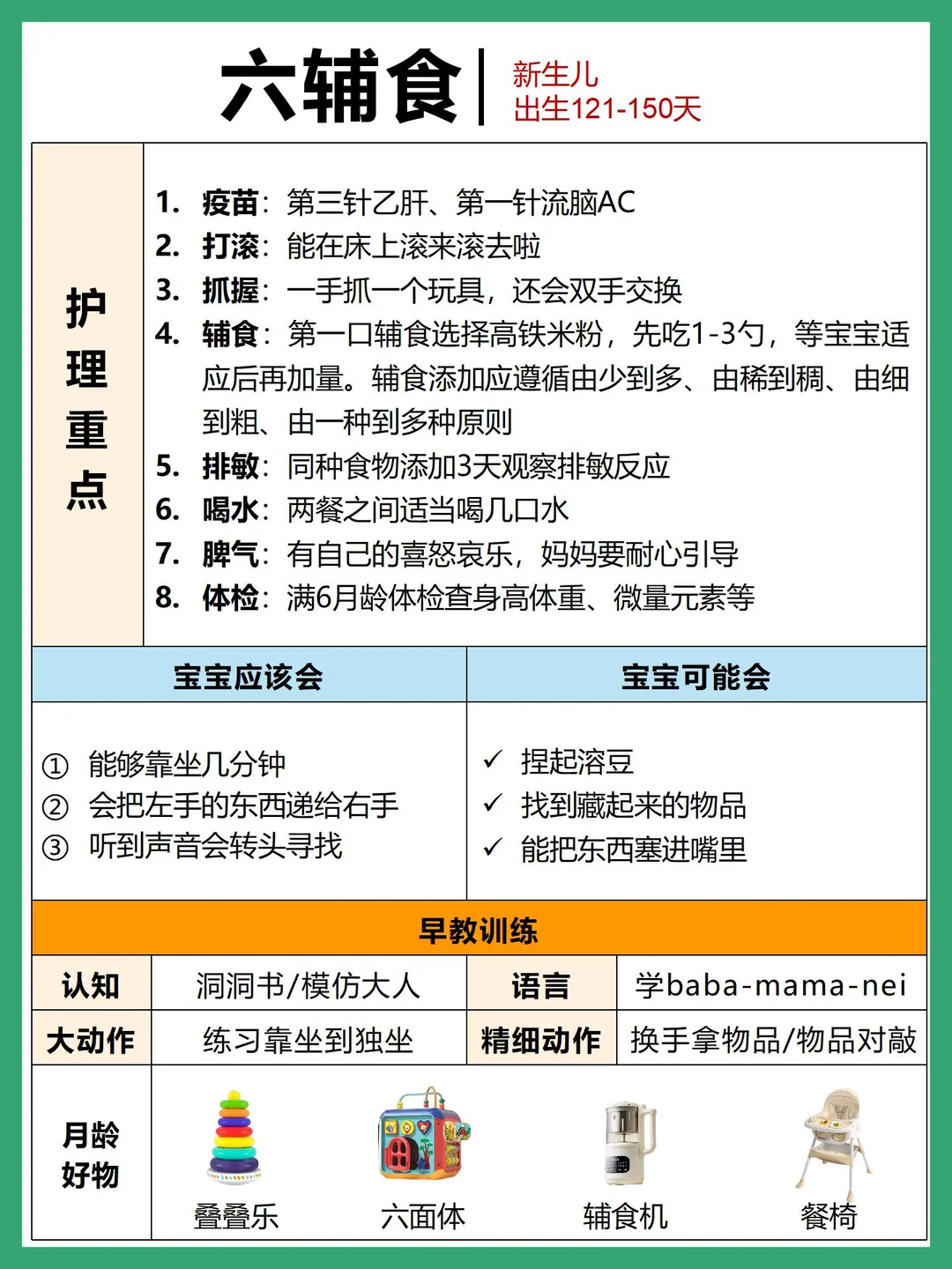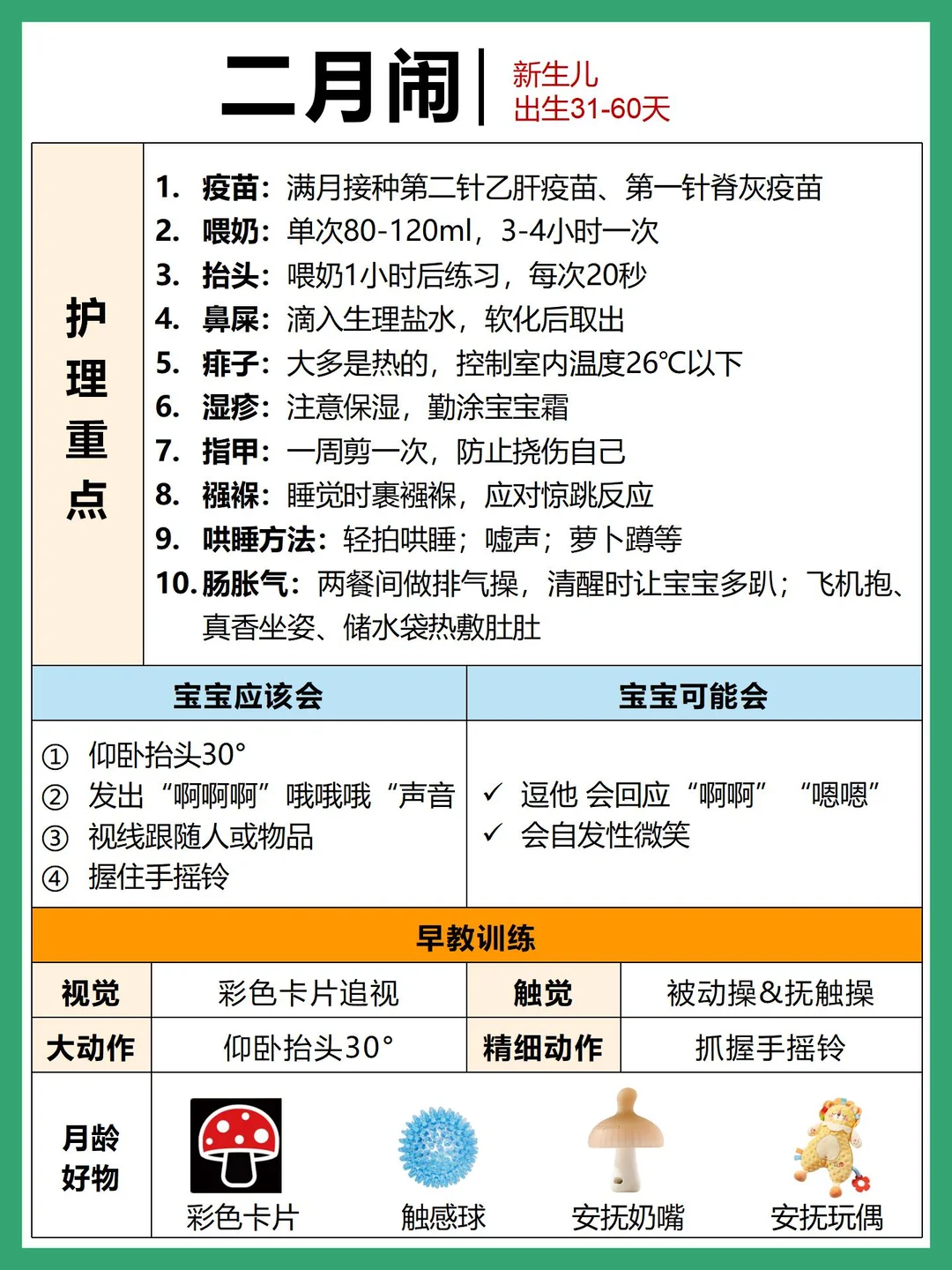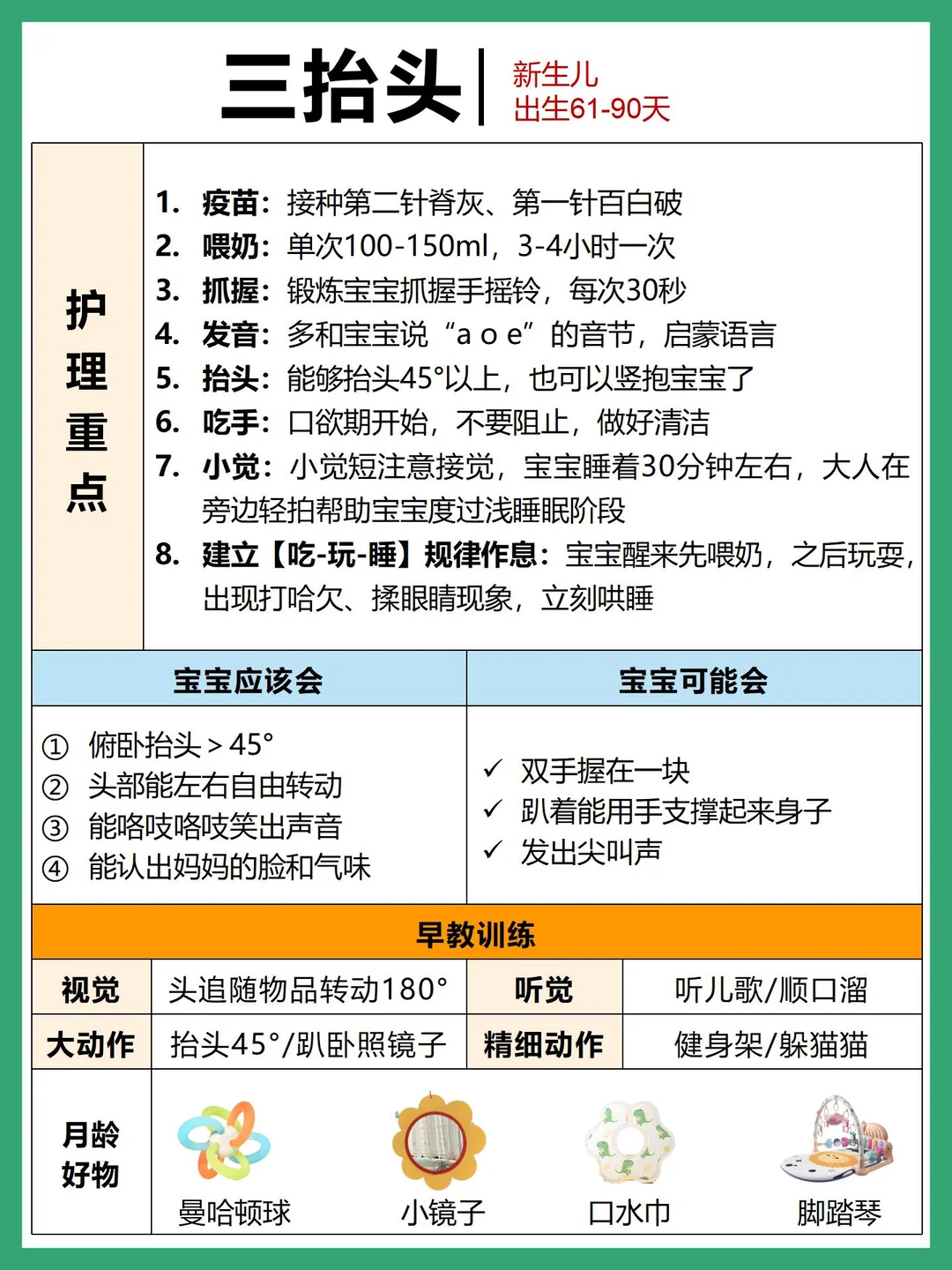 看了网上很多攻略,发现成长口诀和孩子月龄对不上,主要是月龄划分的问题~这篇根据自己的实际带娃经验,熬夜整理了0-6个月新生儿护理重点➕发育进程➕早教护理,有明确标识新生儿各个阶段时间线,新手爸妈👩🏻照着这份对照看哟`