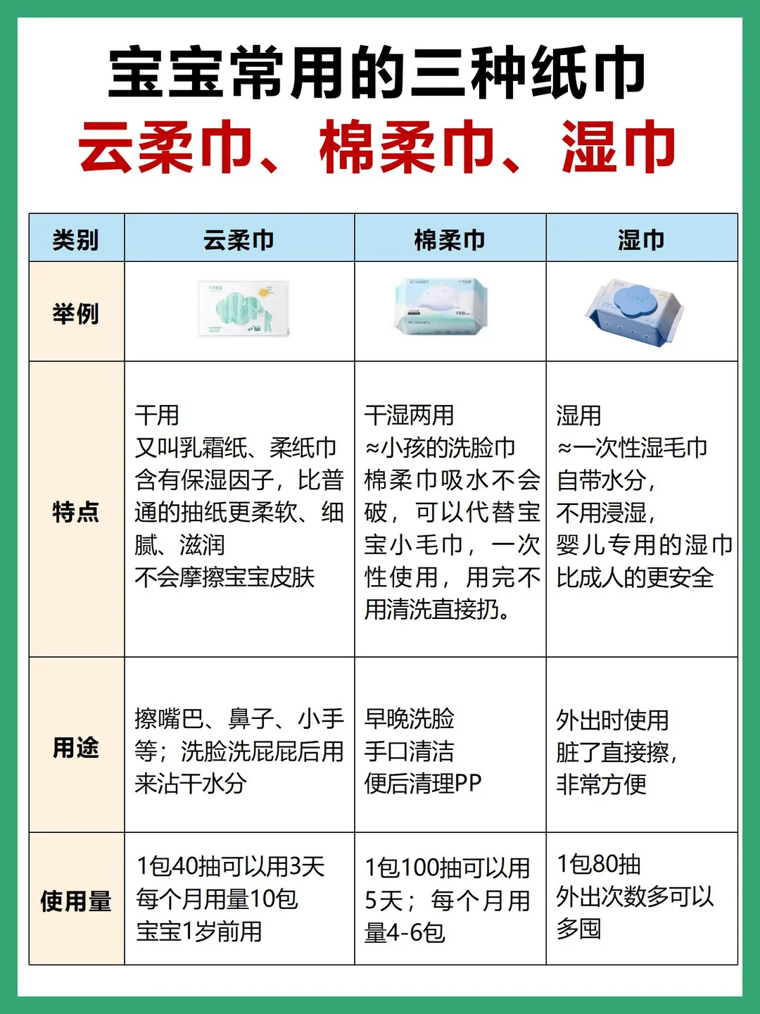 这里也根据新生儿出生的各个月份,罗列了一些月龄好物。在0-6个月中,新生儿最常用的就是云柔巾、棉柔巾、湿纸巾,很多新手妈妈可能分不清,其实区别还是蛮大的