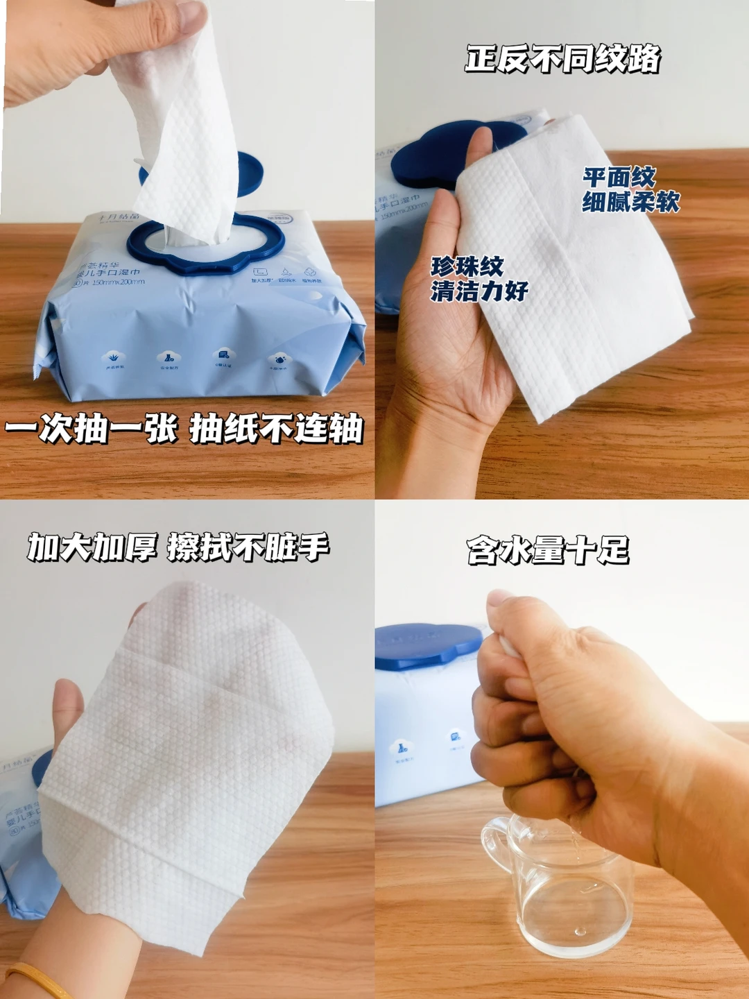 使用时也很方便,直接抽出来,一抽一张不会连抽,设计还是蛮合理的‼️我每次给宝宝做清洁一张就正好够用,加大加厚,挺耐拉扯的,不掉絮哟‼️