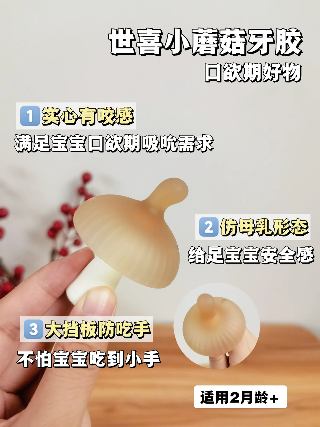 我家宝的第一只牙胶是世喜小蘑菇安抚牙胶🍄,刚给塞手里,自己就会扒拉到嘴跟前,牙胶是仿母乳设计的,大概当成麻麻👩🏻的neinei了。小蘑菇伞面能遮盖住宝宝小手,不怕宝宝咬到小手,牙胶是实心啾啾有咬感,口感Q弹,充分满足宝宝吸吮需求~