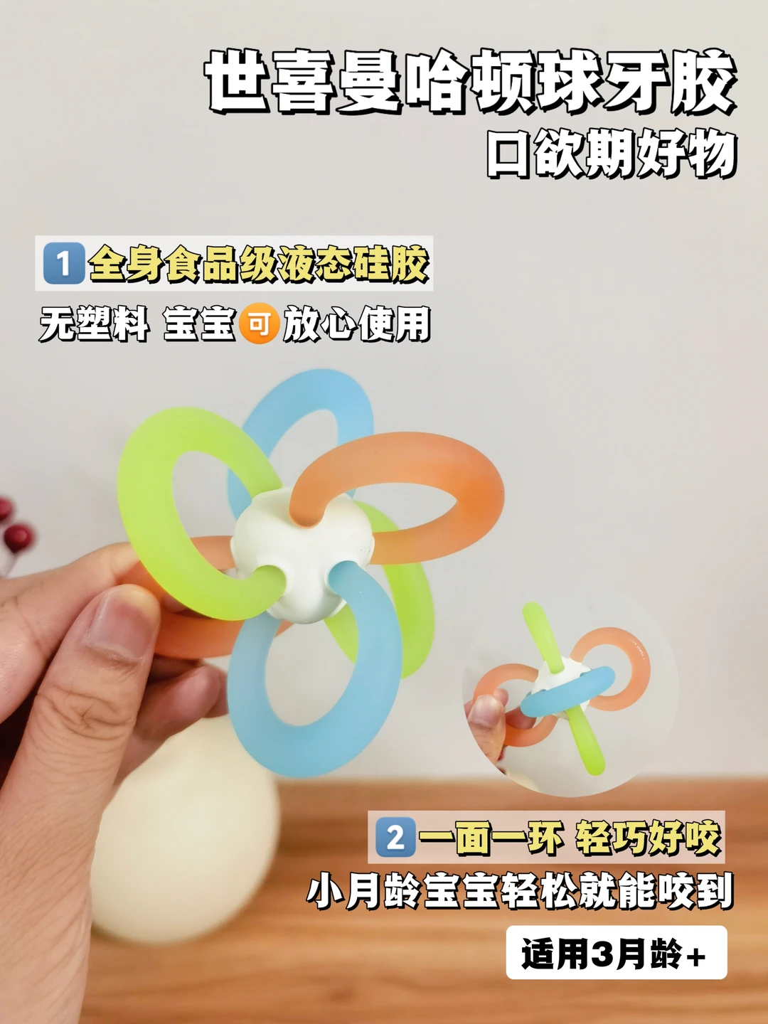我直接给入的是世喜曼哈顿牙胶球,食品级液态硅胶材质,入口很安全~既能锻炼抓握,又好啃咬,性价比⭐⭐⭐⭐⭐