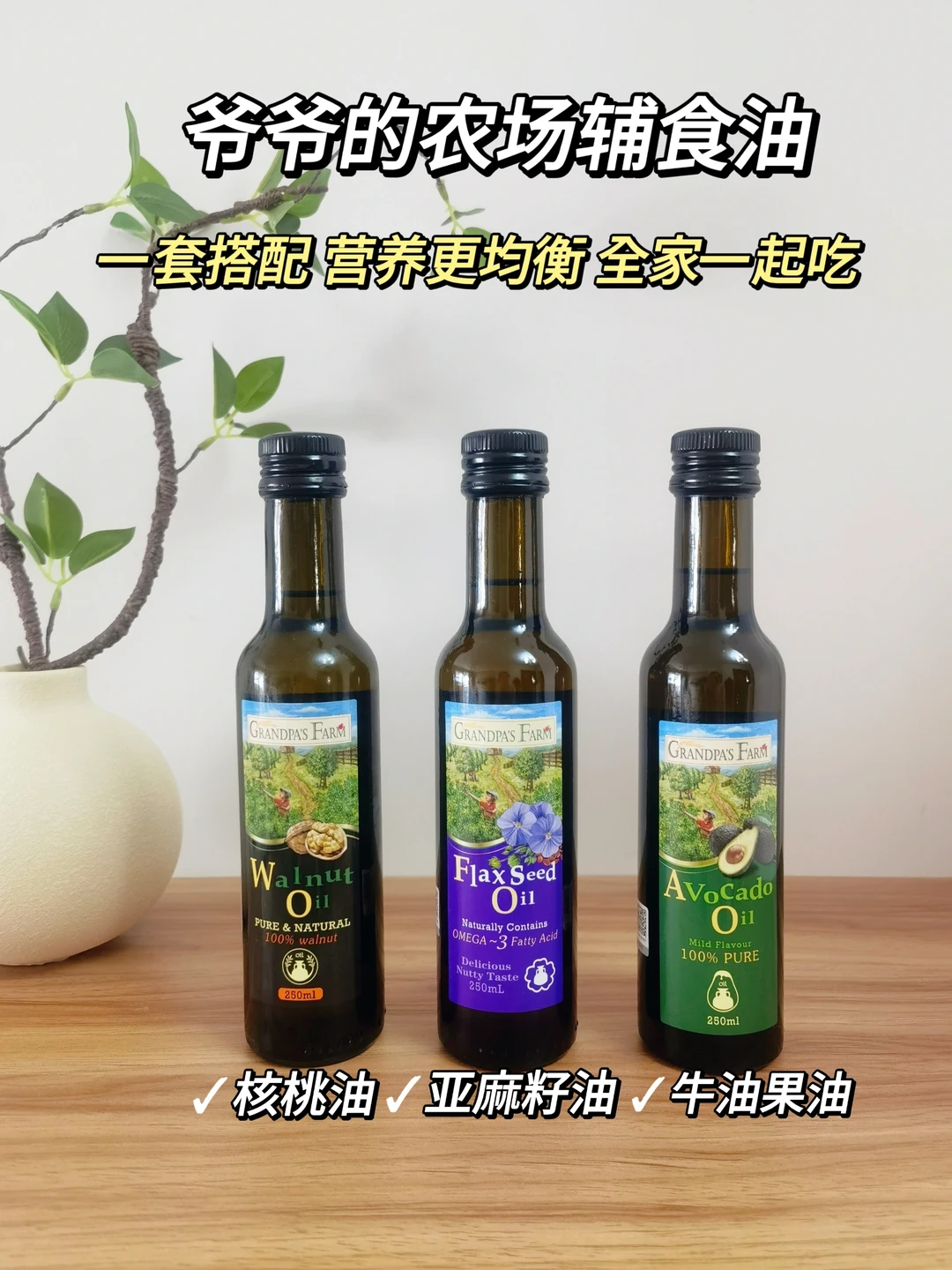 像我家直接入手了爷爷的农场辅食油三件套,它家辅食油采用的是低温冷榨工艺,棕色玻璃瓶身,还配了伸缩油嘴,用起来很方便~一套搞定冷热两次,全家👨👨👧都可以一起吃,性价比之选~