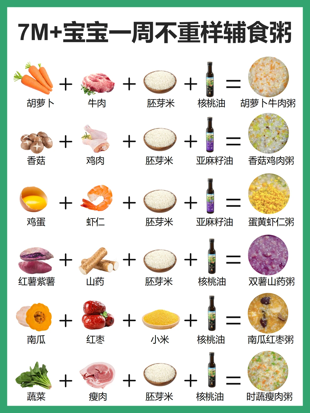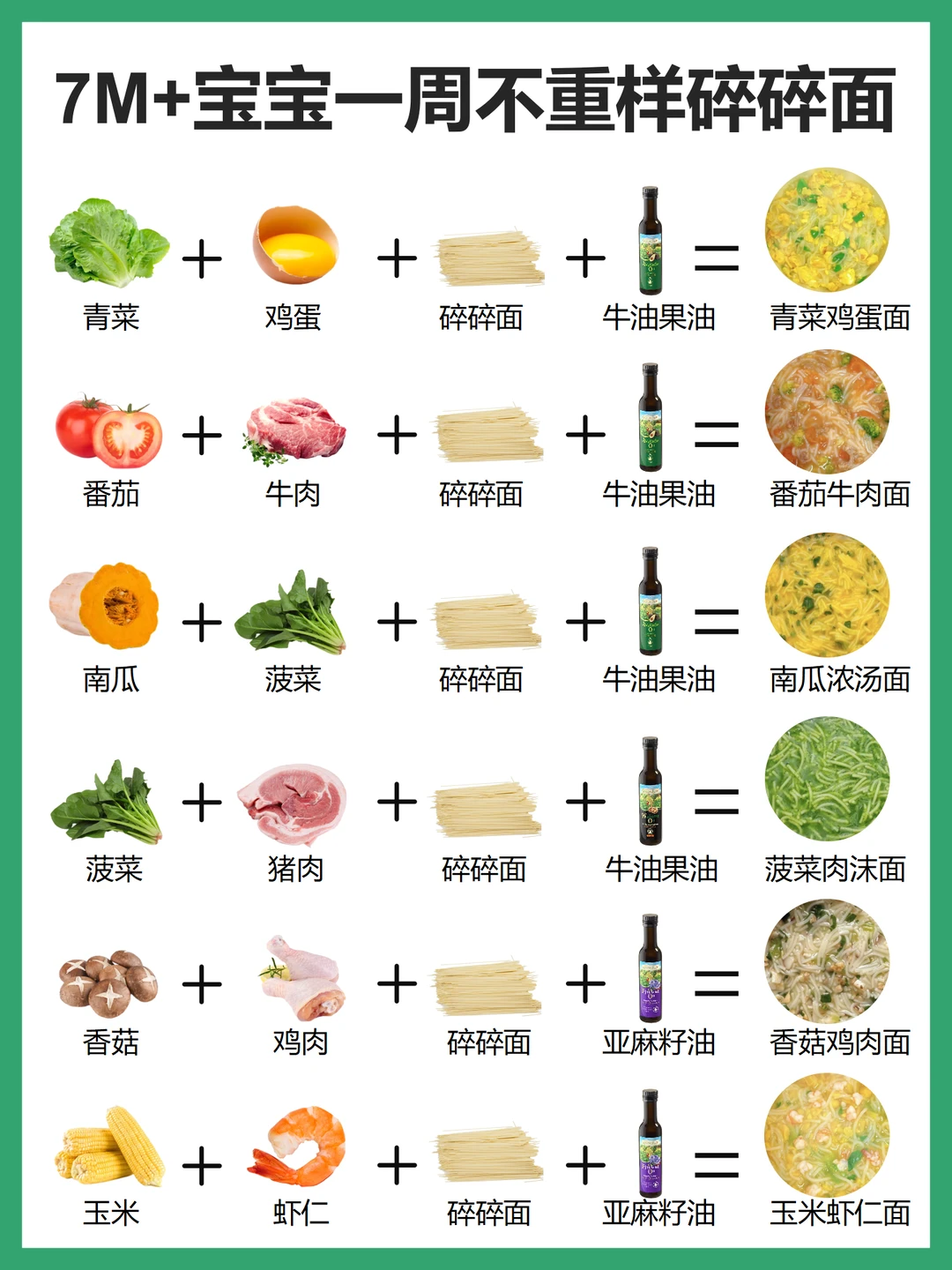 都说宝宝进入7月龄后,要开始丰富辅食食材,那么,每种食材怎么搭配宝宝更爱吃?本篇整理了一周不重样辅食泥、碎碎面、辅食粥食谱,简单易上手~