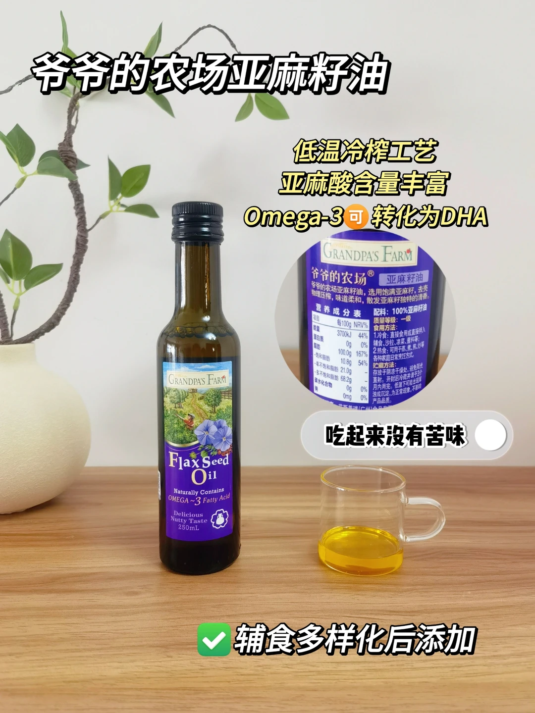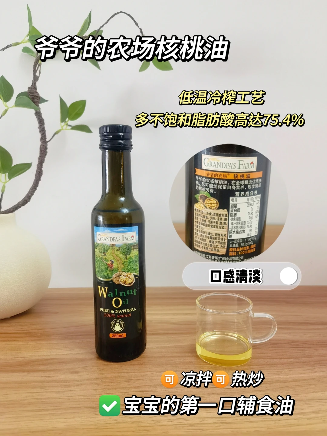 爷爷的农场核桃油多不饱和脂肪酸高达75.4%,Omega-6:Omega-3 黄金营养配比5:1,口感清淡,非常适合宝宝初添加,除了凉拌,低温热炒也可以~