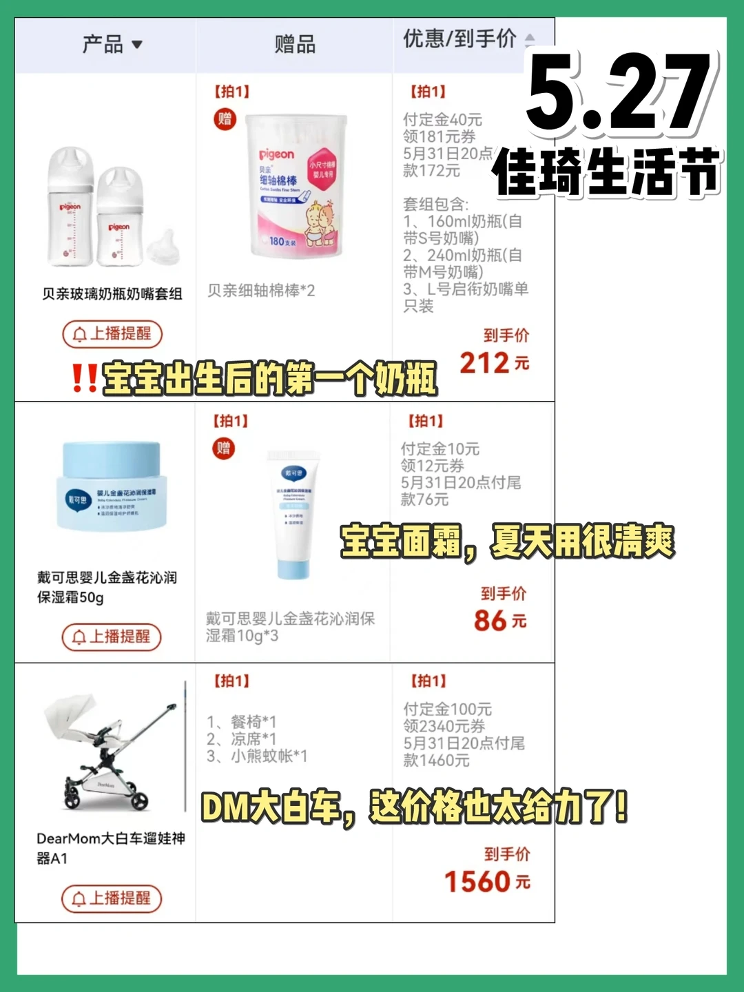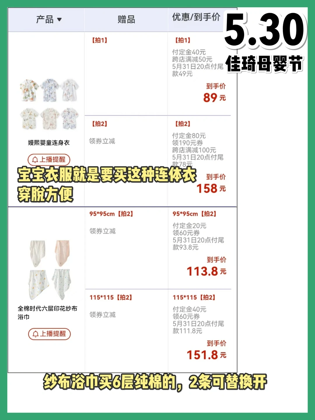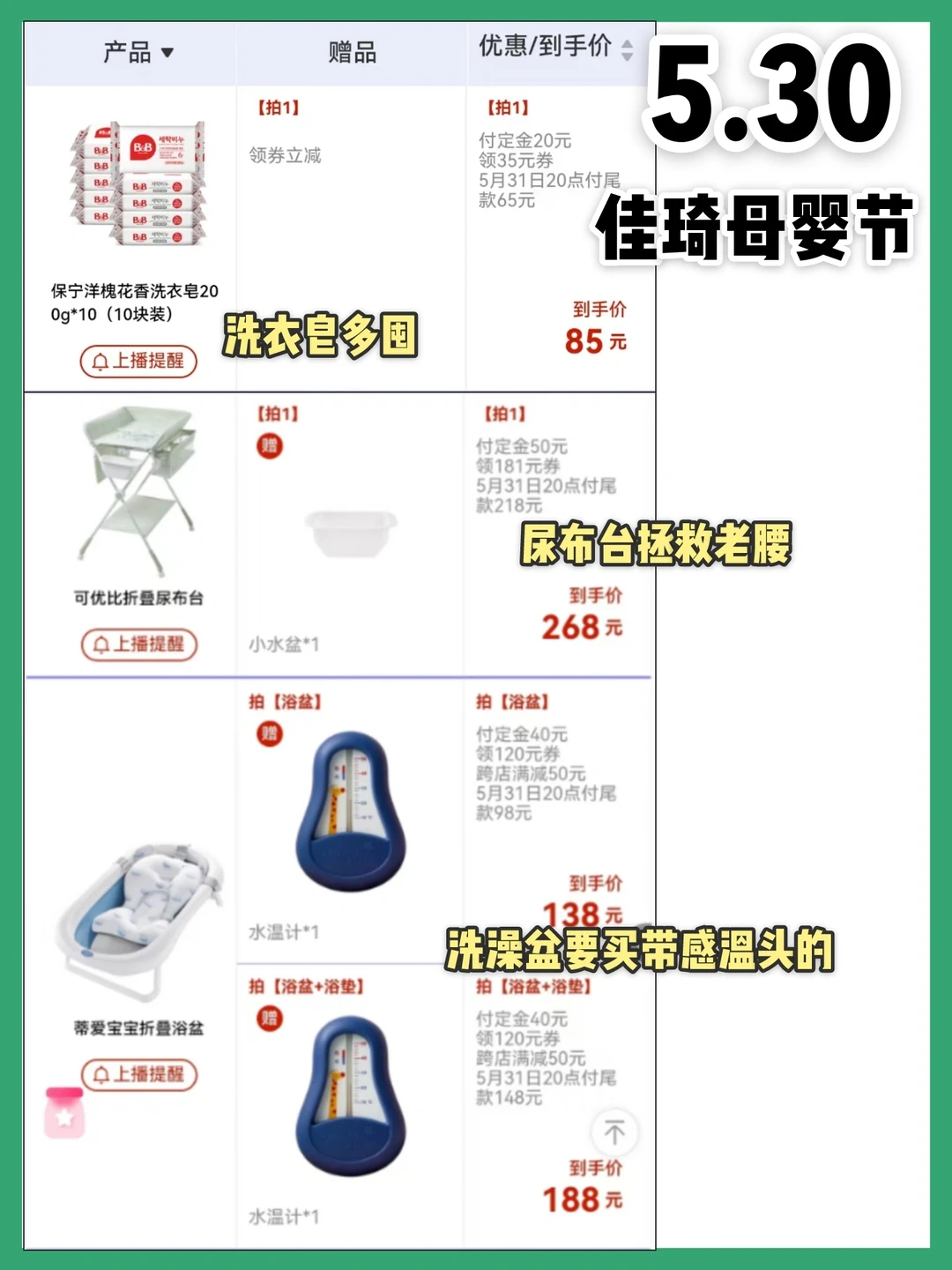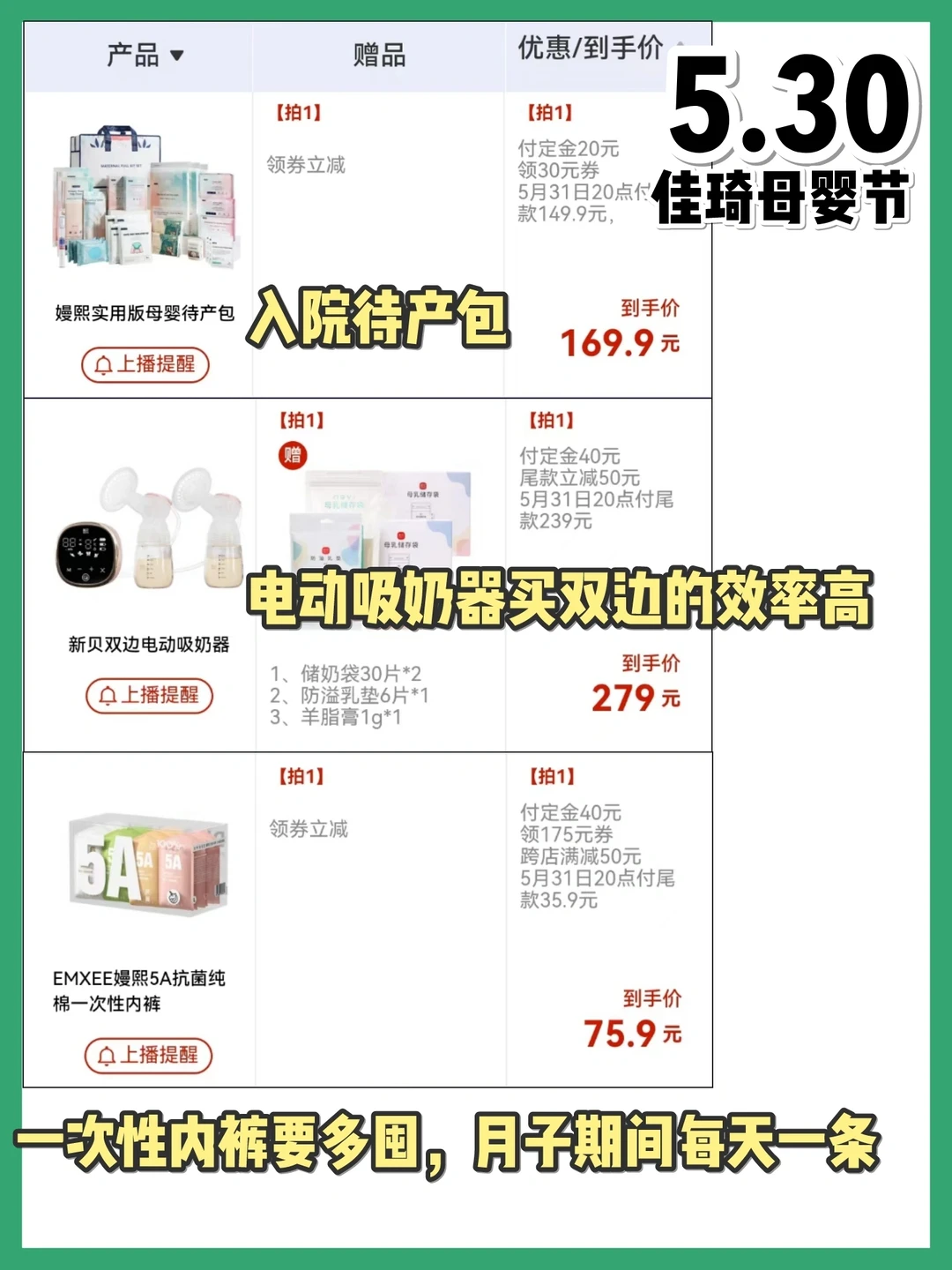 📣618李佳琦母婴清单来啦 📣超低价时间点 5月26日:预售第一天,最划算 5月27日:生活节直播有好价 5月30日:母婴节直播有好价 6月1日:活动第一天,力度最大 预产期6月-10月的孕妈妈们快冲,图2-4整理了母婴待产囤货清单,图5-10列了母婴用品的活动价格 🔥详细攻略都放在图中啦🔥 孕妈妈们快冲